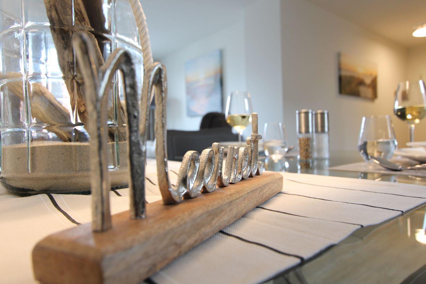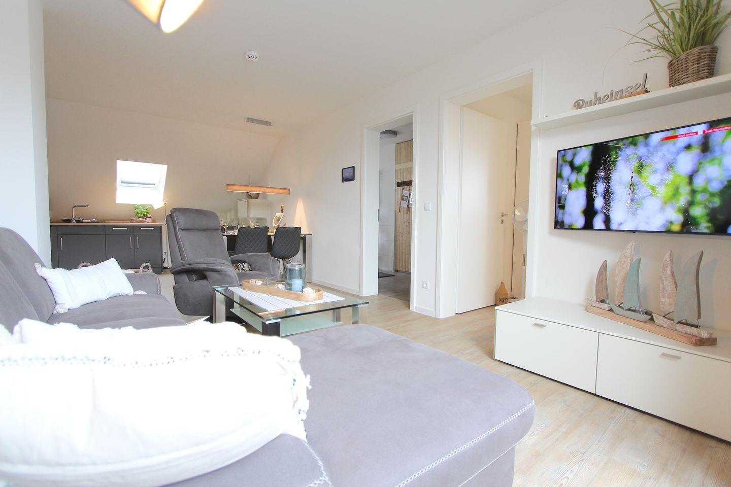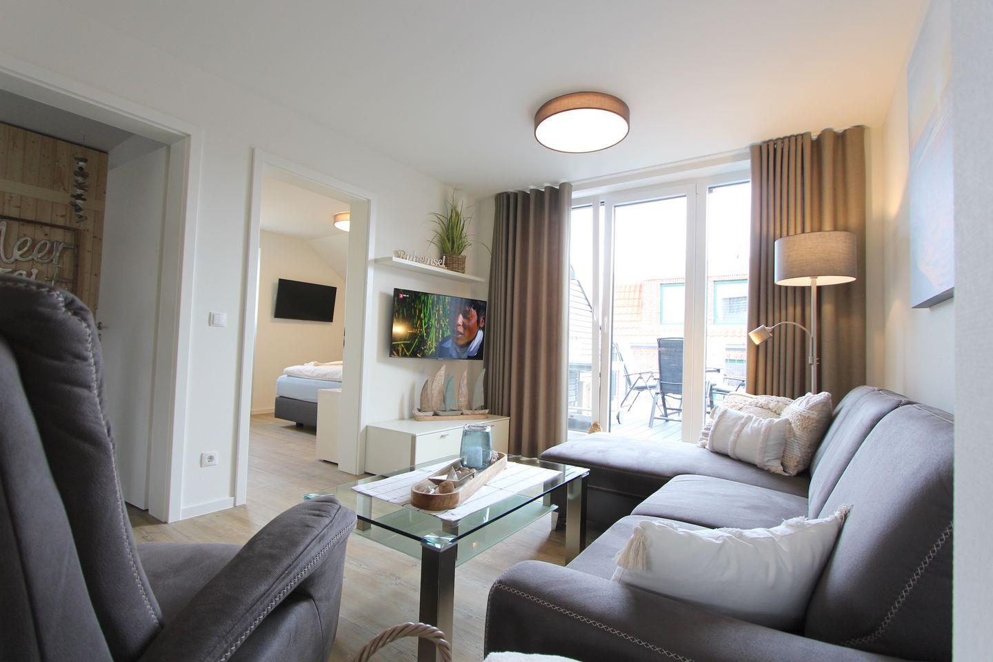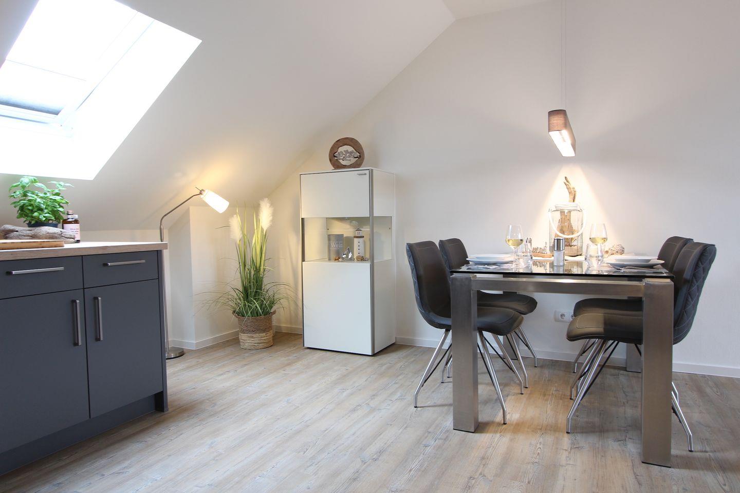Diese in 2022 gebaute ca. 68 qm große und modern eingerichtete Ferienwohnung im 2. OG ist bequem mit dem Aufzug zu erreichen. Der kombinierte Wohn- und Essbereich, überzeugt durch eine stilvolle Einrichtung und bietet Platz für 2 Personen. Im Wohnbereich erwartet Sie ein bequemes Sofa, ein Fernsehsessel sowie ein Smart-TV-Flachbildfernseher. Das Zubereiten der Mahlzeiten wird Ihnen in der offenen, gut ausgestatteten Küche sicherlich Freude bereiten. Ihnen stehen Annehmlichkeiten wie z. B. ein Backofen, ein Kühlschrank, ein Geschirrspüler sowie eine Kaffeemaschine zur Verfügung.