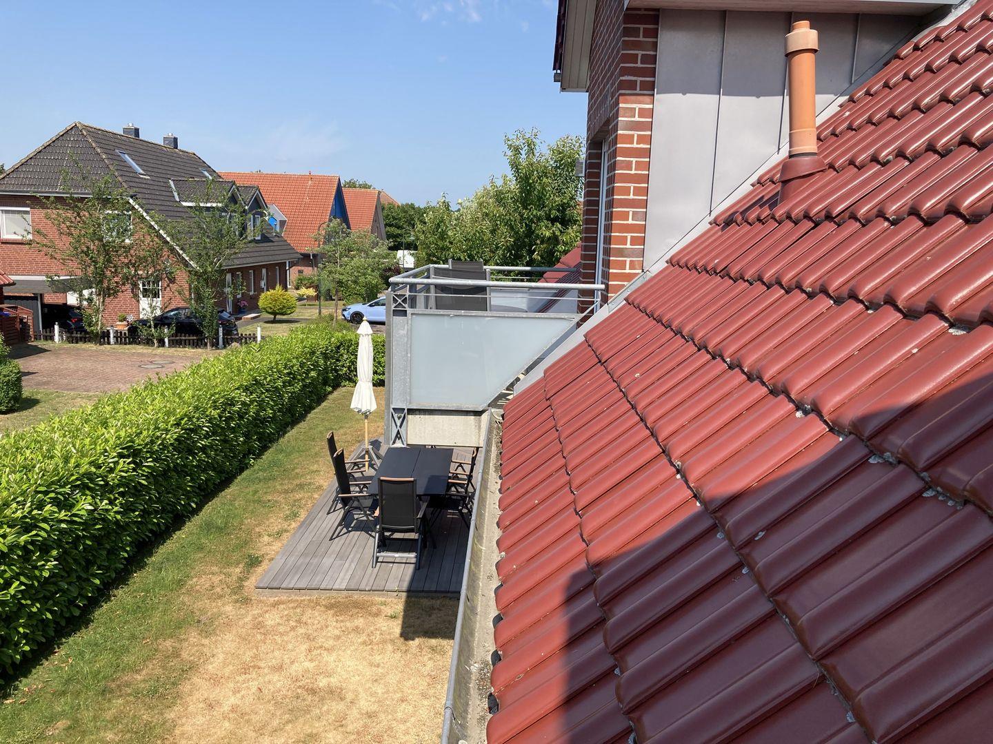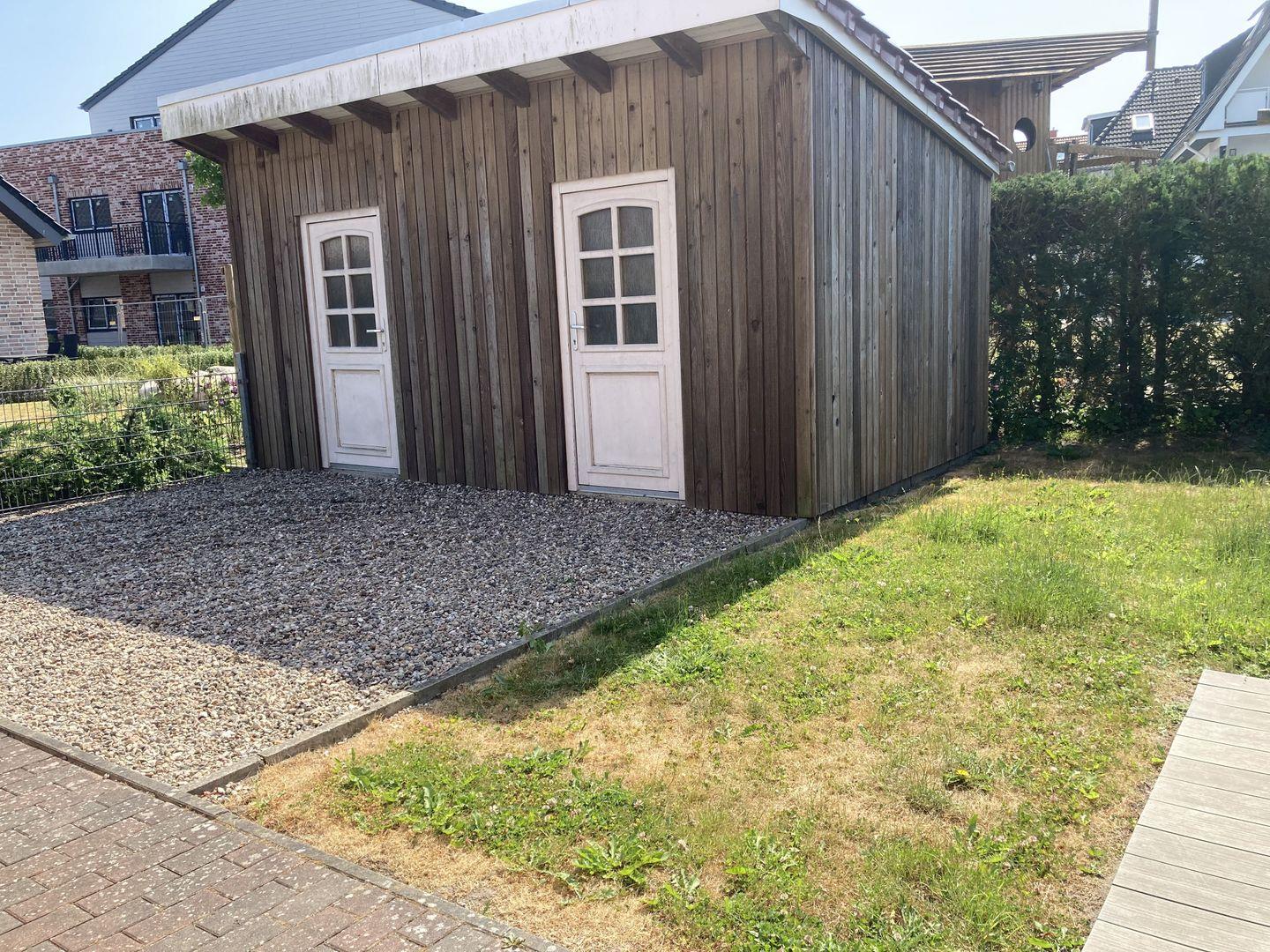 - direkter Zugang vom Wohnbereich zur möblierten Terrasse (Strandkorb, Sonnenschirm, Tisch und Stühle) und Garten