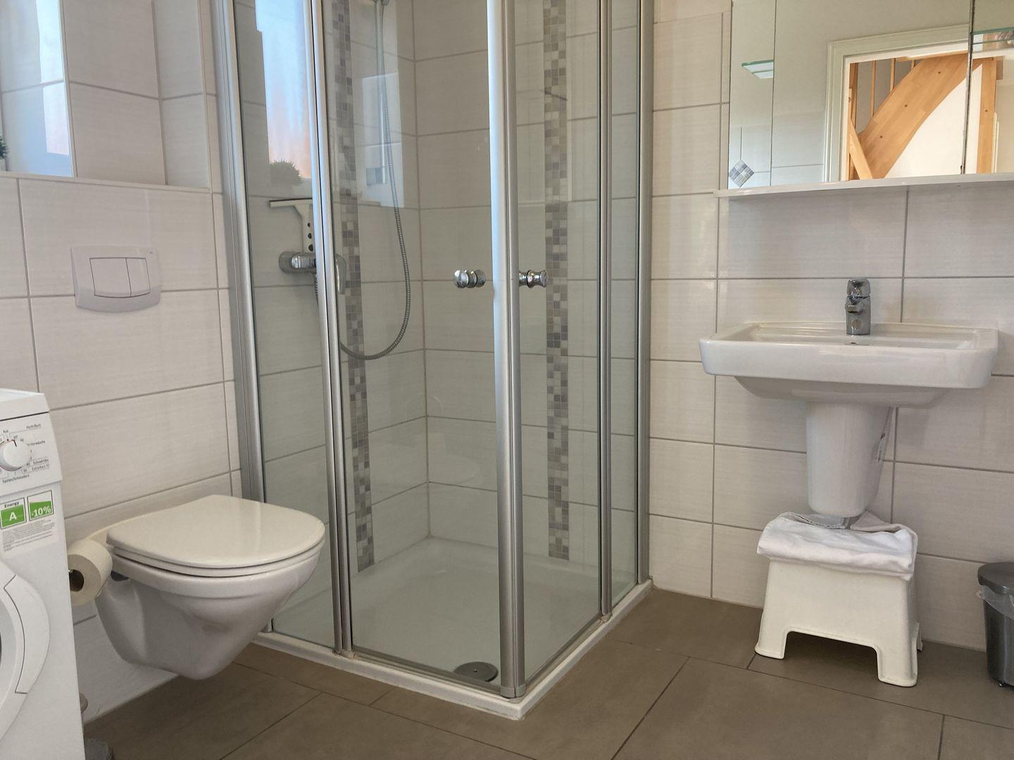- Badezimmer mit Dusche, WC und Waschmaschine