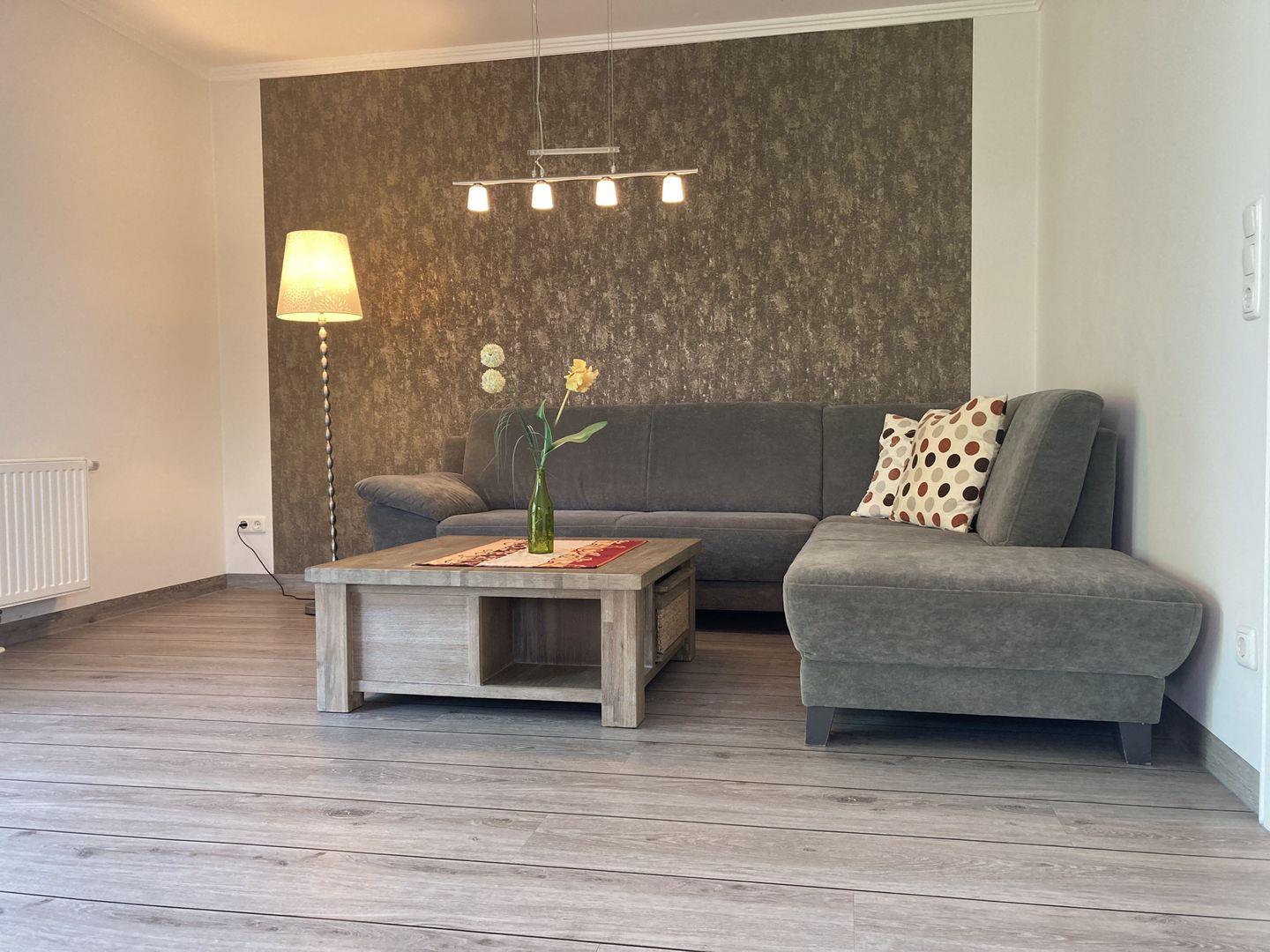 - Wohnzimmer mit gemütlicher Couchecke und großem Esstisch mit Essplatz für 6 Personen