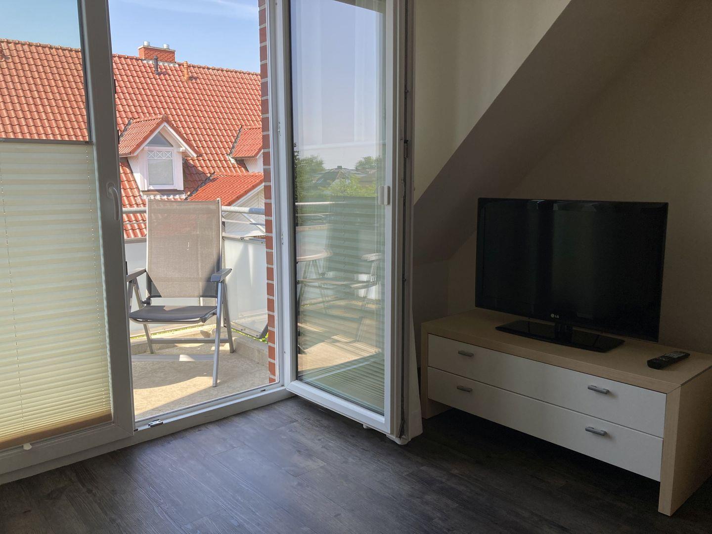 - Schlafraum mit Doppelbett (2 Matratzen á, 100 x 200 cm), Kleiderschrank TV und französischem Balkon