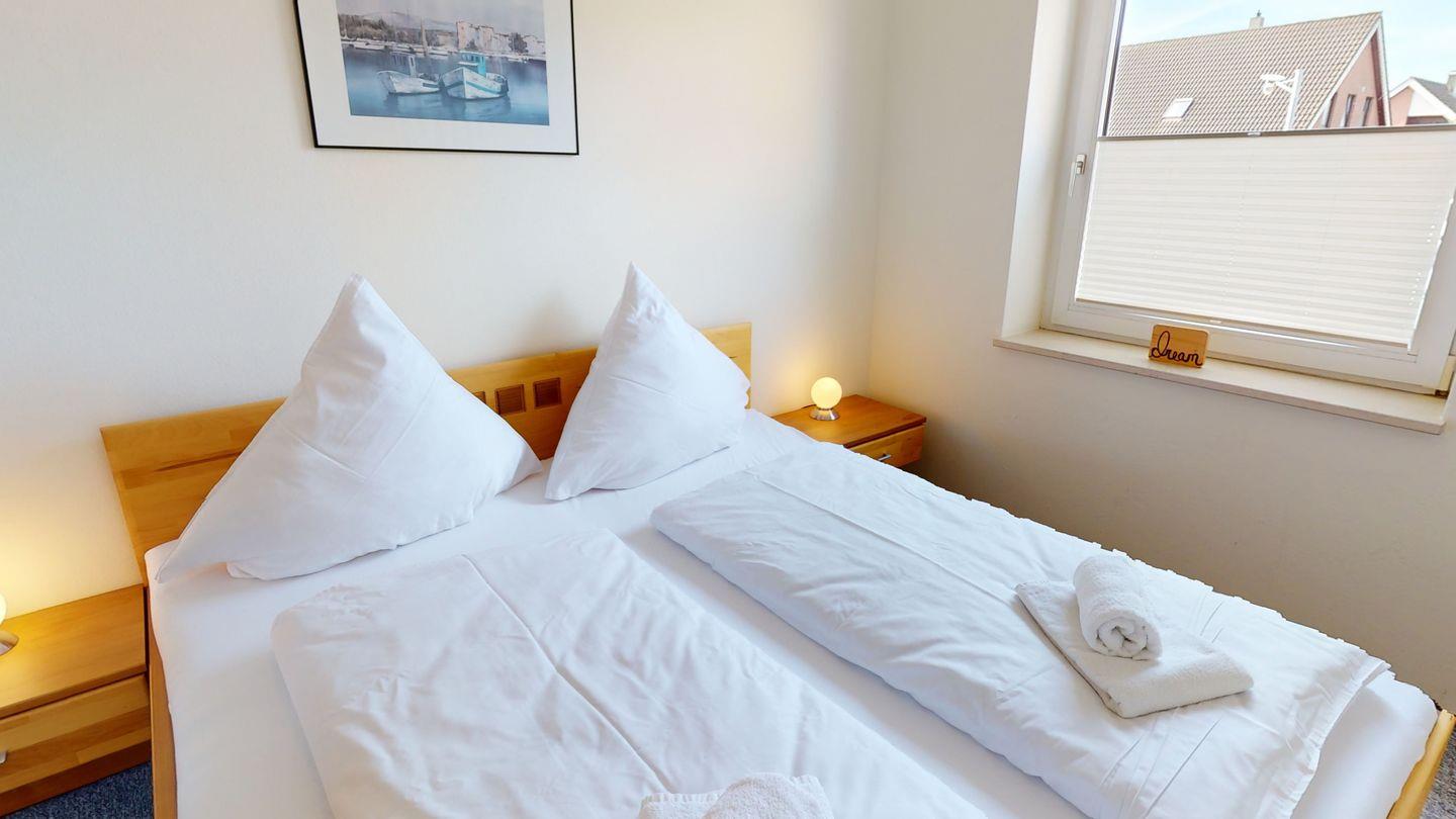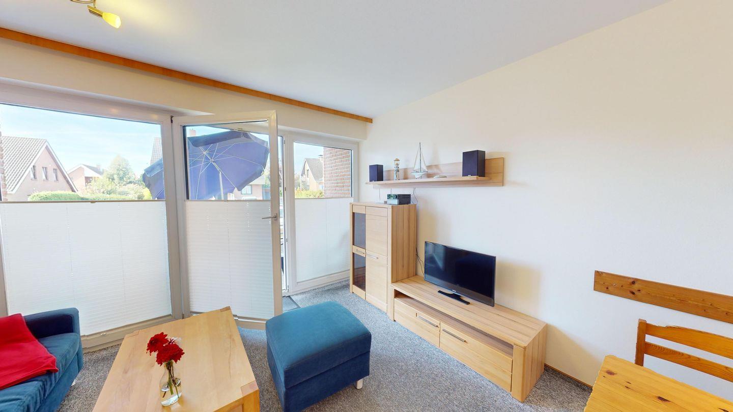 Die Wohnung ist über wenige Stufen zu erreichen und besteht aus einem Wohn-/Esszimmer, 2 Schlafzimmern (eins mit Doppelbett, eins mit zwei Einzelbetten), einer Küche und einem Duschbad. In der Wohnung gibt es eine Fußbodenheizung.