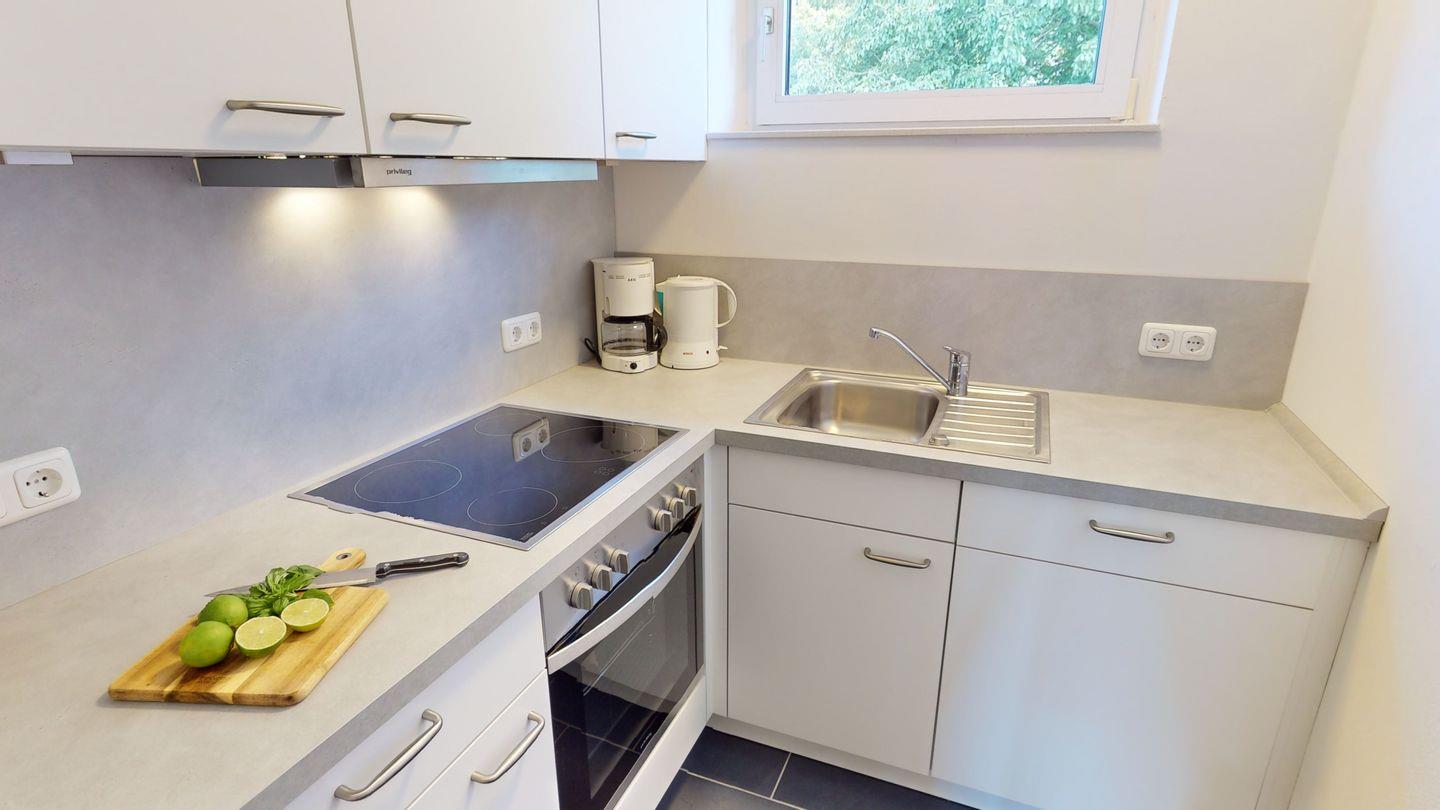Die Wohnung ist geeignet für 4 Personen und besteht aus einem kombinierten Wohn-/Esszimmer, 2 Schlafzimmern (eins mit Doppelbett, eins mit zwei Einzelbetten), einer Küche, einem Duschbad und Fußbodenheizung. Die Küche hat einen Geschirrspüler.