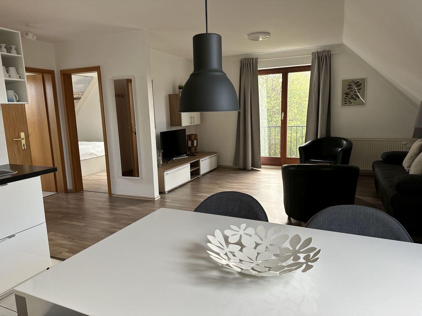 - Wohn-, Esszimmer mit Schlafcouch (160 x 200 cm) und TV