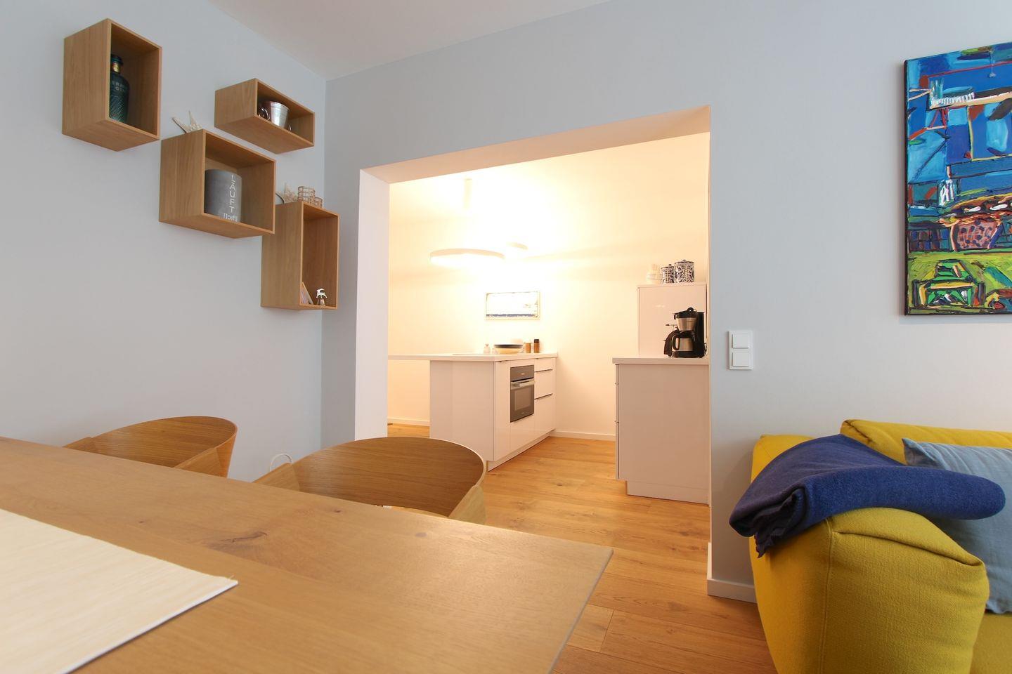 Die moderne Küche verfügt über einen Induktionsherd, Backofen mit integrierter Mikrowelle, Geschirrspüler, Kühl- Gefrierkombination, Kaffeemaschine, Toaster, Wasserkocher, Stabmixer, Handrührgerät und allen Kleinigkeiten die man braucht, um (wenn Sie wollen) zu Kochen wie zu Hause.
