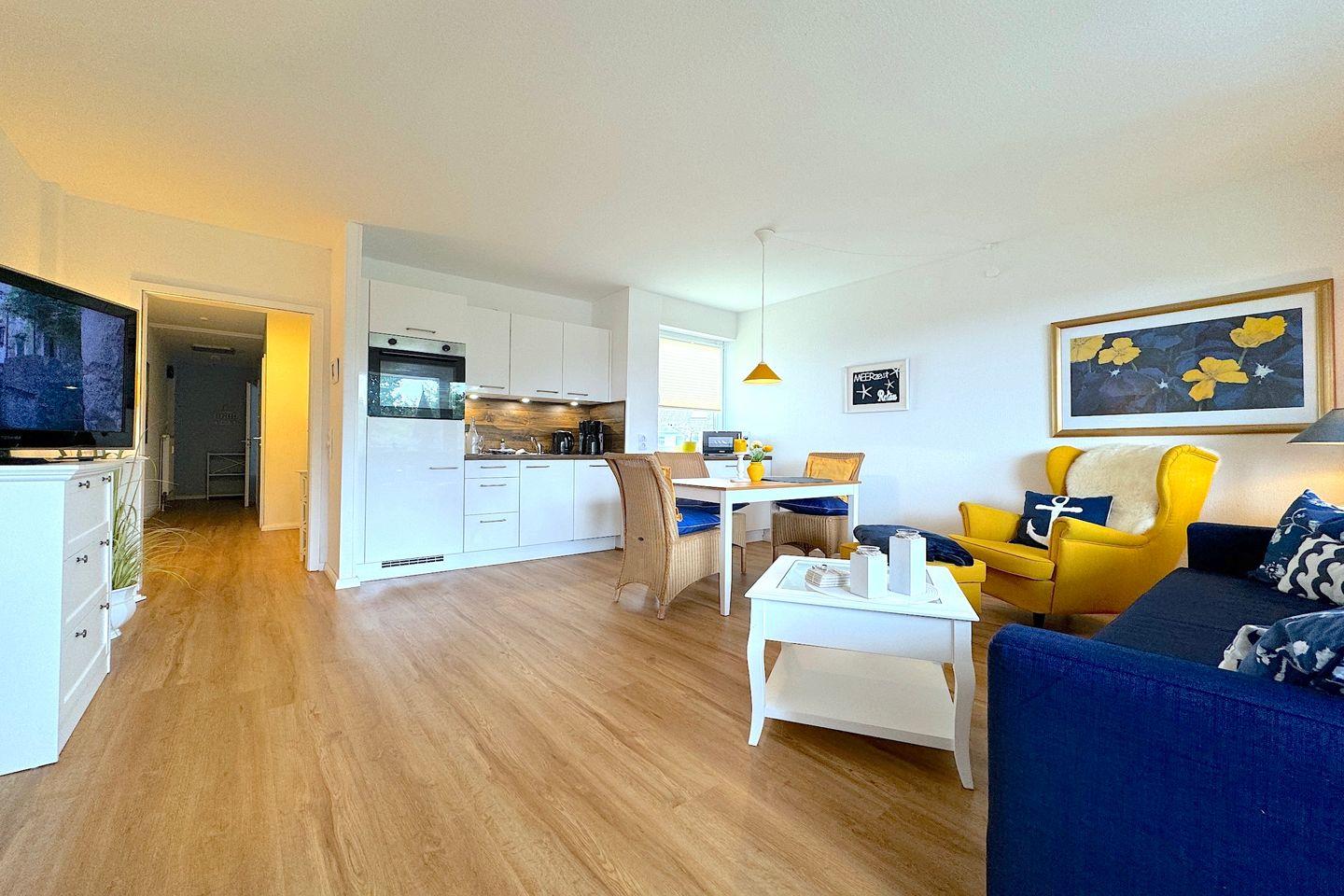 Diese moderne 50 qm große Ferienwohnung im 1. Stock bietet idealen Komfort für 2 Personen und lädt zu einem entspannten Urlaub an der Küste ein. Die Unterkunft verfügt über ein gemütliches Schlafzimmer, ein helles Wohnzimmer mit einer modernen Küchenzeile sowie einen Balkon, auf dem Sie die frische Seeluft genießen können.