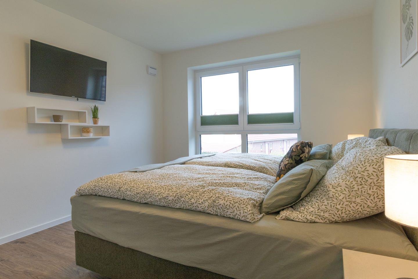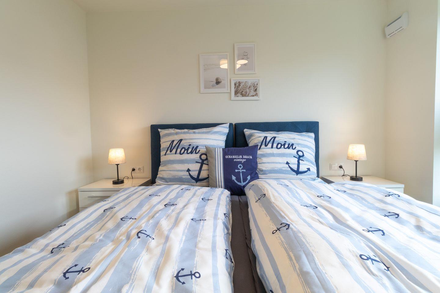Im ersten Schlafzimmer schläfst du in einem großzügigen Doppel-Boxspringbett. Das zweite Schlafzimmer bietet zwei Einzelbetten (zusammenstellbar) sowie einen Schreibtisch – ideal für Kinder oder als Homeoffice-Ecke. Beide Zimmer sind mit TV ausgestattet und lassen sich durch Plissees gut verdunkeln.