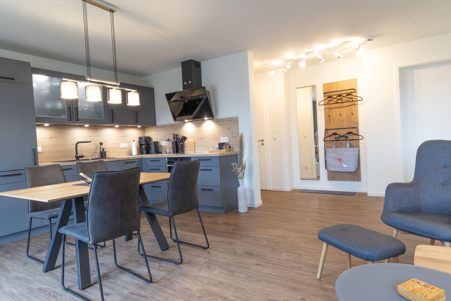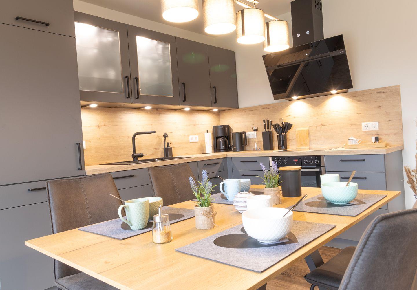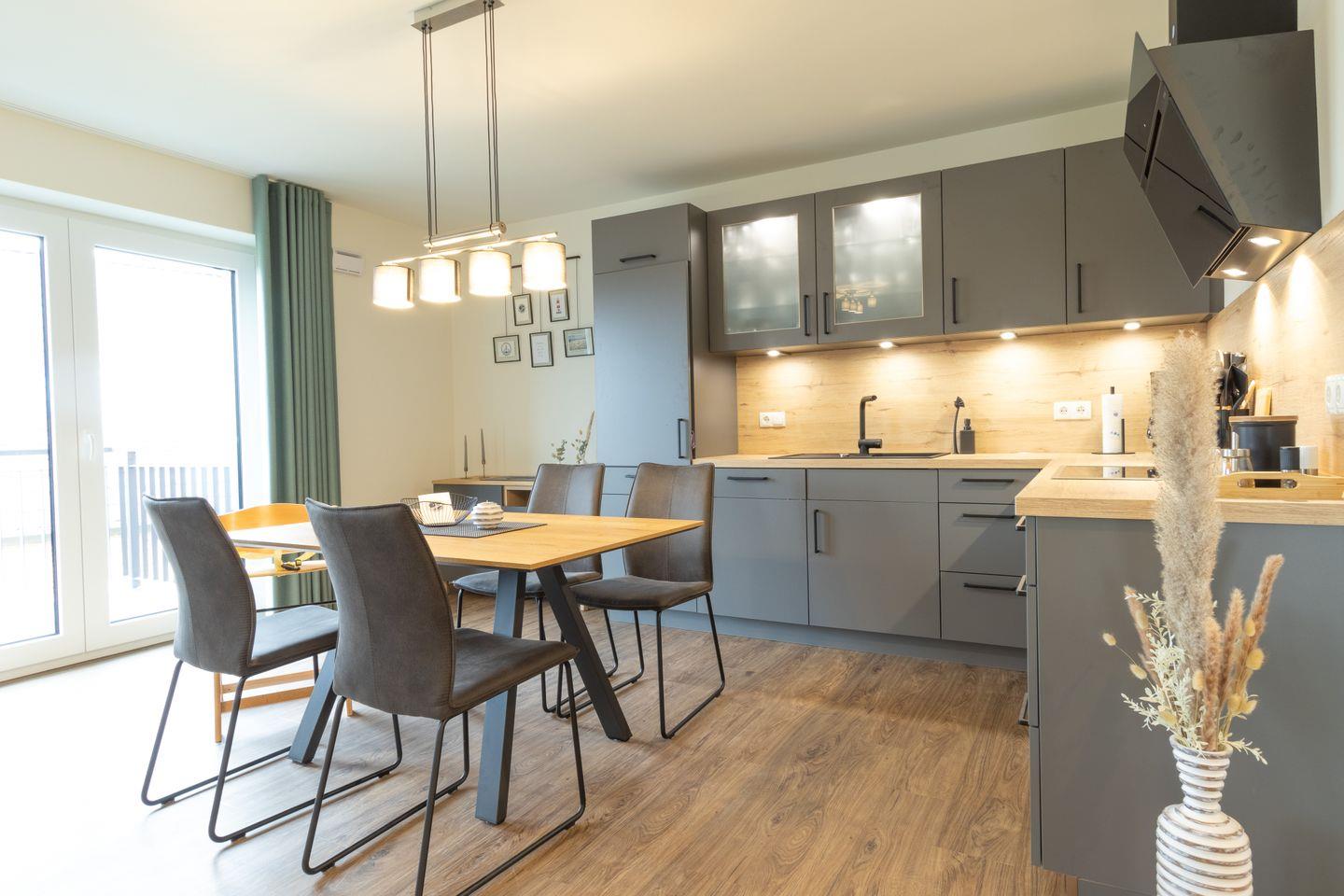 Der helle Wohnbereich überzeugt mit moderner Einrichtung, großen Fenstern und gemütlicher Atmosphäre. Viel Platz zum Verweilen, Entspannen oder gemeinsamen Spielen. Die offene Küche mit grauer Betonoptik ist voll ausgestattet und bietet alles, was du für gemeinsame Kochmomente brauchst – vom Frühstück bis zum Abendessen.