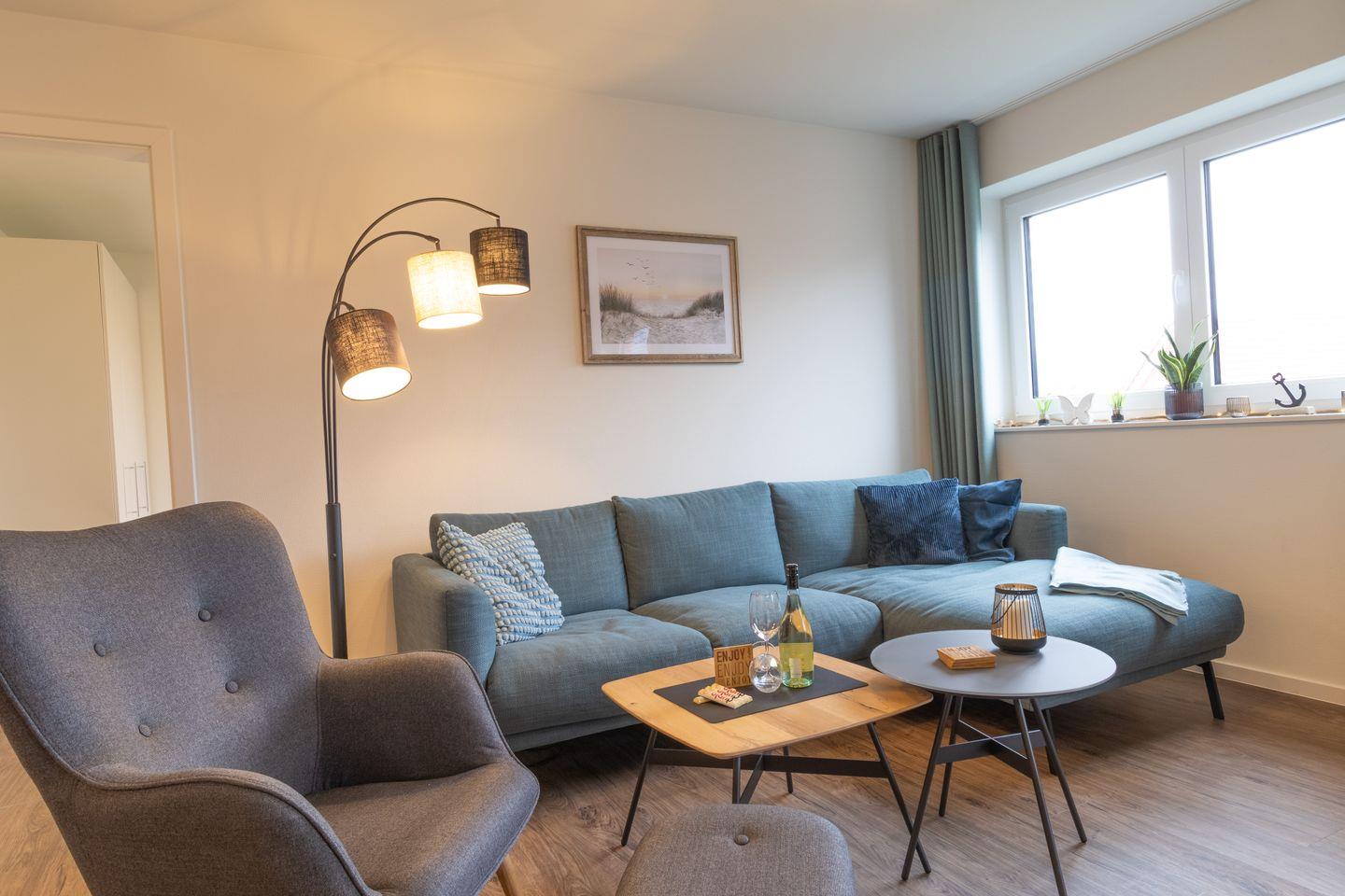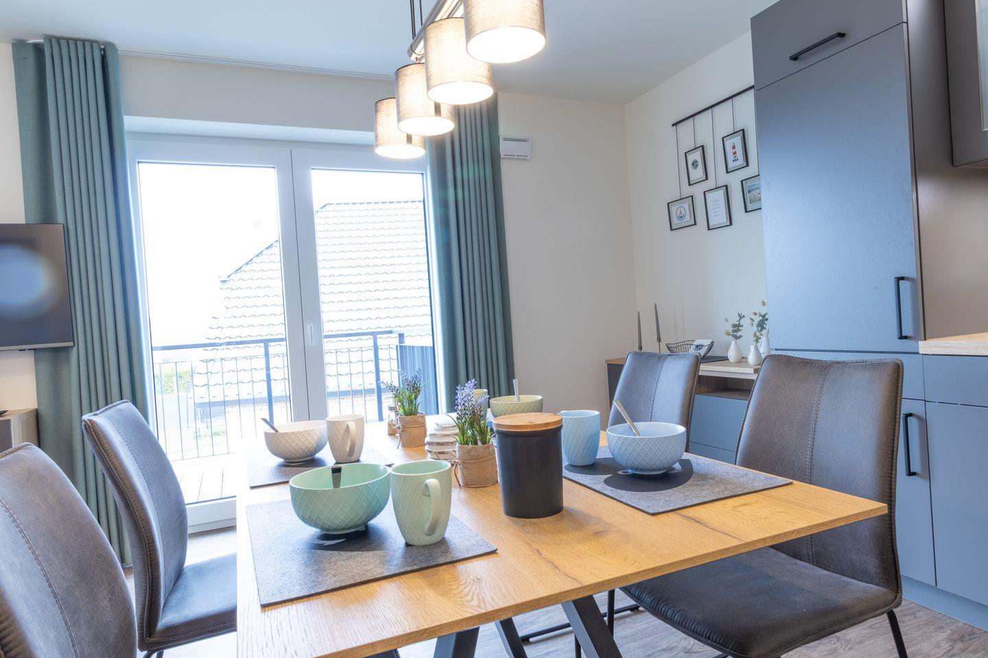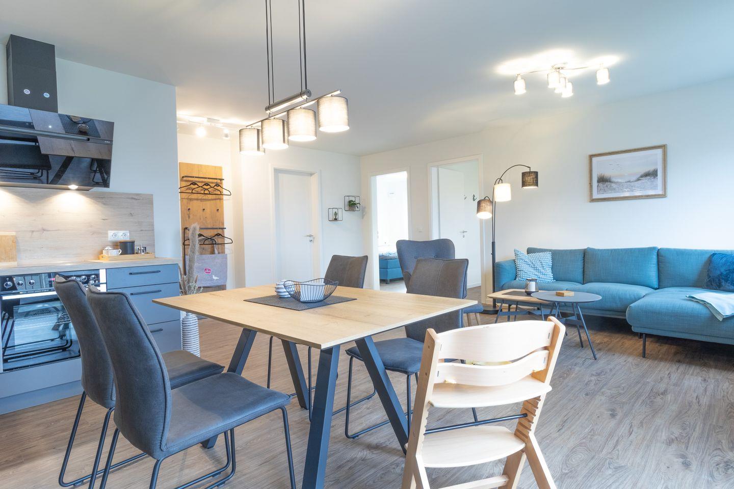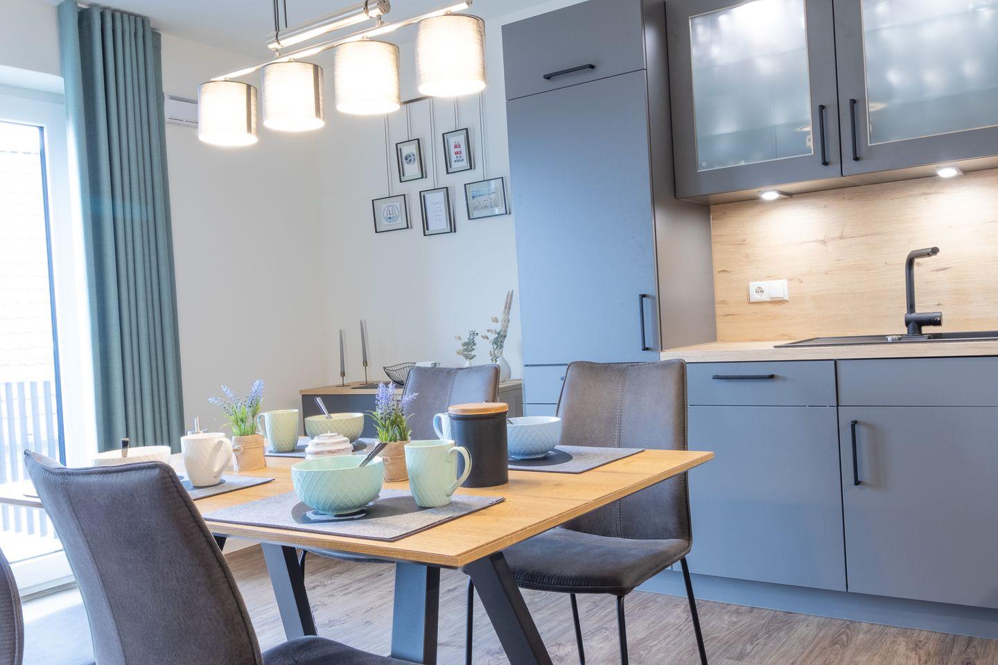 Der helle Wohnbereich überzeugt mit moderner Einrichtung, großen Fenstern und gemütlicher Atmosphäre. Viel Platz zum Verweilen, Entspannen oder gemeinsamen Spielen. Die offene Küche mit grauer Betonoptik ist voll ausgestattet und bietet alles, was du für gemeinsame Kochmomente brauchst – vom Frühstück bis zum Abendessen.