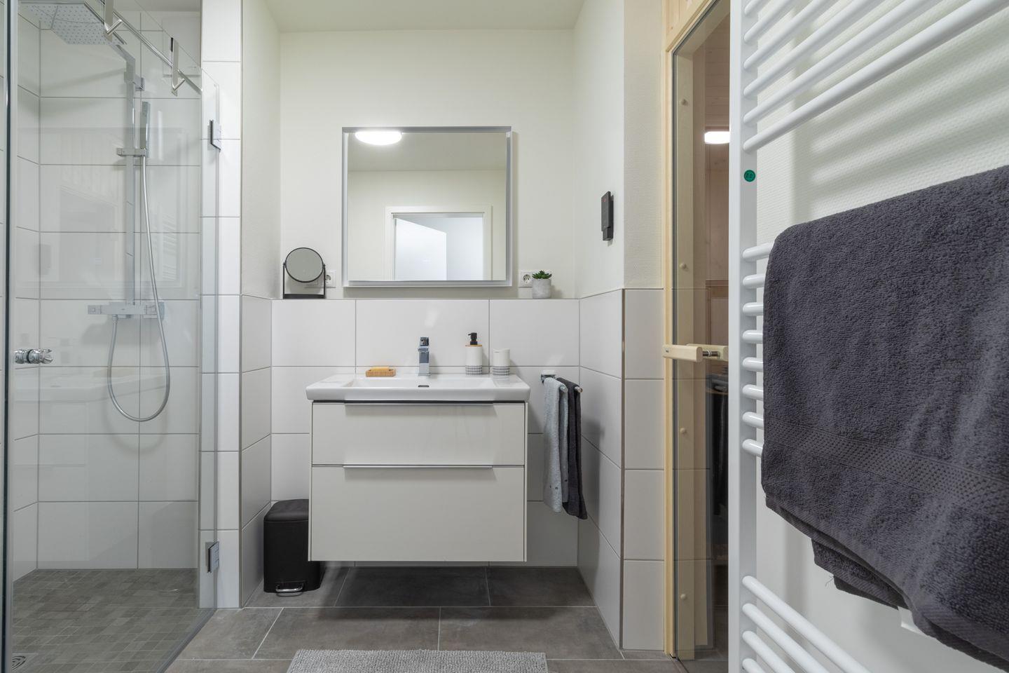 Das stilvolle Bad mit bodengleicher Dusche und privater Sauna macht deine Auszeit perfekt. Entspanne dich nach einem langen Strandspaziergang oder genieße einfach dein tägliches Wellnessritual direkt in der Wohnung.