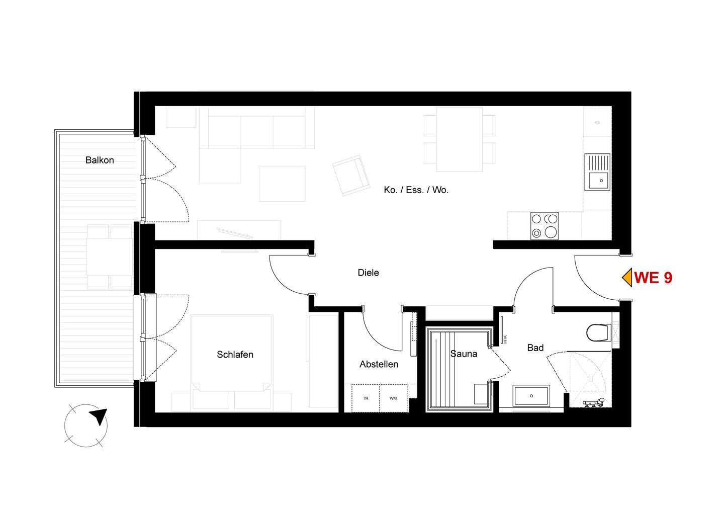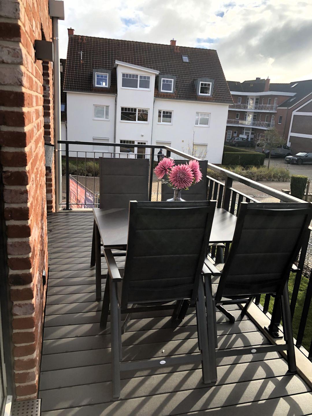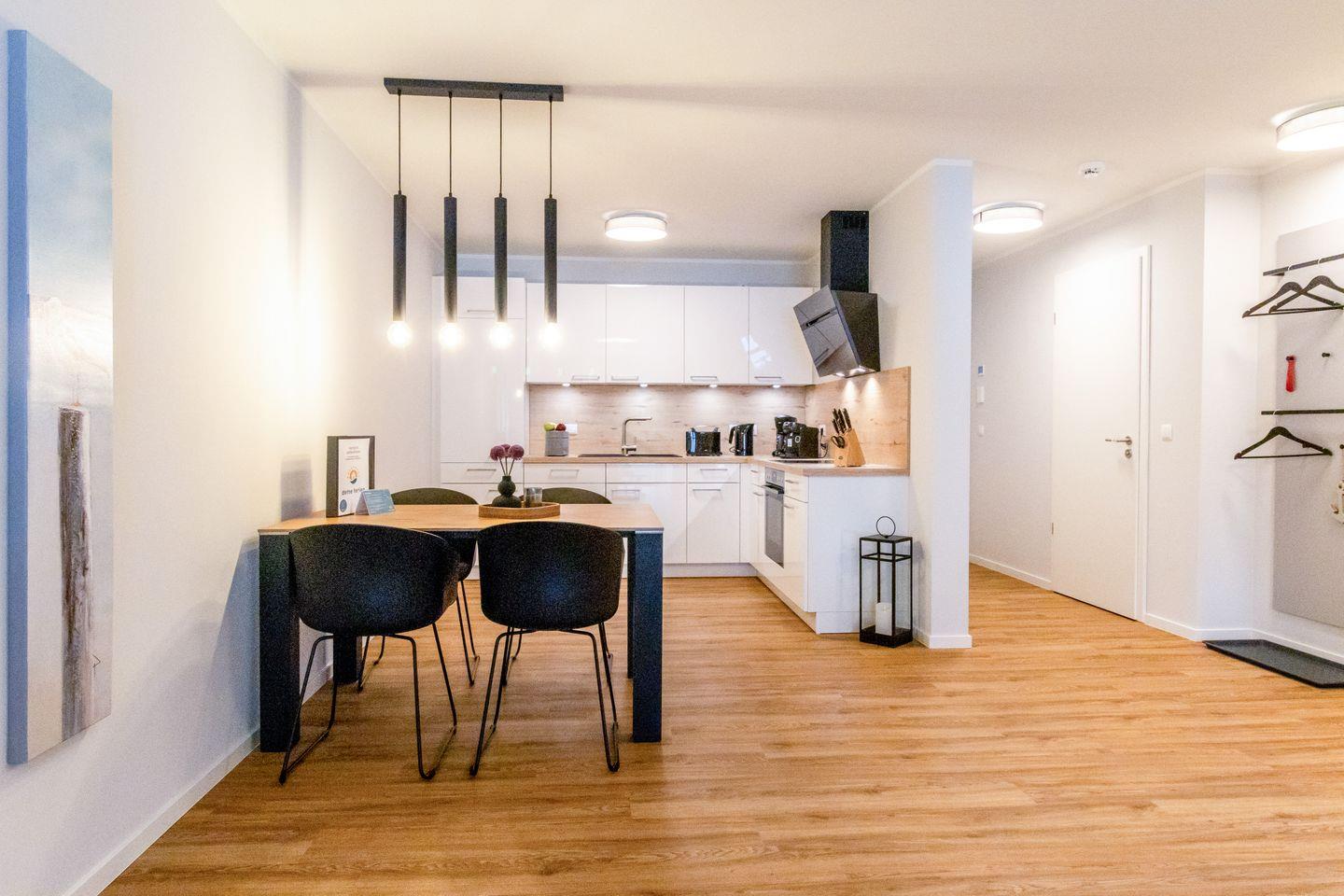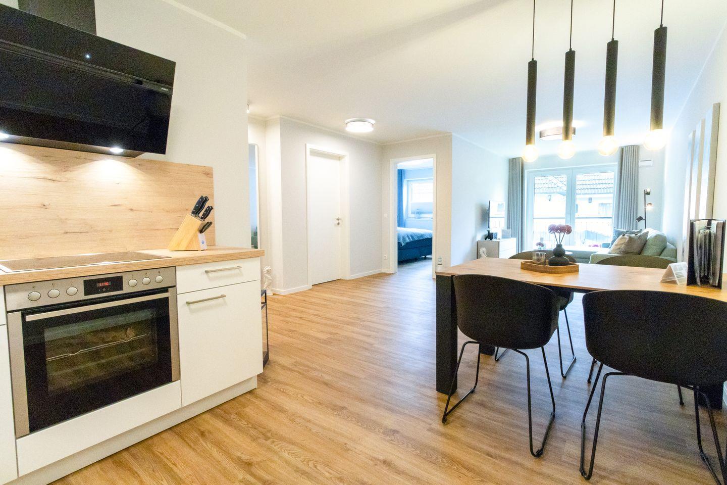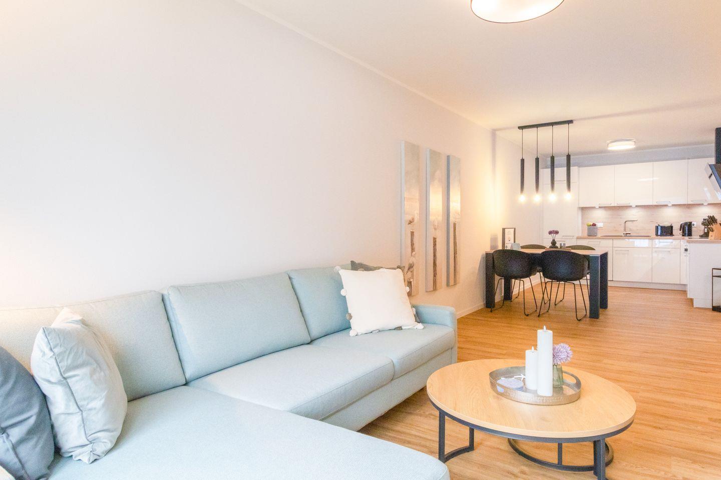 Der offene Wohnbereich ist geschmackvoll eingerichtet, bodentiefe Fenster lassen viel Licht herein und sorgen für eine angenehme Atmosphäre. Auf dem gemütlichen Schlafsofa kannst du entspannen oder den Abend mit einem Film ausklingen lassen. Der sonnige Balkon mit Südwest-Ausrichtung bietet dir einen schönen Platz im Freien – ideal für Frühstück oder ein Glas Wein zum Sonnenuntergang. Die offene Küche ist voll ausgestattet, u.?a. mit Tassimo-Maschine, Filterkaffeemaschine und Milchaufschäumer. Auch ein Esstisch mit Hochstuhl ist vorhanden.
