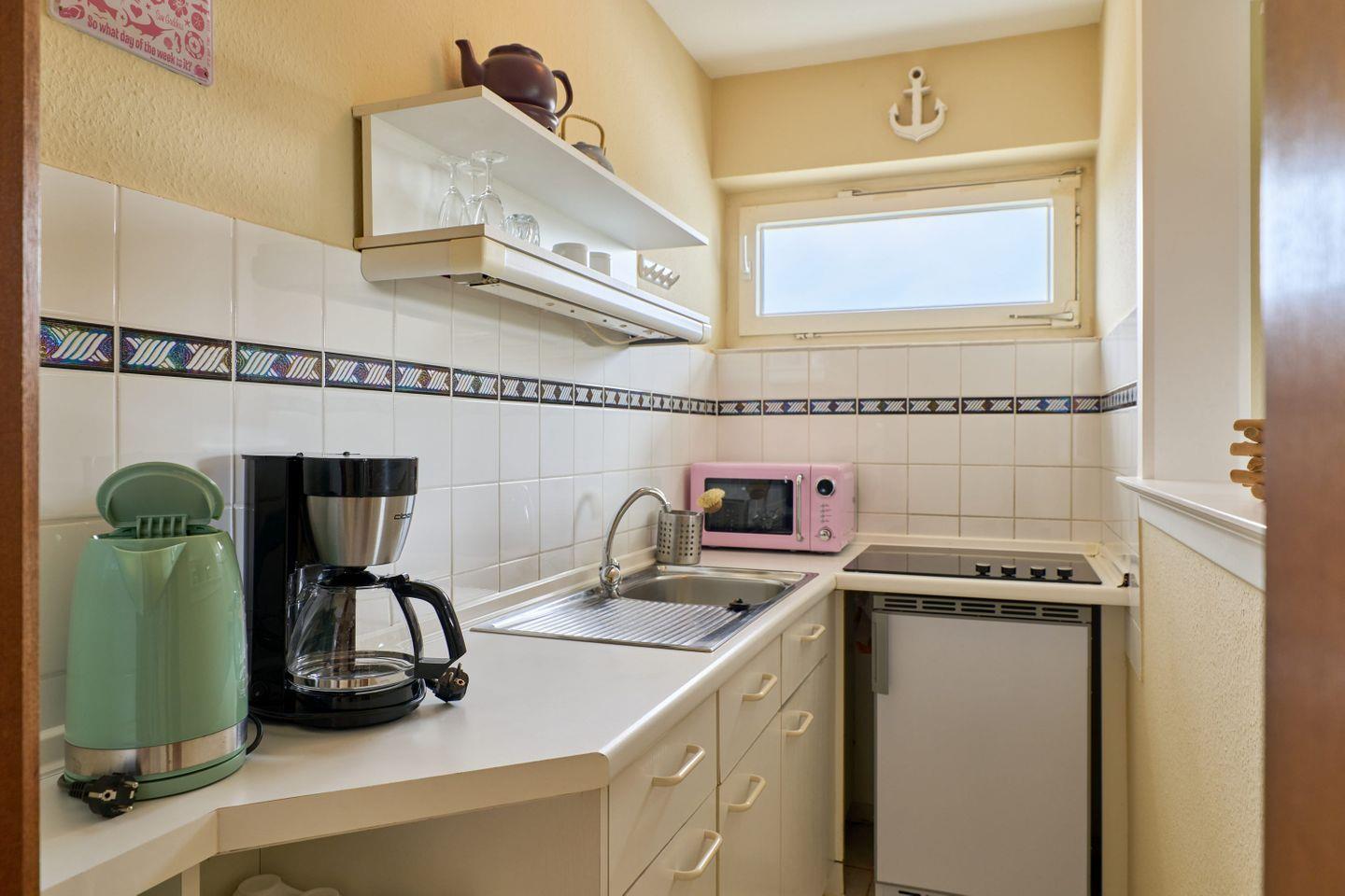 Die geschlossene Küche ist ideal für Selbstversorger, und bietet Ihnen alles, was Sie zur Zubereitung Ihrer Lieblingsgerichte benötigen. Mit einer modernen Cerankochplatte, einer Mikrowelle, einem Kühlschrank, einer Kaffeemaschine, einem Toaster, einem Wasserkocher und grundlegenden Küchenutensilien ist sie bestens ausgestattet. Ein Esstisch, der genügend Platz für ein gemeinsames Essen bietet, rundet die Kochgelegenheit ab.