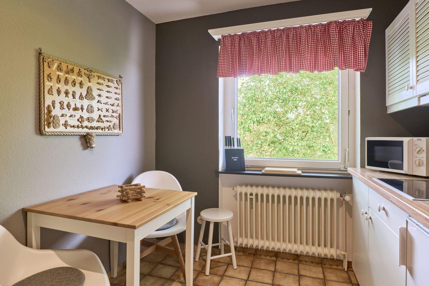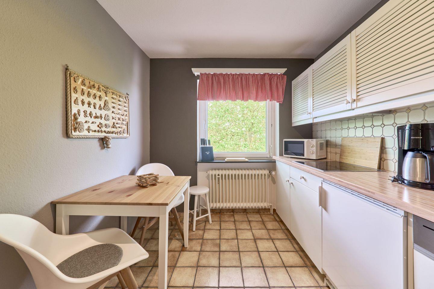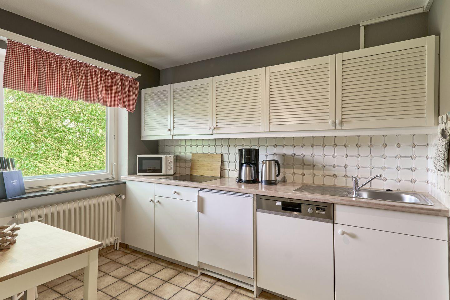 Die geschlossene Küche ist mit hochwertigen, modernen Geräten ausgestattet. Hier finden Sie unter anderem einen Cerankochfeld-Herd, eine Spülmaschine, eine Mikrowelle sowie einen Kühlschrank. Auch weitere Küchenutensilien wie Toaster, Wasserkocher und Kaffeemaschine sind vorhanden, sodass Sie Ihre Lieblingsgerichte problemlos zubereiten können. Für zusätzliche Bequemlichkeit sorgt die Gemeinschaftsnutzung von Waschmaschine und Trockner, die im Haus zur Verfügung stehen.