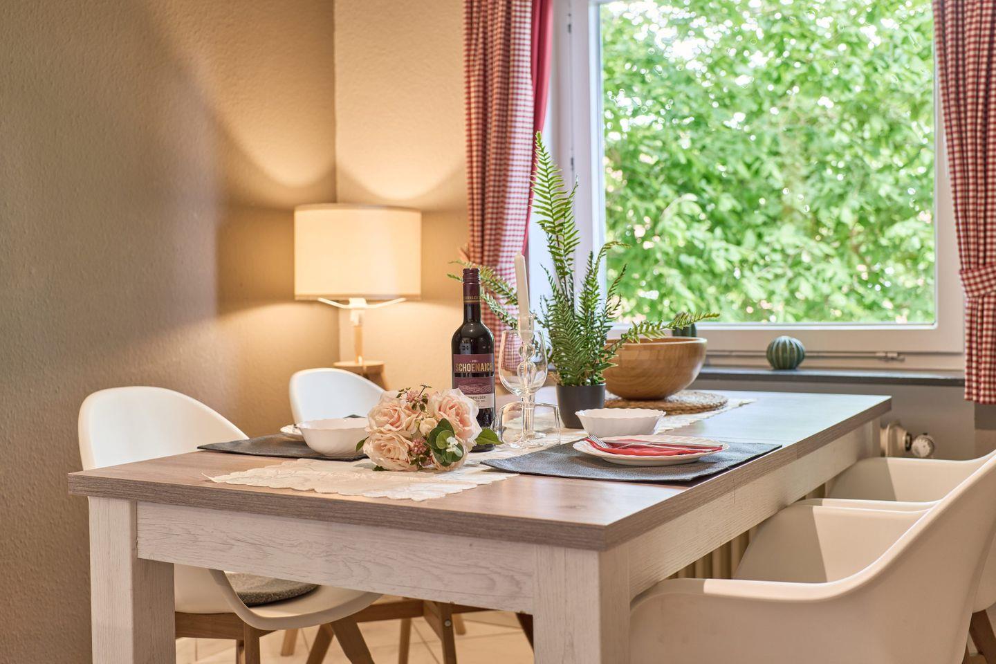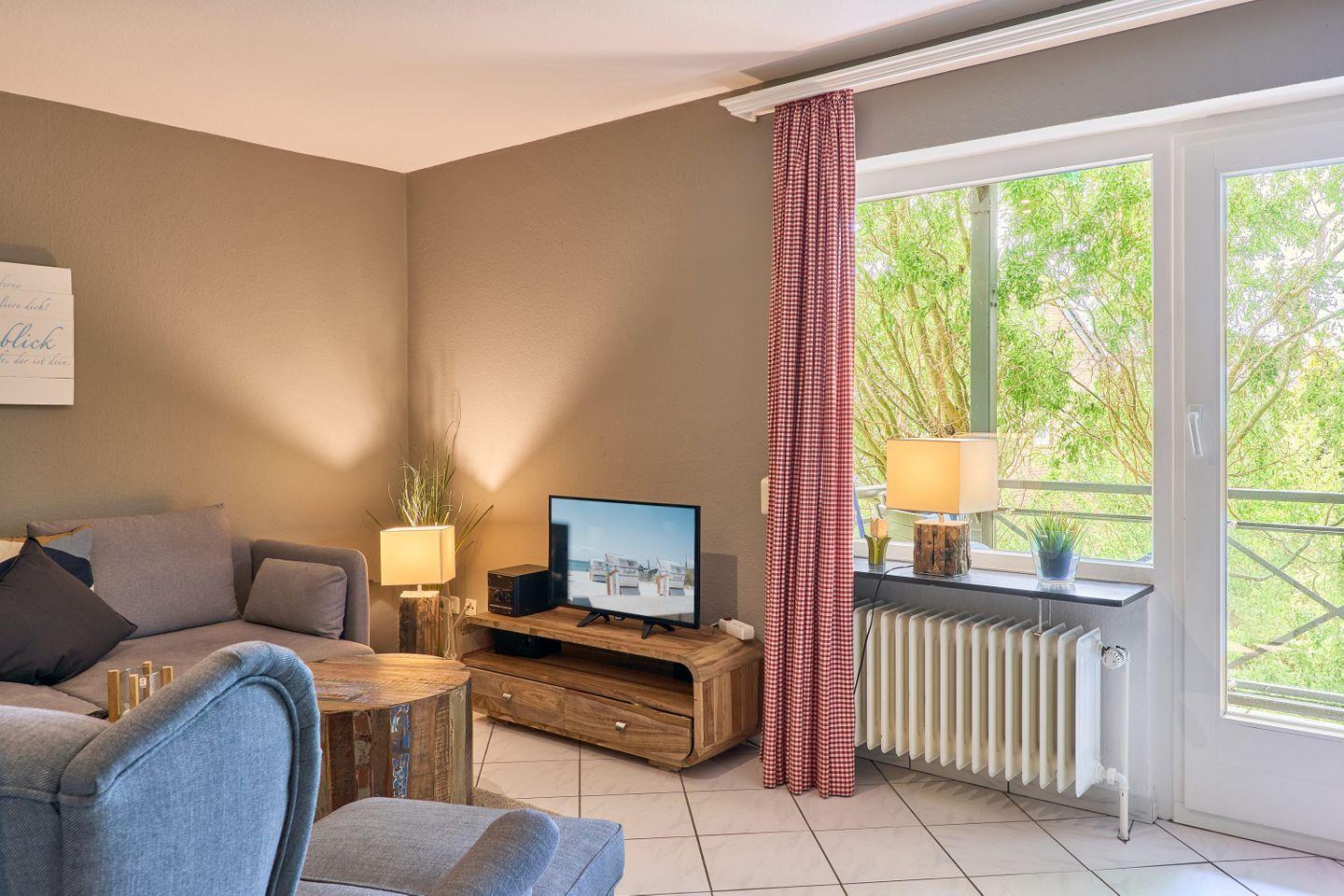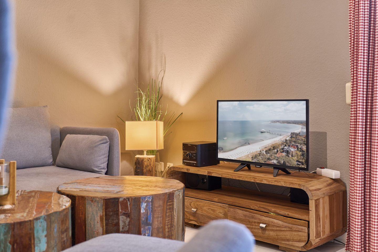 Im großzügigen und lichtdurchfluteten Wohnzimmer entspannen Sie nach einem ereignisreichen Tag am Strand. Die gemütliche Sofaecke lädt zum Verweilen ein, während Sie einen Film mit dem vorhandenen TV oder DVD-Player genießen können. Für angenehme Abende und gesellige Stunden sorgt der Essbereich mit einem Esstisch, an dem sich alle zusammenfinden können.