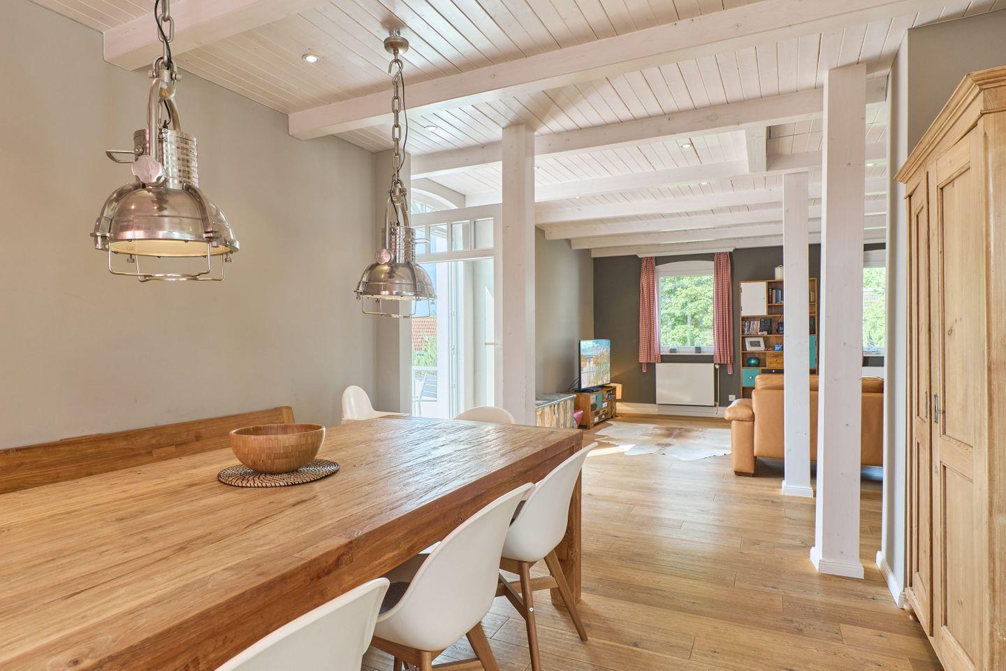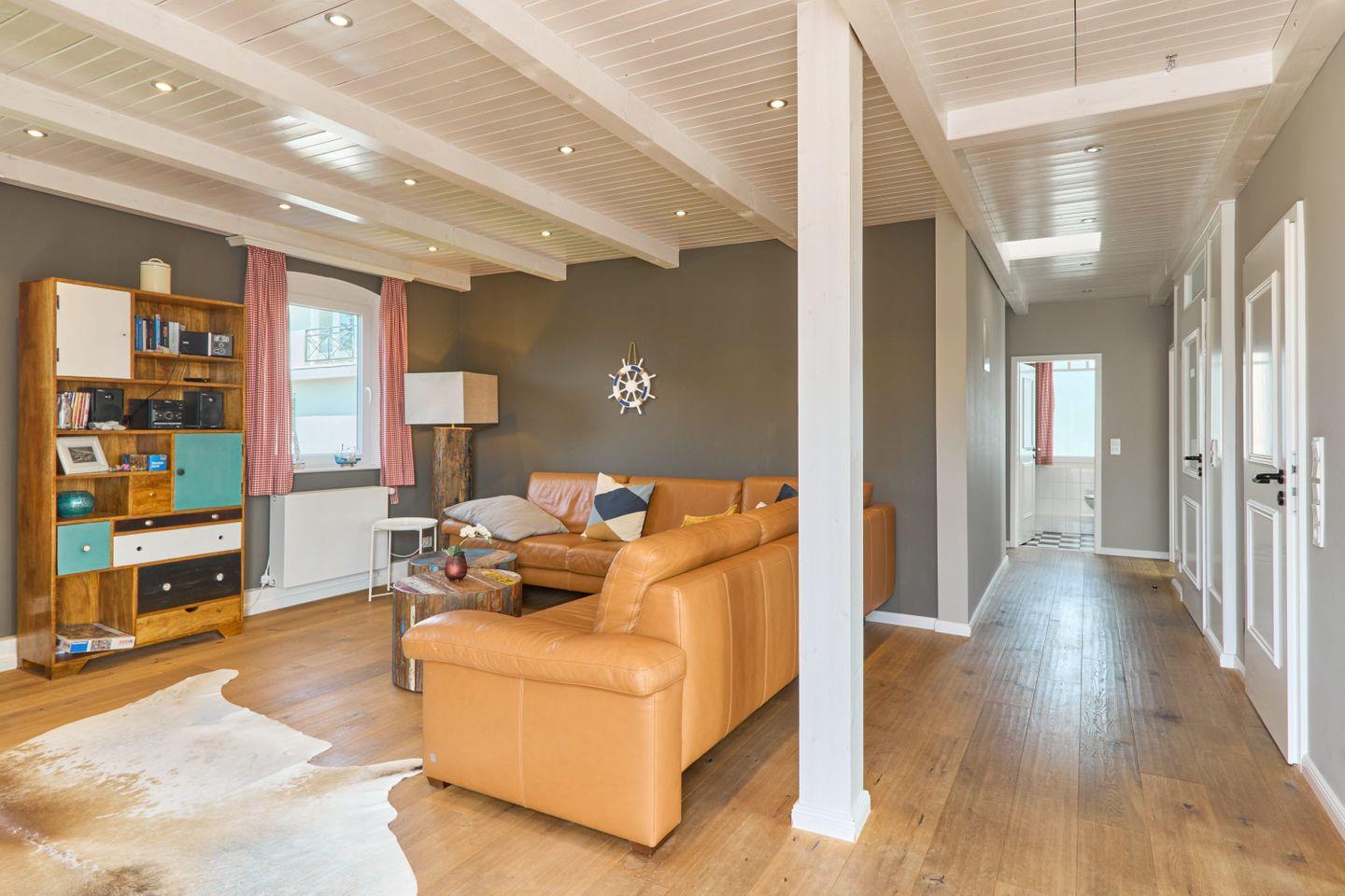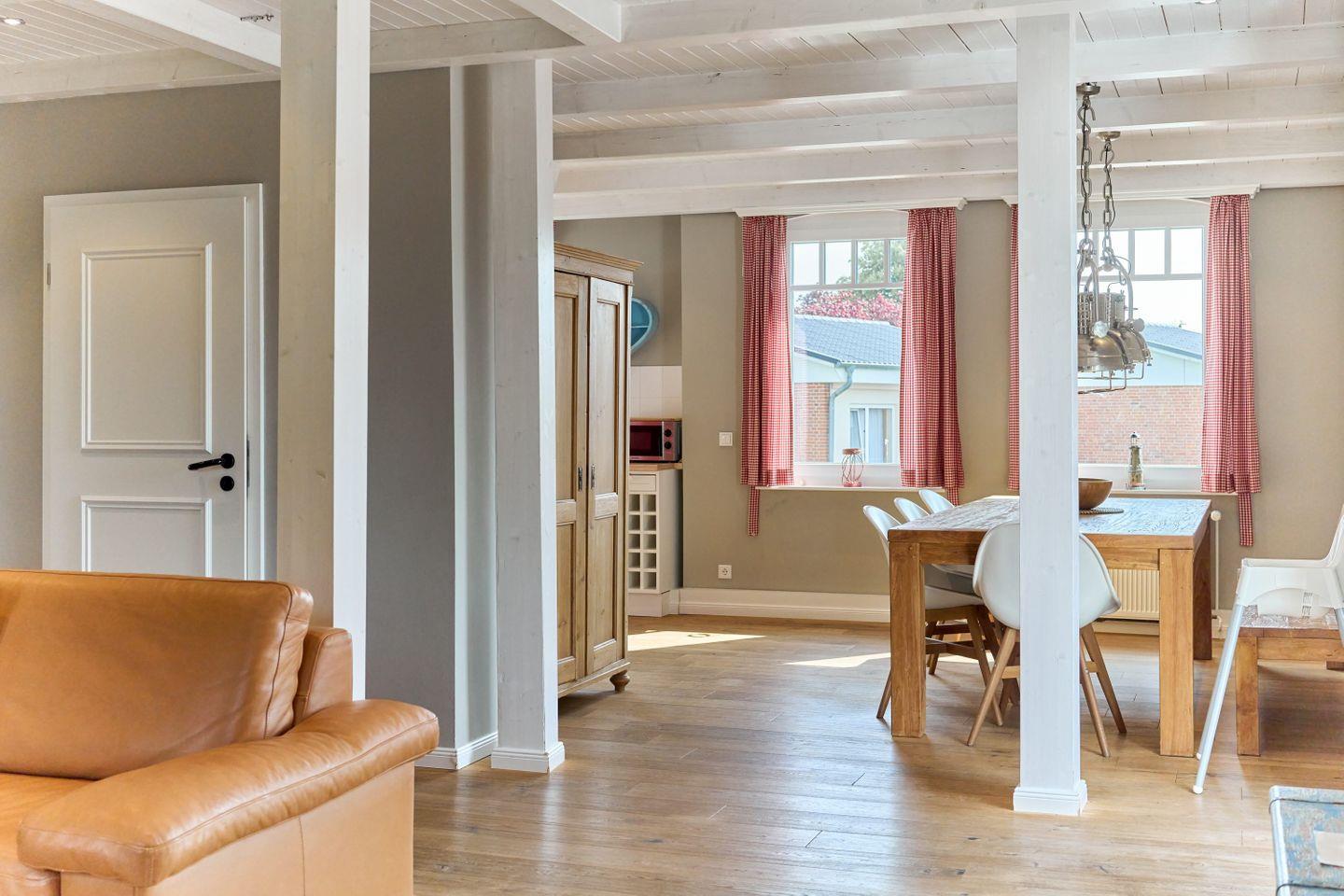 Das Wohnzimmer der Unterkunft besticht durch seine helle und freundliche Atmosphäre. Hier können Sie sich nach einem erlebnisreichen Tag bequem auf dem Sofa entspannen oder gemeinsam Zeit am Esstisch verbringen. Die moderne Sofaecke bietet zusätzlichen Platz zum Relaxen oder für gesellige Abende. Die offene Gestaltung des Wohnbereichs sorgt für ein angenehmes Raumgefühl.