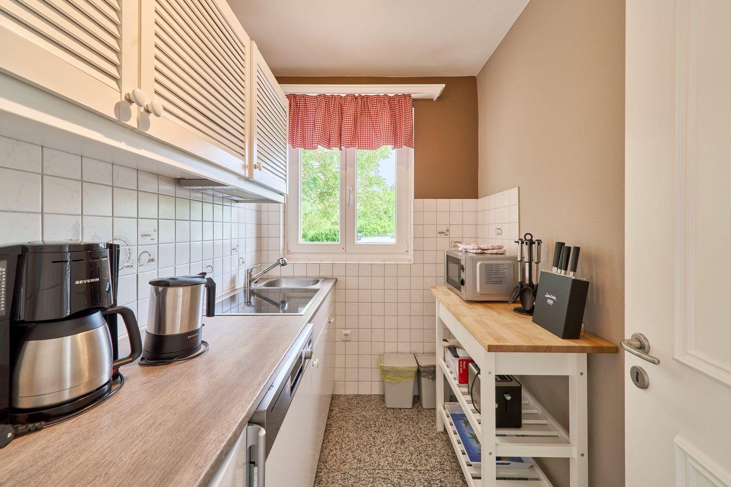 Der offene Wohn- und Essbereich lädt zum Verweilen und Entspannen ein. Hier finden Sie einen komfortablen Sofa-Bereich, ideal zum Entspannen nach einem erlebnisreichen Tag an der Ostsee. Der Esstisch bietet genügend Platz für gemeinsame Mahlzeiten und lustige Abende. Die kleine, aber funktionale Küche ist mit einem Cerankochfeld, einem Kühlschrank, einer Spülmaschine und allen notwendigen Küchenutensilien ausgestattet. Egal, ob Sie ein einfaches Frühstück zubereiten oder ein festliches Abendessen planen, hier finden Sie alles, was Sie dafür benötigen. Auch Kaffeemaschine und Toaster sind vorhanden, um Ihren Tag perfekt zu beginnen.