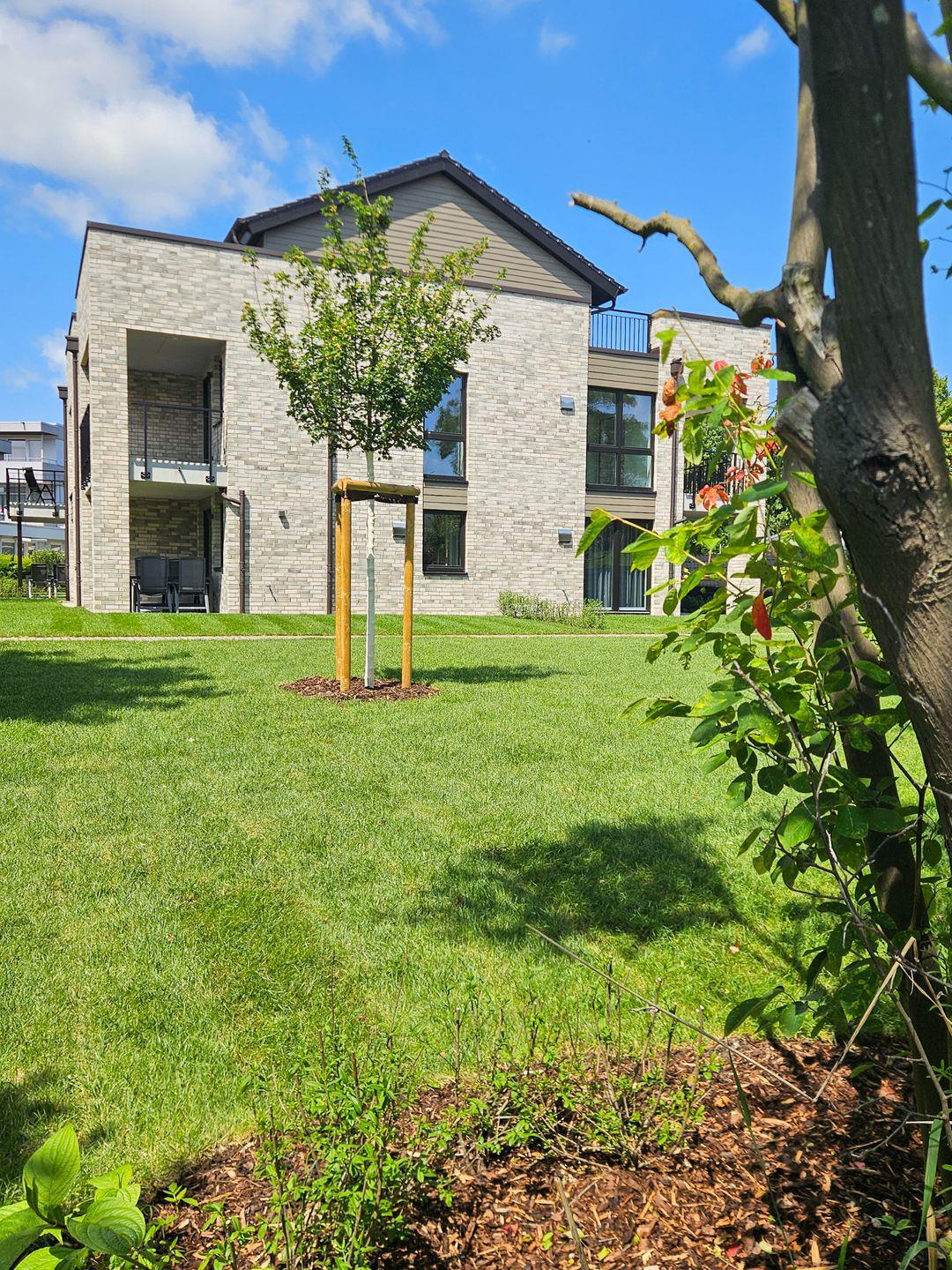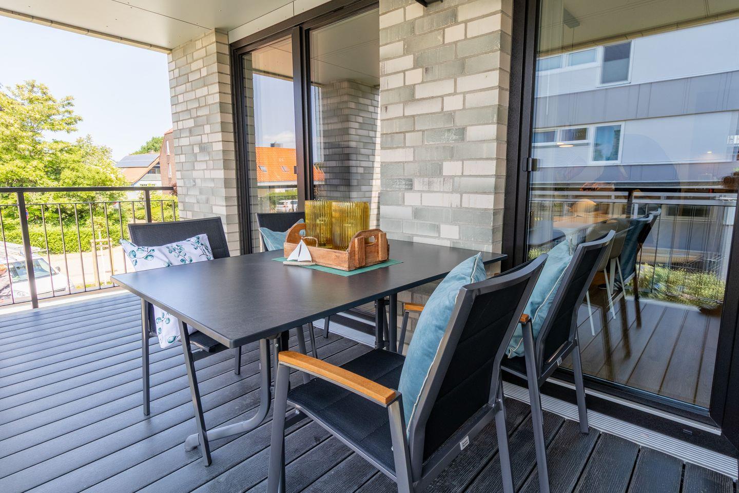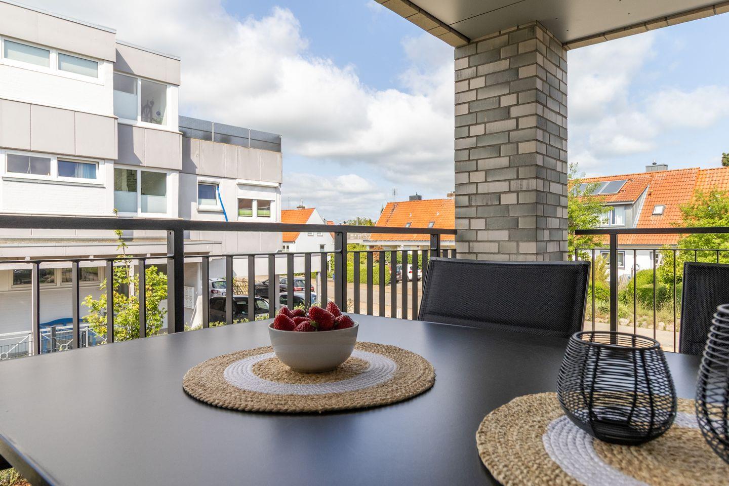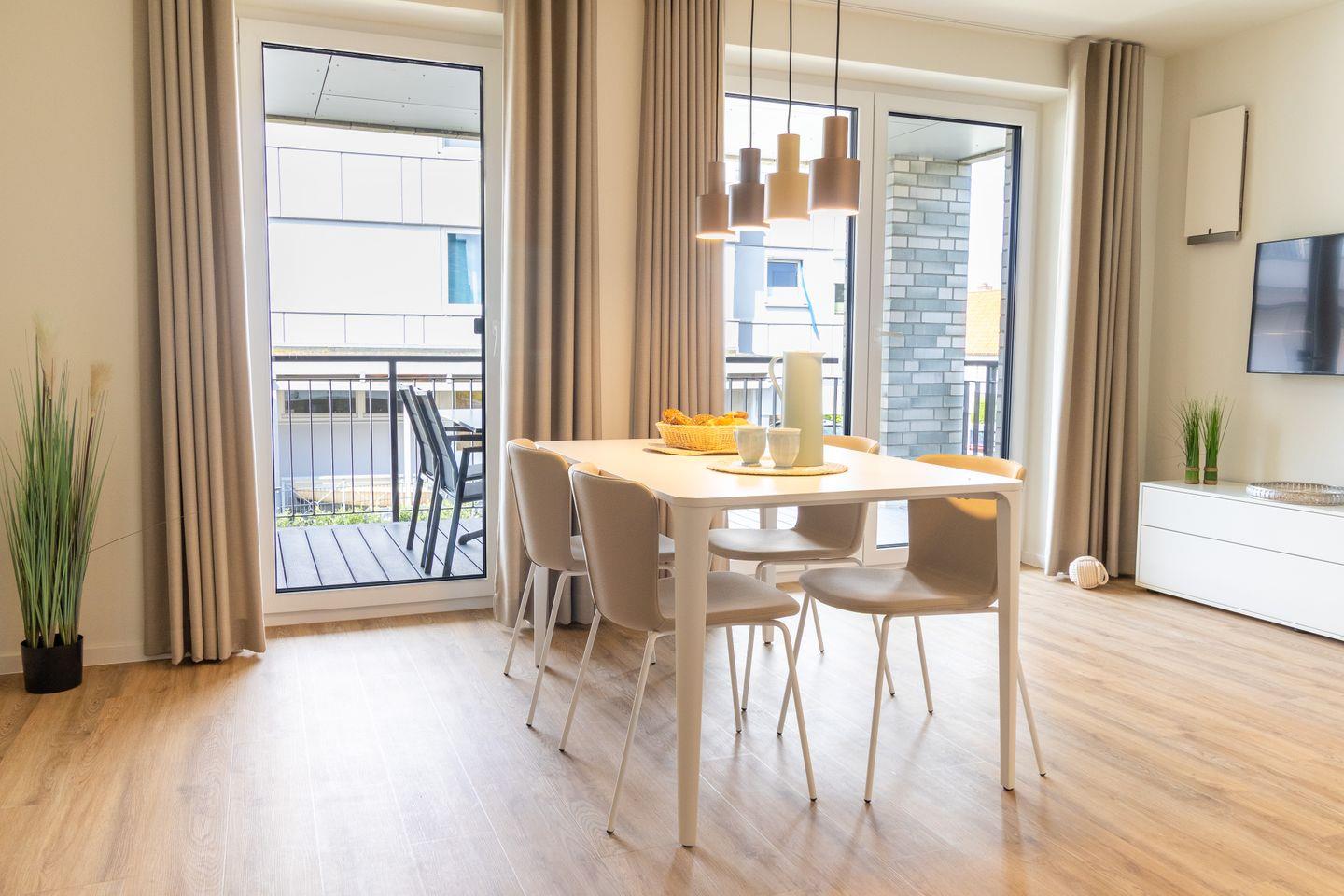Der helle Wohnbereich mit bodentiefen Fenstern schafft ein luftiges Raumgefühl und bietet Zugang zur überdachten Loggia. Hier genießt du die frische Ostseeluft, egal ob beim Frühstück oder beim entspannten Tagesausklang. Die Fußbodenheizung sorgt für wohlige Wärme, die Wohnraumlüftung für stets frische Luft. Eine Waschmaschine und ein Trockner stehen ebenfalls zur Verfügung – besonders praktisch für Familien.