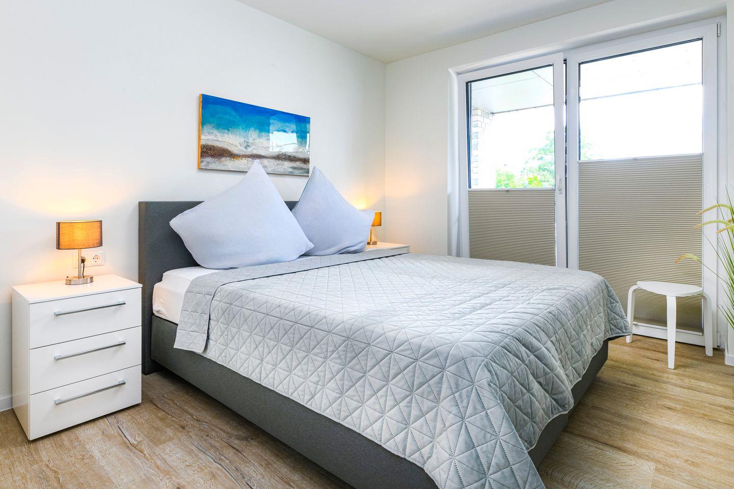 Zwei Schlafzimmer mit bequemen Boxspringbetten bieten dir erholsamen Schlaf – ideal für bis zu vier Gäste. Die ruhige Ausrichtung und barrierearme Gestaltung machen StrandGut besonders komfortabel – auch für Gäste mit erhöhtem Platzbedarf oder Mobilitätseinschränkungen.