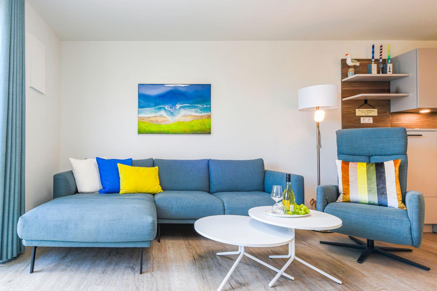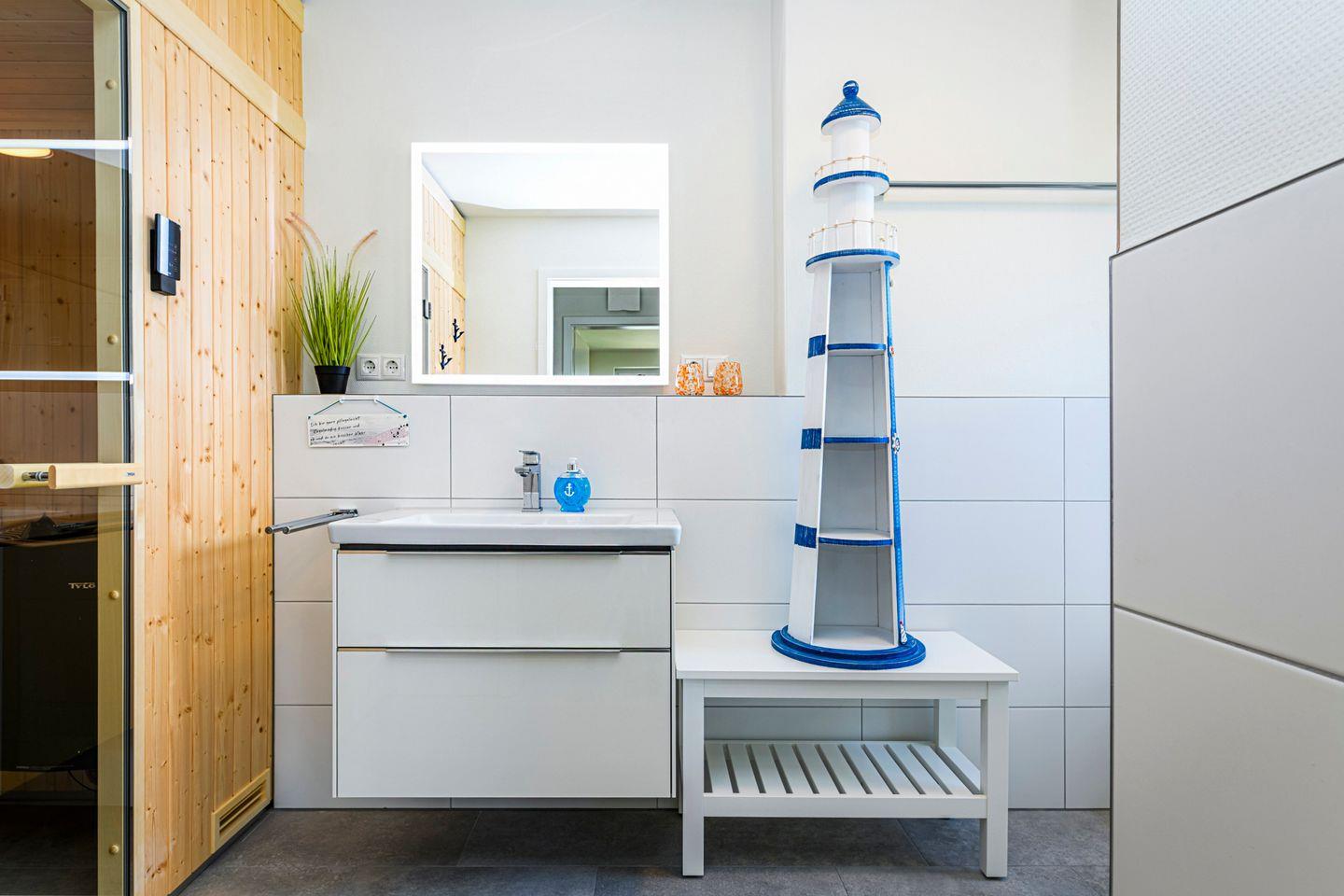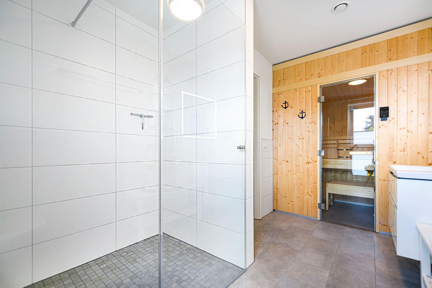 Deine eigene Sauna in der Wohnung sorgt für wohltuende Erholung nach langen Strandspaziergängen oder sportlichen Tagen am Meer. Ein modernes Bad mit Dusche bietet dabei höchsten Komfort. Zusätzlich steht ein separates Gäste-WC zur Verfügung.