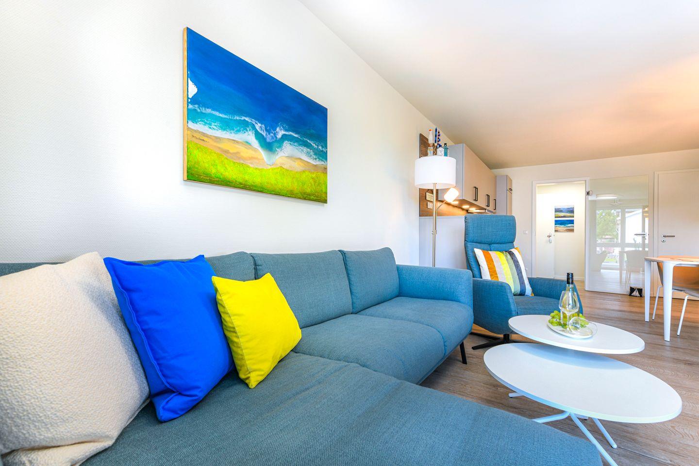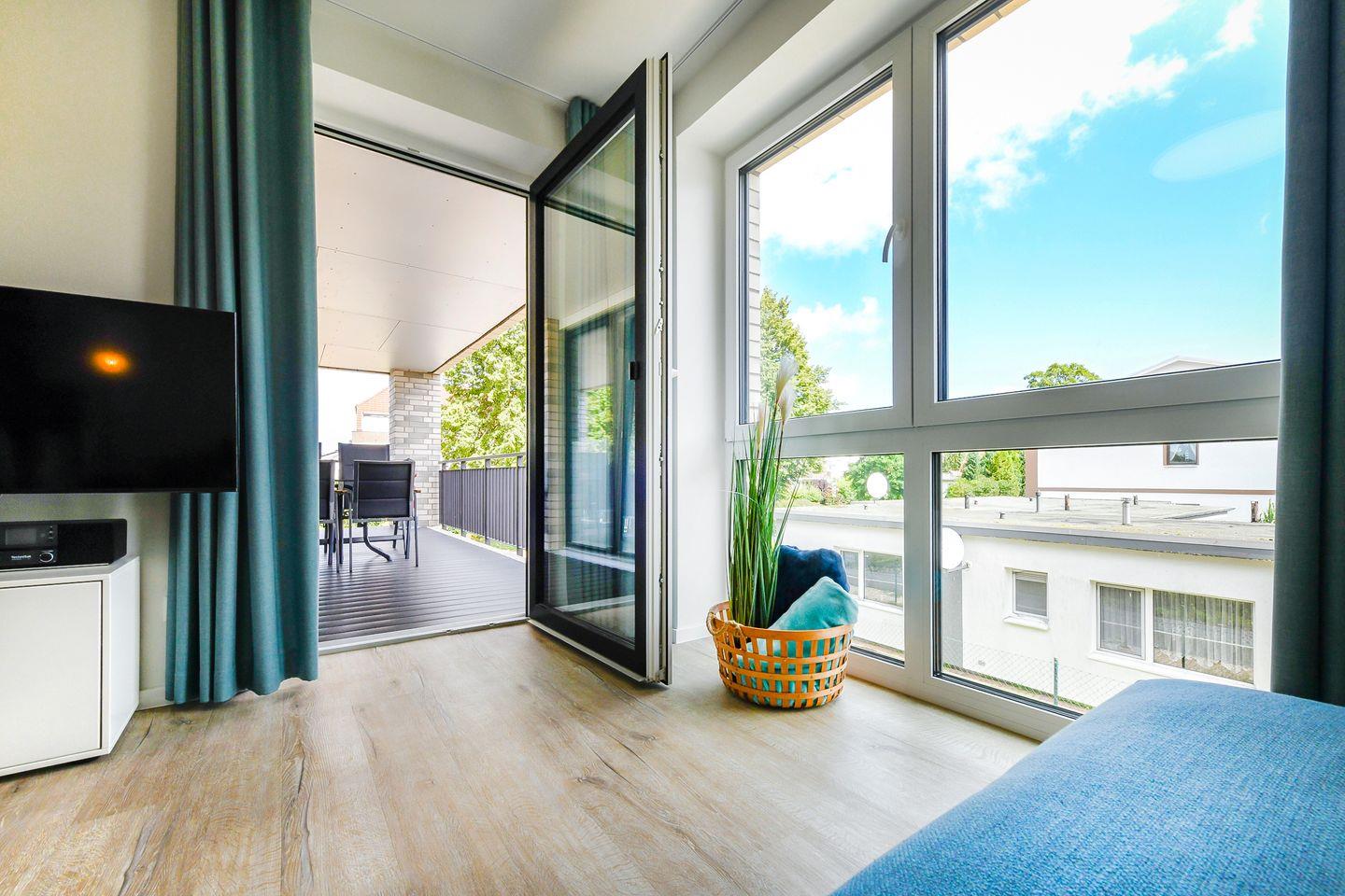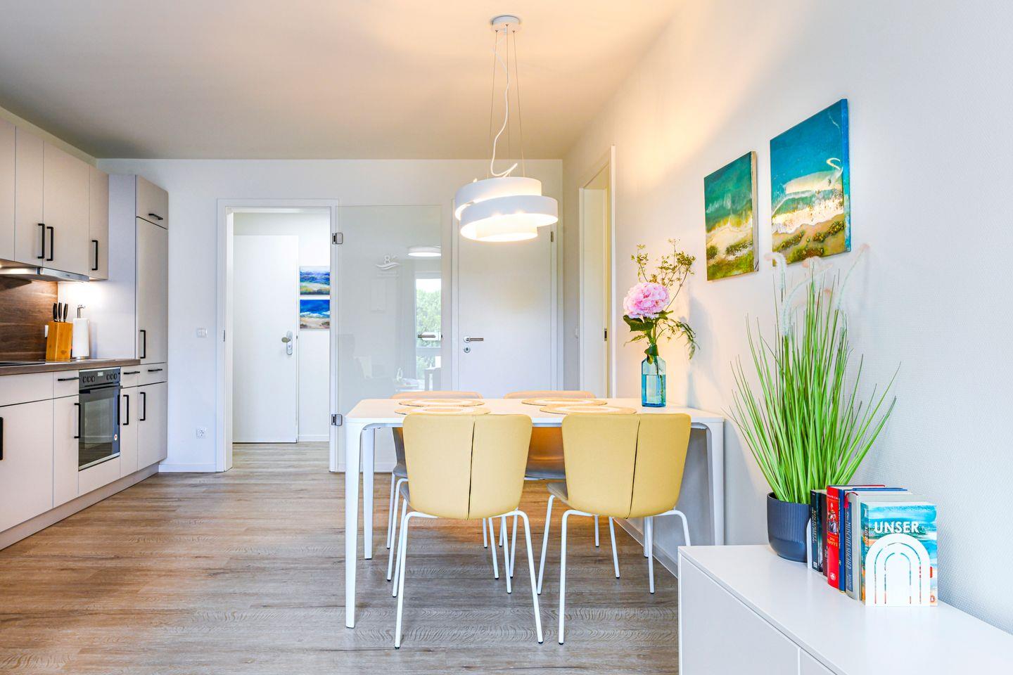 Der helle Wohnbereich mit bodentiefen Fenstern öffnet sich zur großen, überdachten Loggia – perfekt für Frühstück in der Morgensonne oder entspannte Abende an der frischen Ostseeluft. Die offene Küche ist vollständig ausgestattet und lädt zum Kochen und Genießen ein. Fußbodenheizung und Wohnraumlüftung sorgen für ein angenehmes Raumklima.