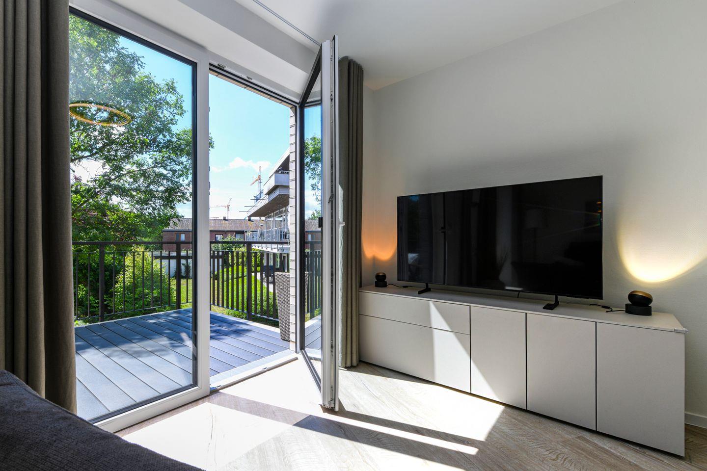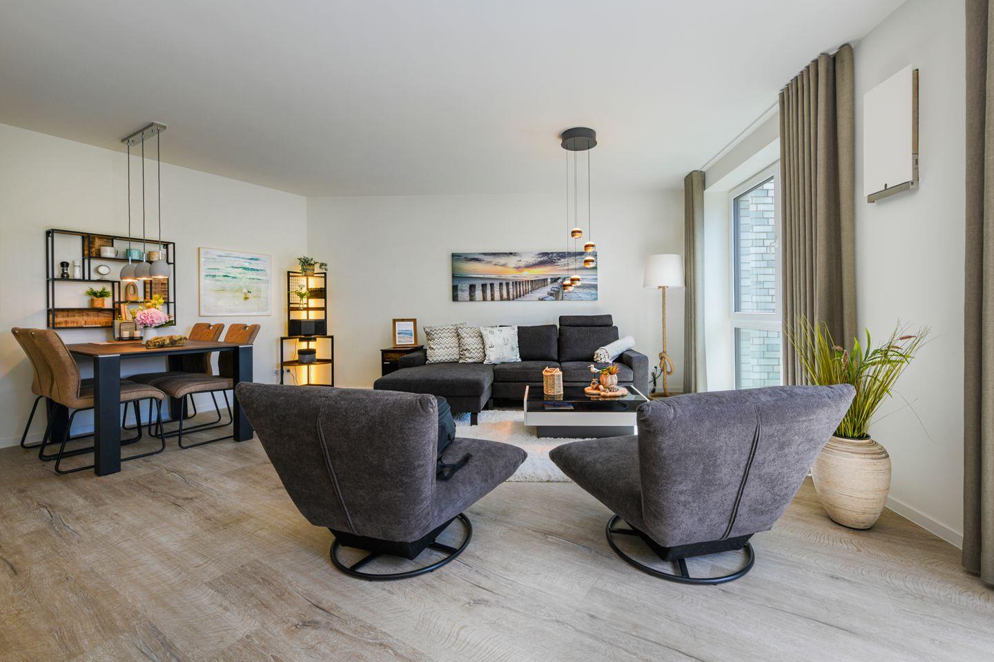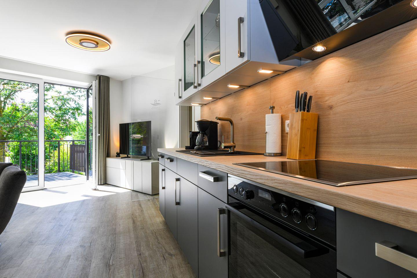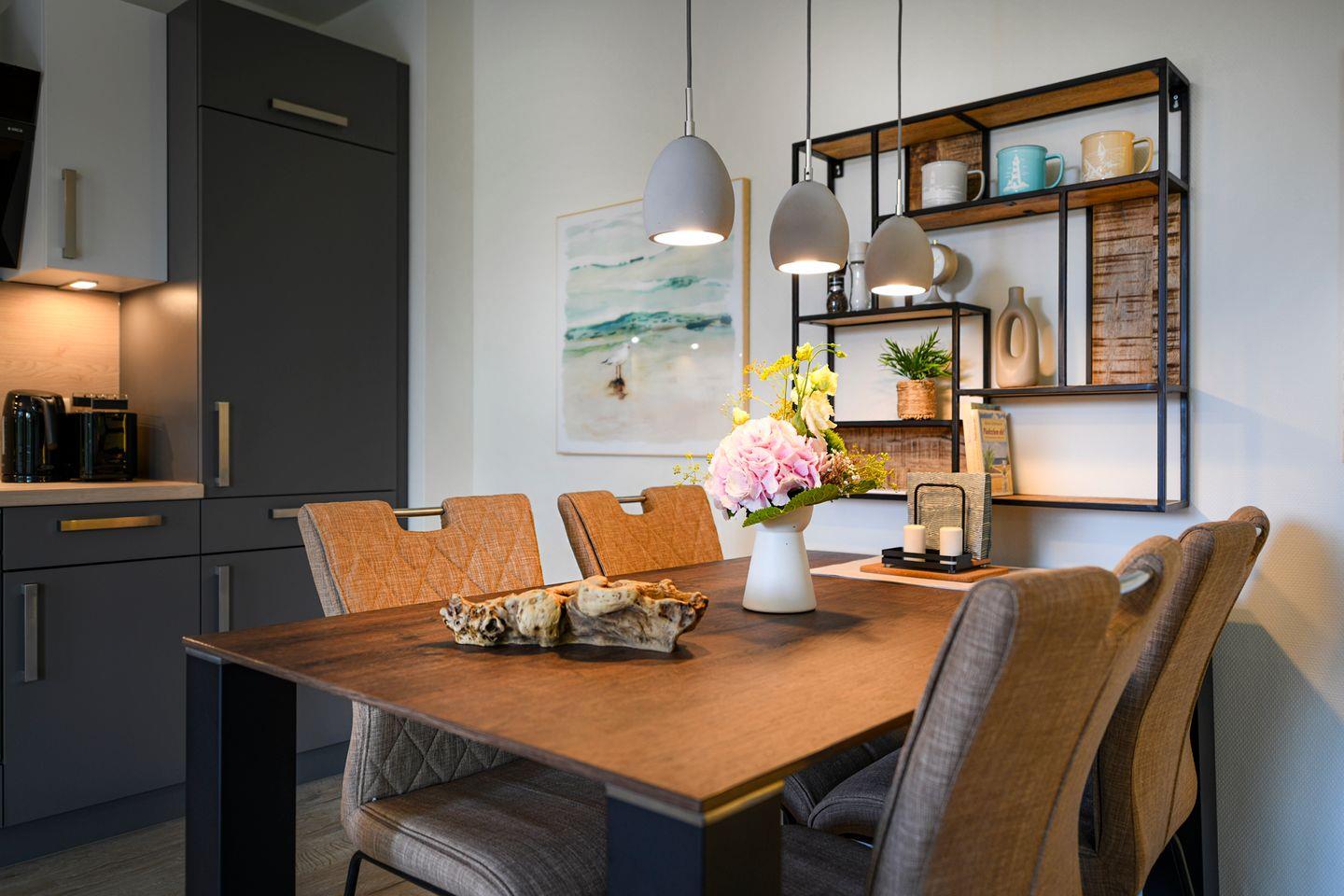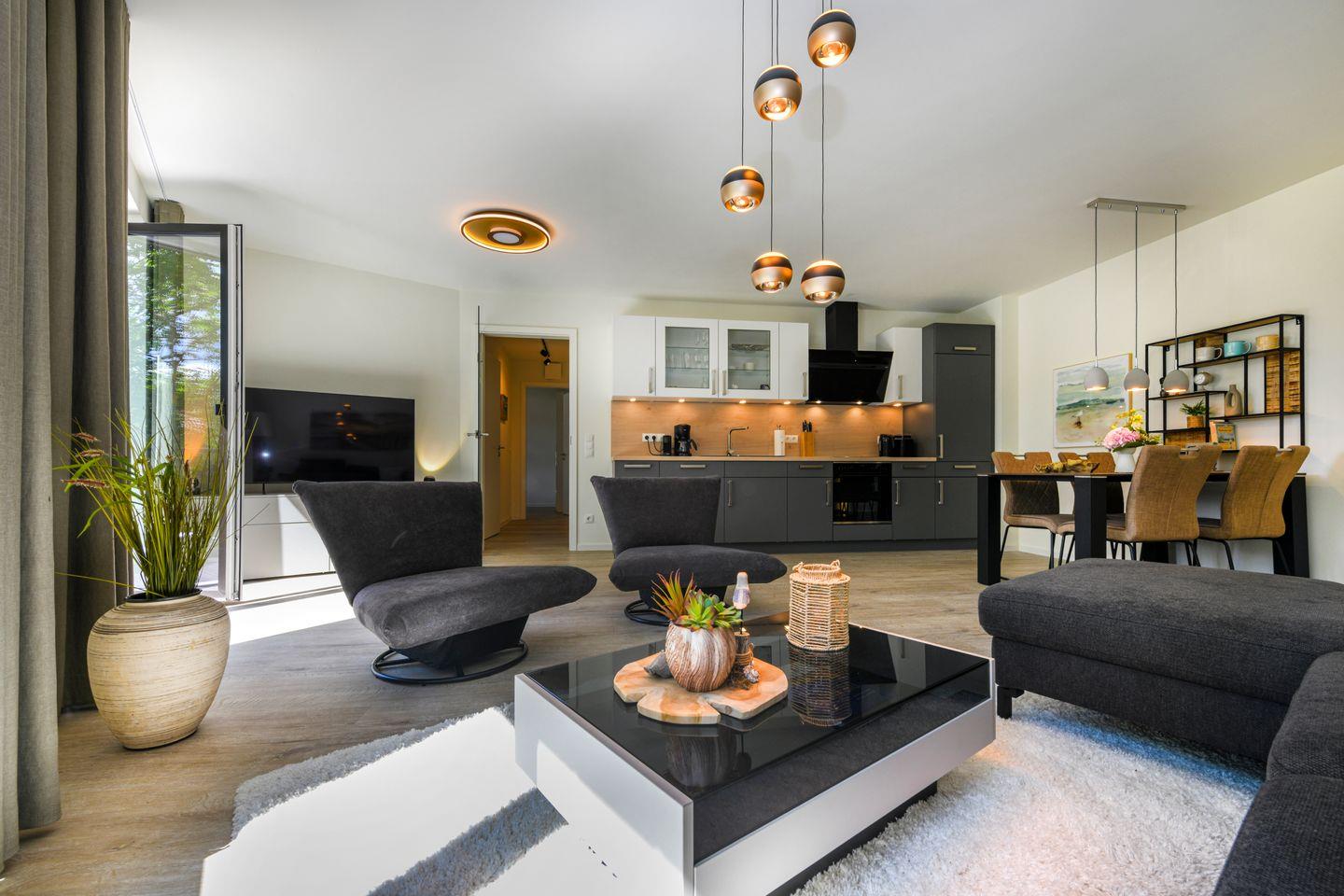 Helle Räume, bodentiefe Fenster und eine moderne Einrichtung sorgen für ein angenehmes Wohngefühl. Die offene Küche ist mit allem ausgestattet – direkt daneben lädt der Esstisch zu gemeinsamen Mahlzeiten ein. Auf dem Balkon in sonniger Südlage kannst du die Ostseeluft wunderbar genießen – ob beim Frühstück oder beim Ausklang des Tages.