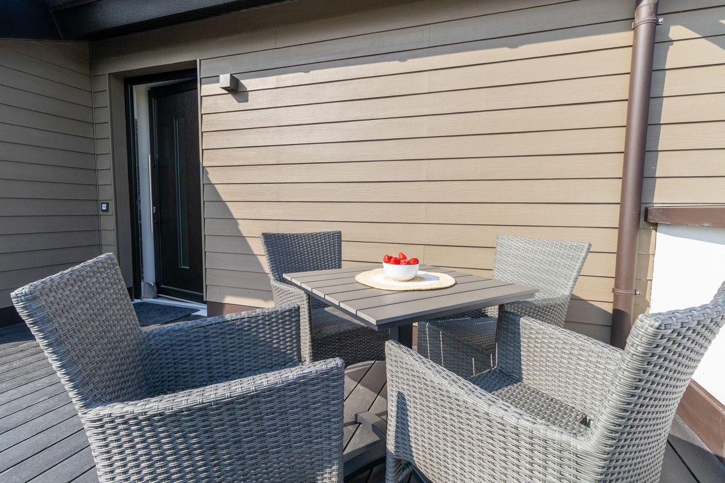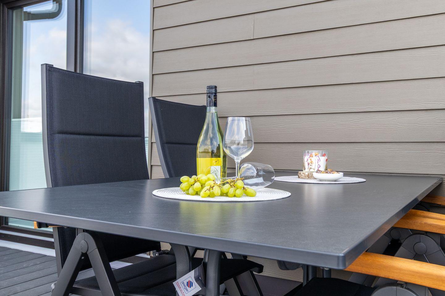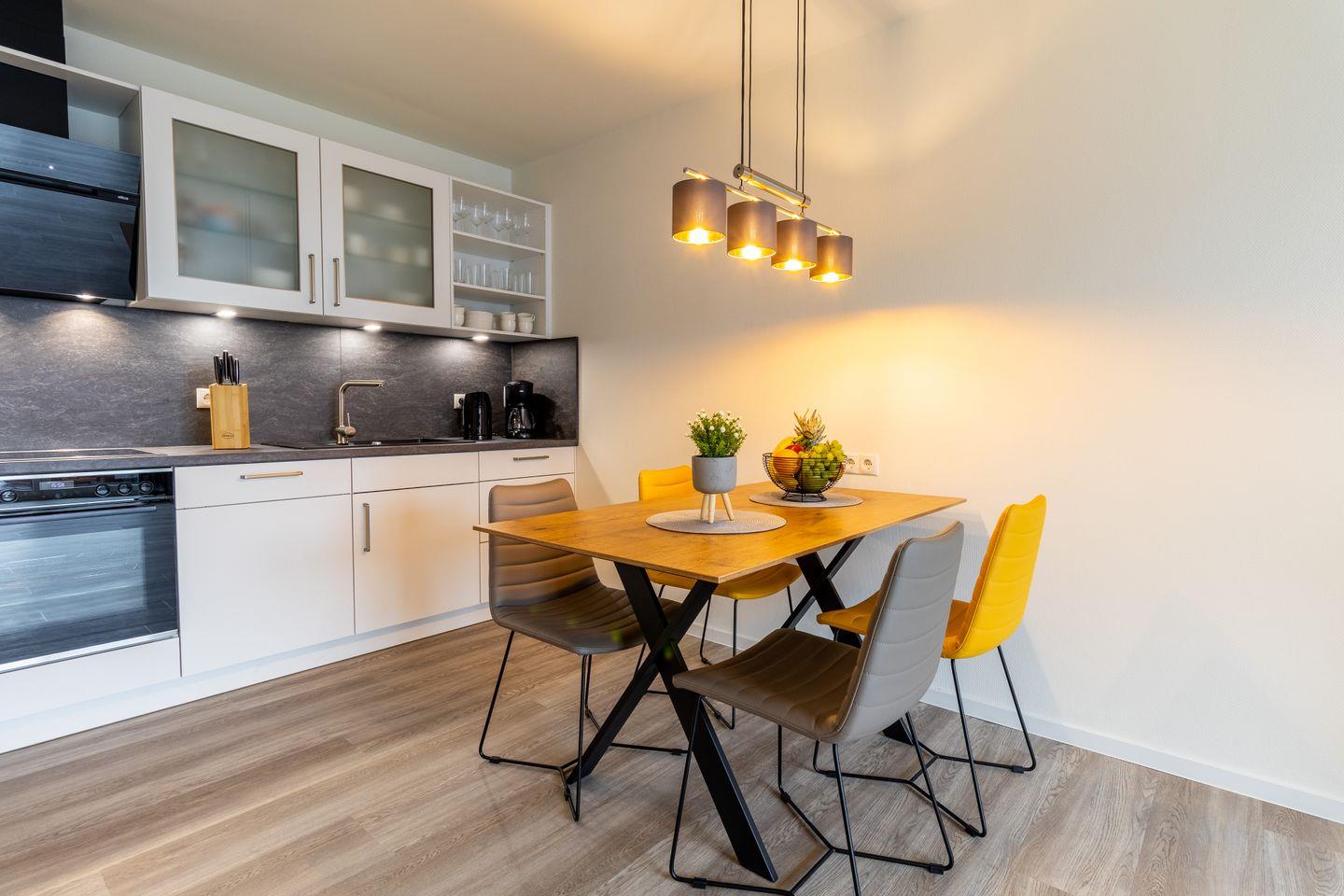 Der lichtdurchflutete Wohnbereich öffnet sich zur weitläufigen Dachterrasse. Hier kannst du entspannen, lesen oder einfach die Sonne genießen. Die offene Küche ist umfassend ausgestattet mit Cerankochfeld, Backofen, Mikrowelle Kühlschrank mit Gefrierfach und Spülmaschine. Der angrenzende Essbereich bietet ausreichend Platz für alle Gäste. Fußbodenheizung und eine Wohnraumlüftung mit Wärmerückgewinnung sorgen ganzjährig für ein angenehmes Raumklima.