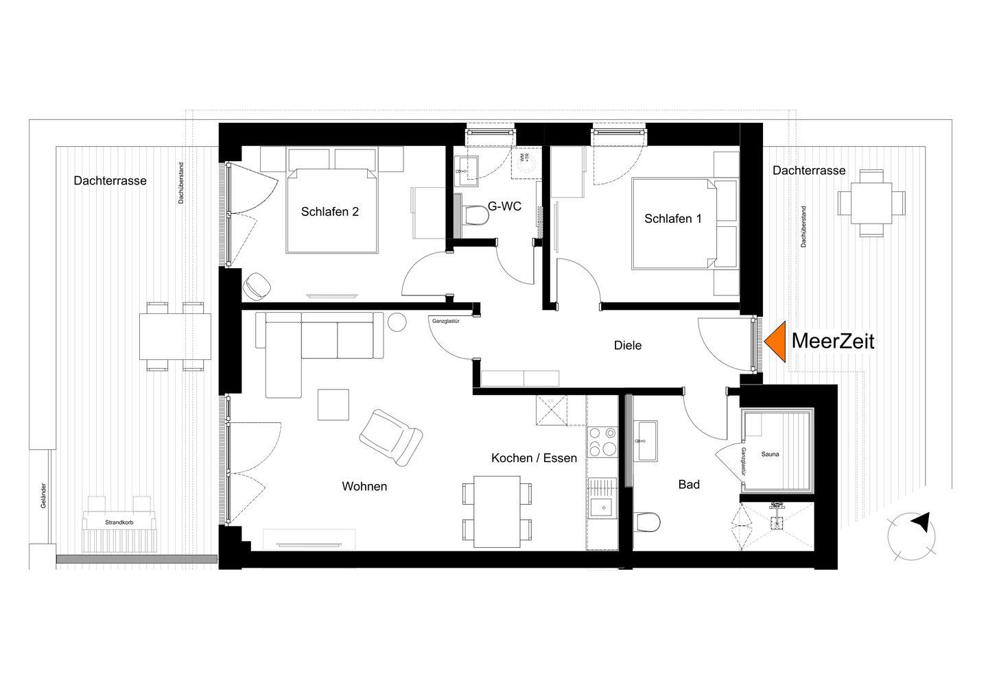 Ankommen, durchatmen, wohlfühlen – in der neu gebauten Penthousewohnung MeerZeit erwartet dich ein stilvoller Rückzugsort mit Top-Ausstattung und traumhafter Lage. Nur wenige Gehminuten vom Strand entfernt genießt du auf über 90?m² modernsten Wohnkomfort – inklusive großer Dachterrasse und eigenem Strandkorb.