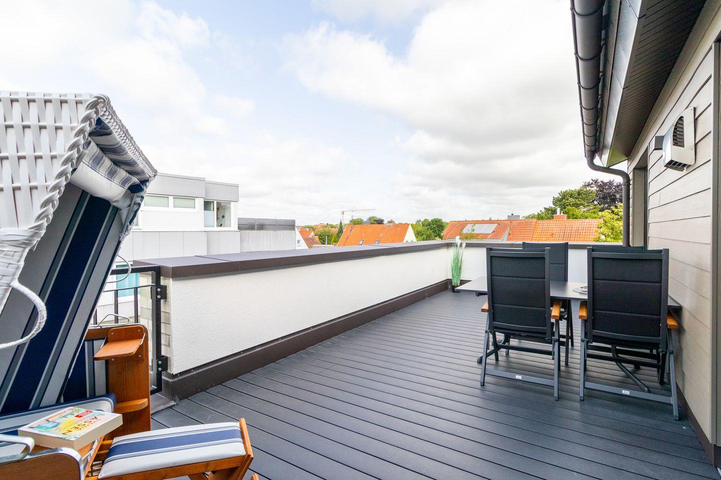Eine große Dachterrasse (Süd-/Westausrichtung) mit Strandkorb und Gartenmöbeln und eine zweite Dachteraase (Ostausrichtung) mit Tisch und Sitzgelegenheiten laden zu jeder Tageszeit zu Sonne, Meerluft und Entspannung ein.