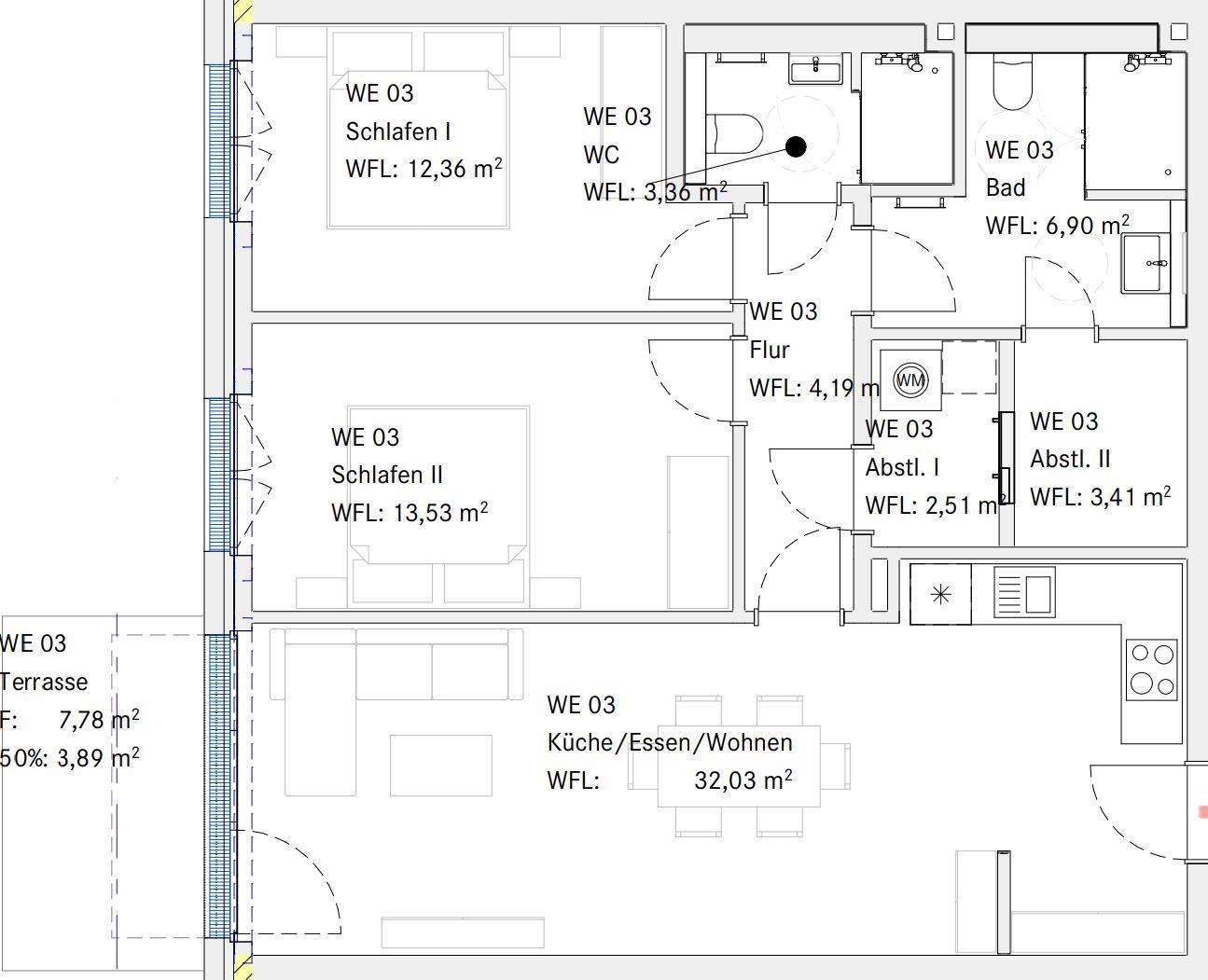 Von hier aus gelangen Sie direkt auf die möblierte Terrasse – perfekt für sonnige Frühstücke, entspannte Nachmittage oder laue Abende unter freiem Himmel. Für zusätzlichen Komfort und angenehmes Raumklima sorgen elektrische Außenjalousien an allen Fenstern.