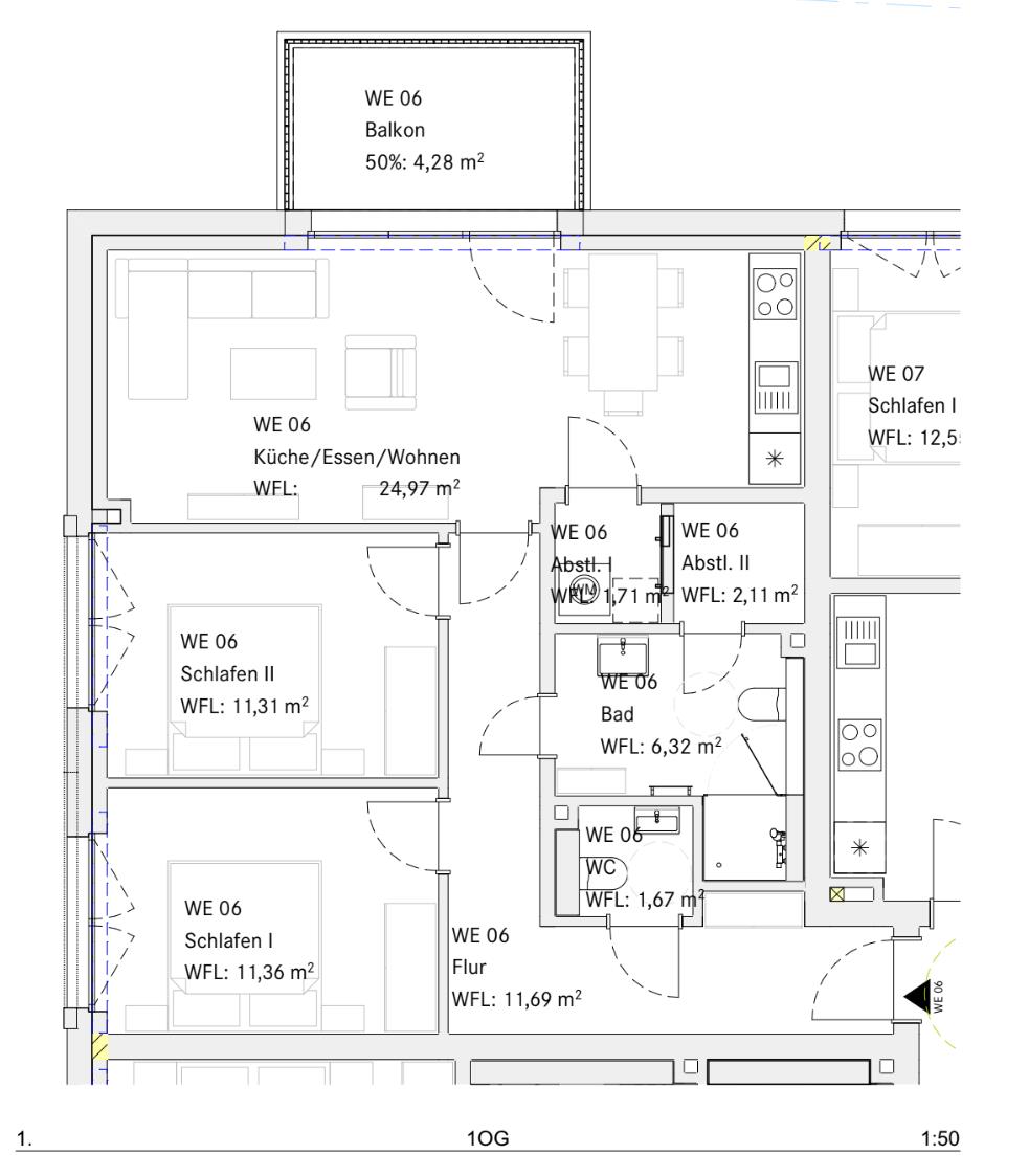 Der offen gestaltete Wohn- und Essbereich mit gemütlicher Sofaecke und TV lädt zum Entspannen ein. Die voll ausgestattete Küche bietet alles, was Sie für gemeinsame Mahlzeiten benötigen – ob zum Frühstück auf dem möblierten Balkon oder zum Kochen am Abend. Außenjalousien sorgen für angenehmes Raumklima und Privatsphäre.