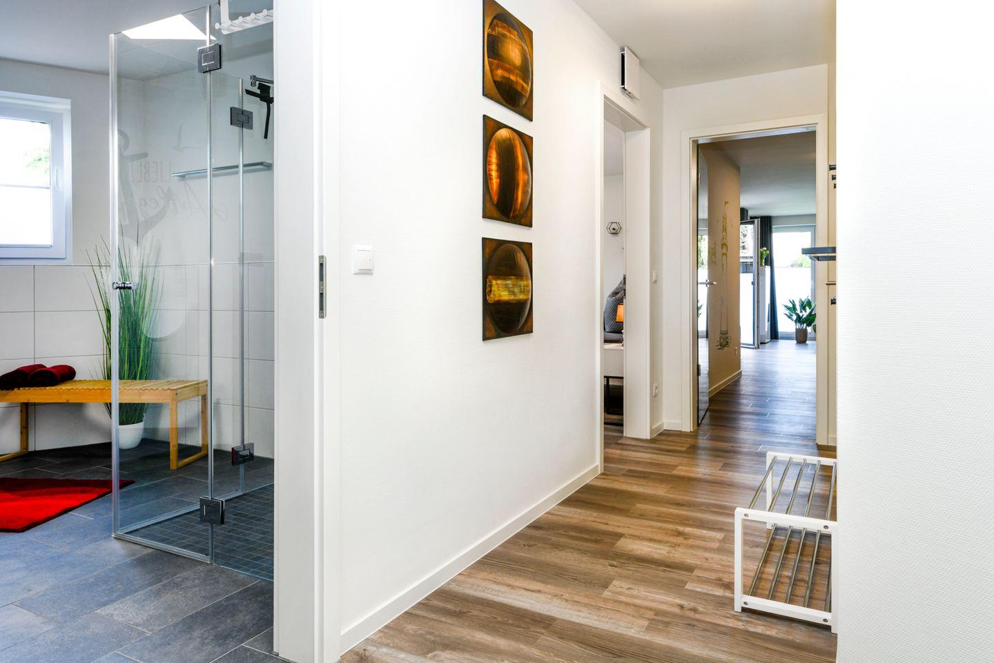Das moderne Bad mit Tageslicht und ebenerdiger Dusche besticht durch sein stilvolles Design. Highlight ist die private Sauna, in der du nach einem Strandspaziergang wunderbar entspannen kannst.