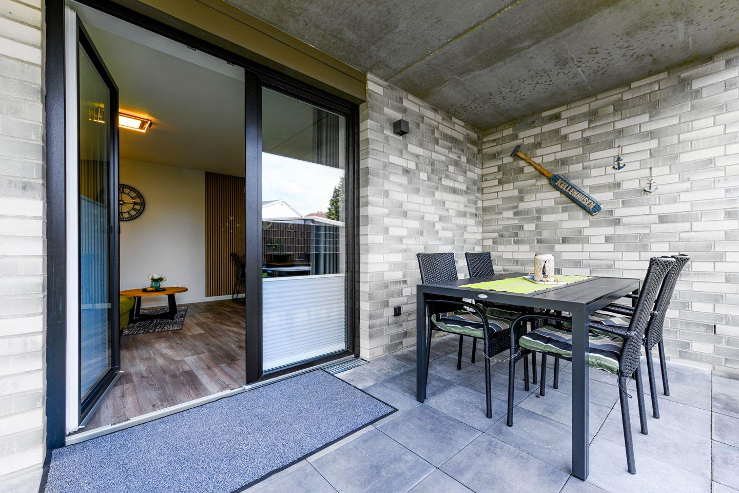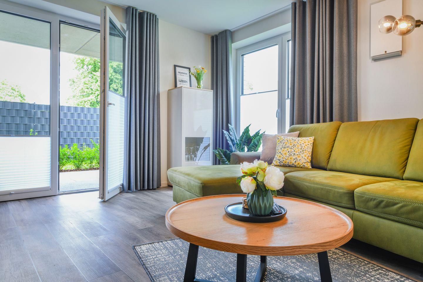 Der lichtdurchflutete Wohnbereich mit großen Fenstern führt direkt auf die überdachte Terrasse – perfekt für ein gemütliches Frühstück im Freien oder entspannte Abende an der frischen Luft. Die offene, voll ausgestattete Küche macht gemeinsames Kochen zum Vergnügen, während die Wohnraumlüftung für ein angenehmes Klima sorgt.