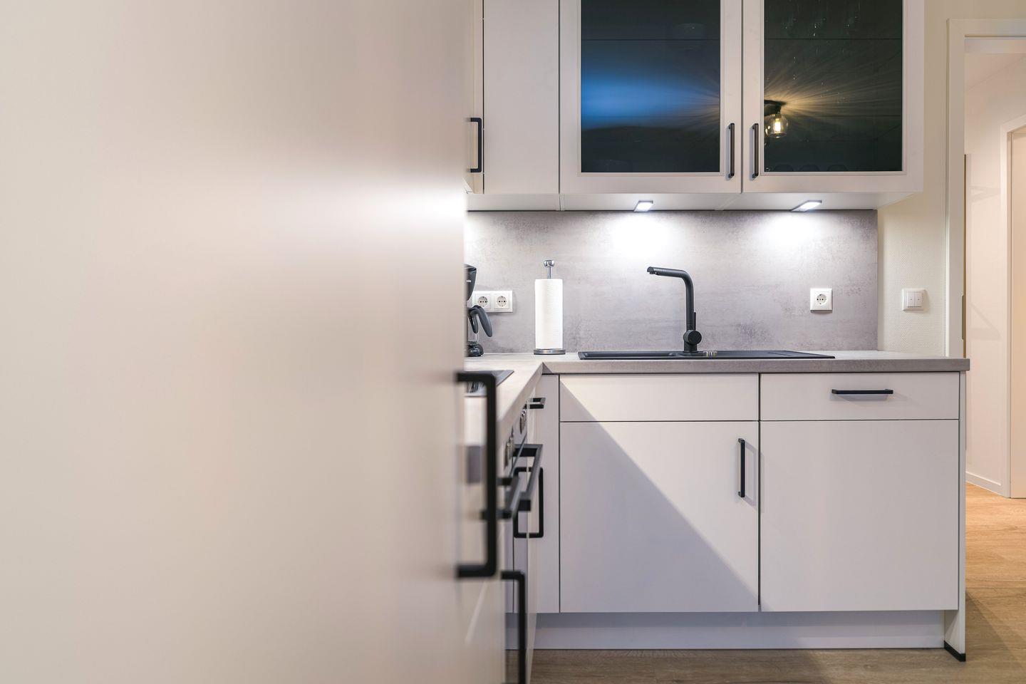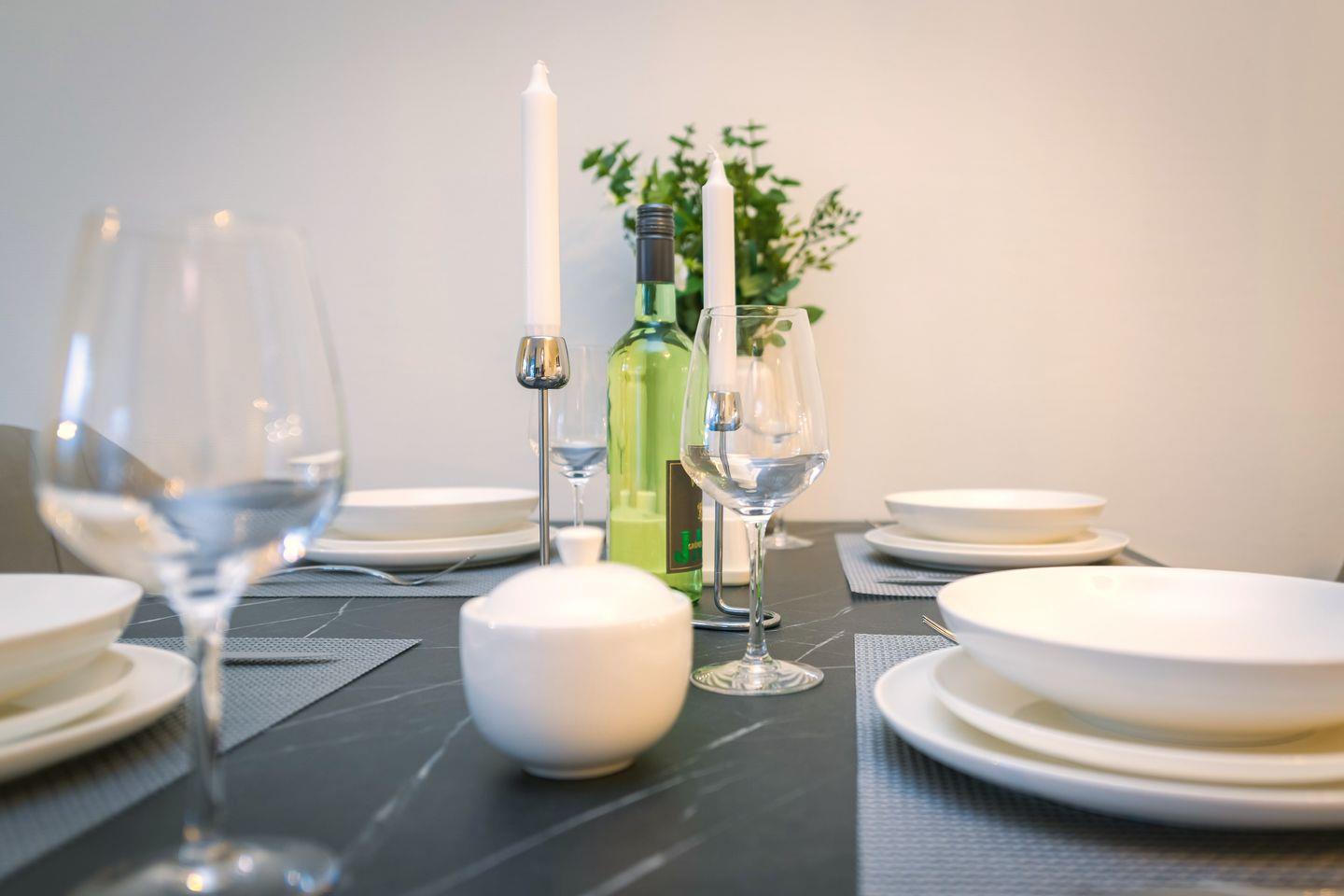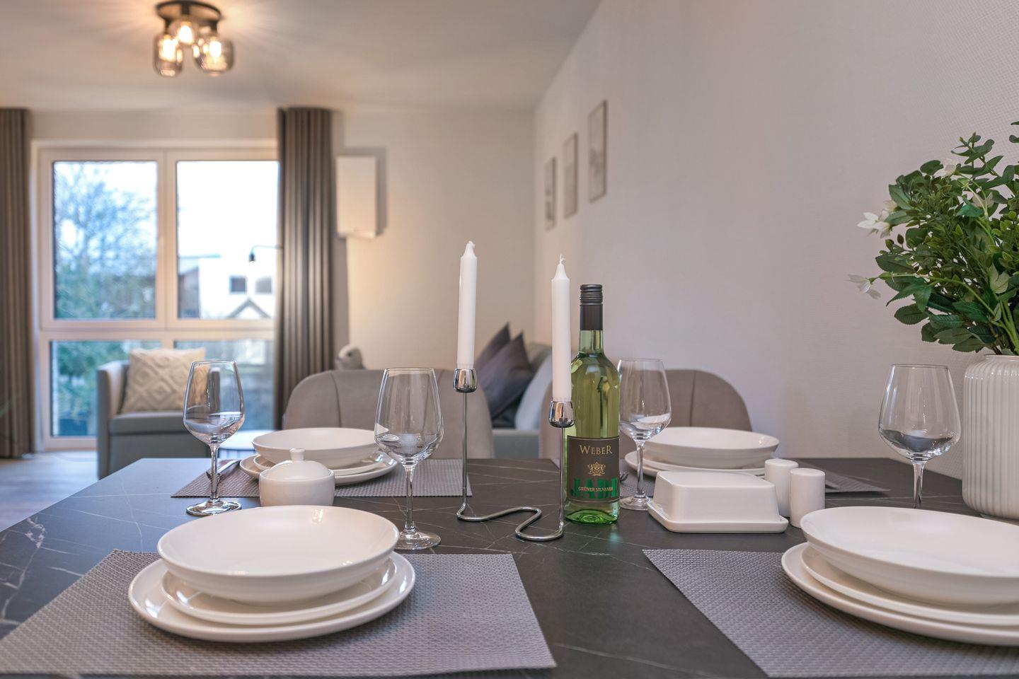 Der offen gestaltete Wohnbereich bietet viel Platz für gemeinsame Urlaubszeit. Die gemütliche Sofalandschaft mit Sessel lädt zum Entspannen ein, während der Smart-TV für Unterhaltung am Abend sorgt. Große Fenster lassen viel Tageslicht in den Raum und führen direkt auf den Balkon. Die moderne Küche ist offen in den Wohnraum integriert und komplett ausgestattet. Der Essbereich bietet einen schönen Platz für gemeinsame Mahlzeiten und gesellige Stunden.
