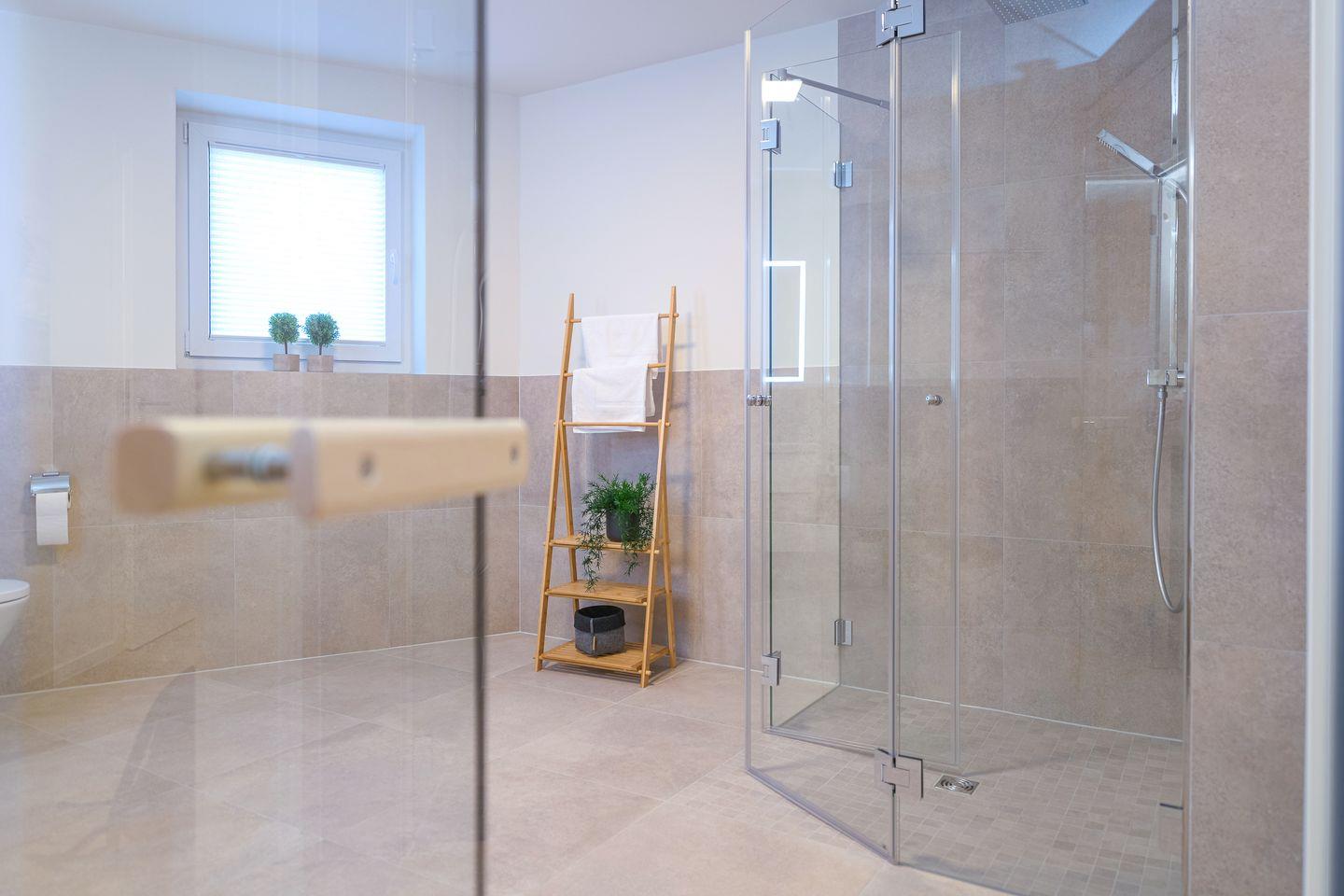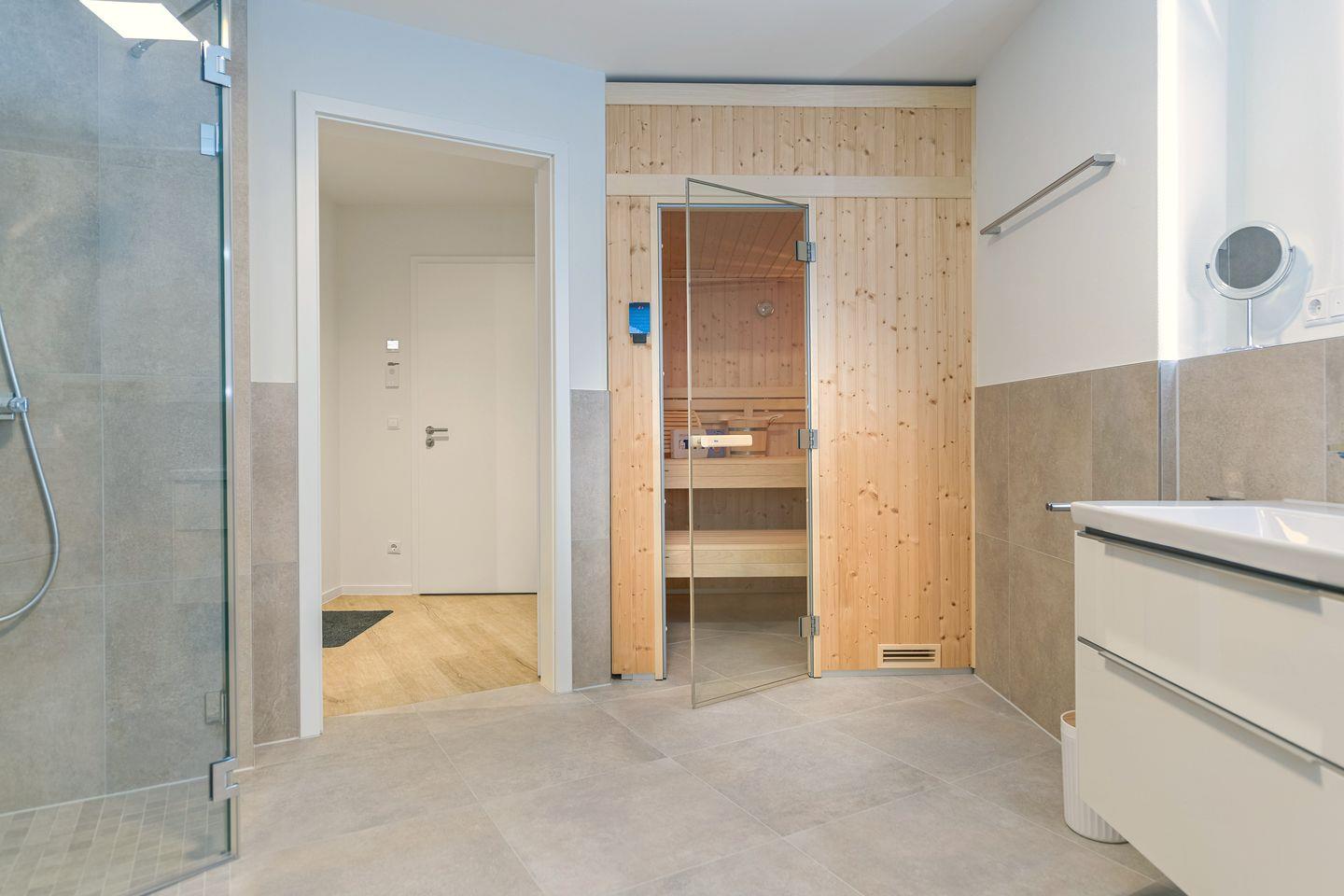 Das Bad überzeugt mit einer bodentiefen Dusche und eurer privaten Sauna als besonderem Highlight. Nach einem Tag am Meer entspannt ihr hier in wohltuender Wärme und lasst den Abend ganz in Ruhe ausklingen.