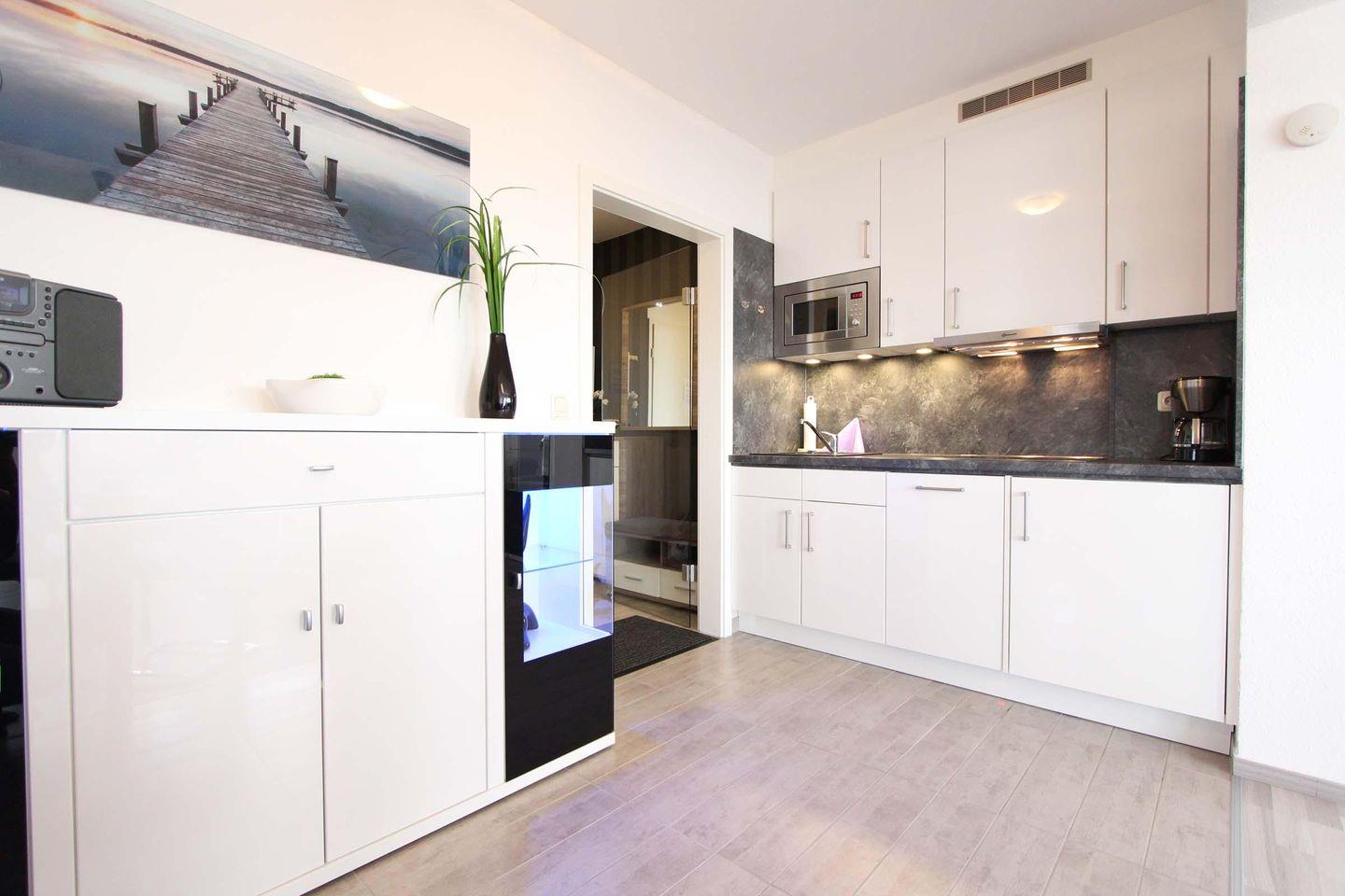 Sie suchen für die schönsten Wochen im Jahr etwas Besonderes ? Dann sind Sie hier genau richtig! Die 2-Zimmer-Wohnung Oceanview im 1. Stock im Kaiserhof ist modern und komfortabel eingerichtet. Das Highlight ist der Eckbalkon mit modernem WPC Belag und perfekter Sicht auf die Ostsee. Von dem Balkon aus können Sie die Sonne von morgens bis fast zum Sonnenuntergang genießen. Die 55 qm große Wohnung bietet Ihnen ein großzügiges Schlafzimmer mit Doppelbett (2 Matratzen á 0,90x2,00m) und 2. Fernseher, ein Wohnzimmer mit offener Küche und einer integrierten Essecke, Flur und Bad mit Dusche und Toilette. Die Küche ist u.a. mit Geschirrspüler und Mikrowelle ausgestattet. Im Wohnzimmer befindet sich eine komfortable Ledercouch mit Rundecke, die zum Kuscheln einlädt. W-LAN ist selbstverständlich kostenlos für Sie. Eine Bluetooth Mini-Stereoanlage mit USB Anschluss, ein Festplattenrecorder und ein 55 Zoll Ultra HD Fernseher mit 3-fach Ambilight, auf dem Sie Ihren Netflix oder Prime Account genießen können, runden das Technikpaket im Oceanview ab. Im Nachbarhaus steht Ihnen gegen Gebühr eine Waschmaschine und ein Wäschetrockner zur Verfügung.