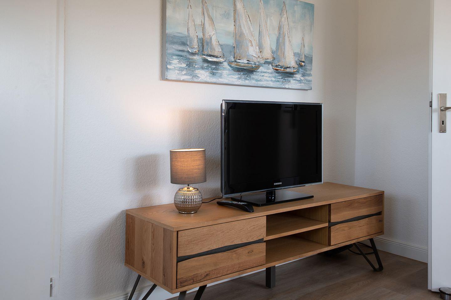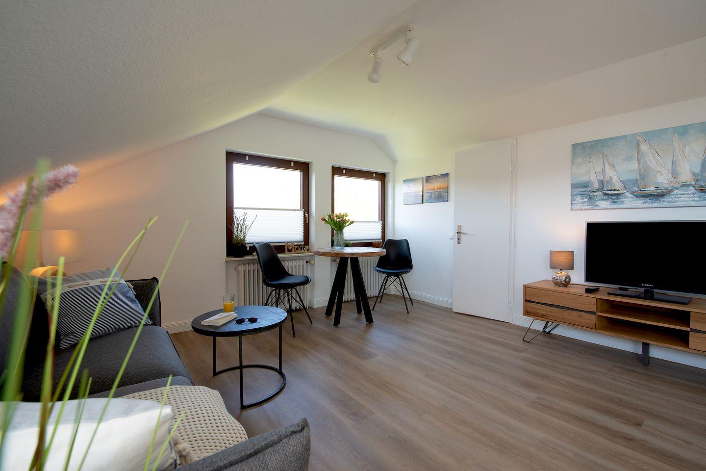 Der Wohnbereich ist gemütlich eingerichtet und kombiniert ein komfortables Sofa, einen Esstisch sowie eine funktionale Küchenzeile – ideal für entspannte Tage in maritimer Atmosphäre.