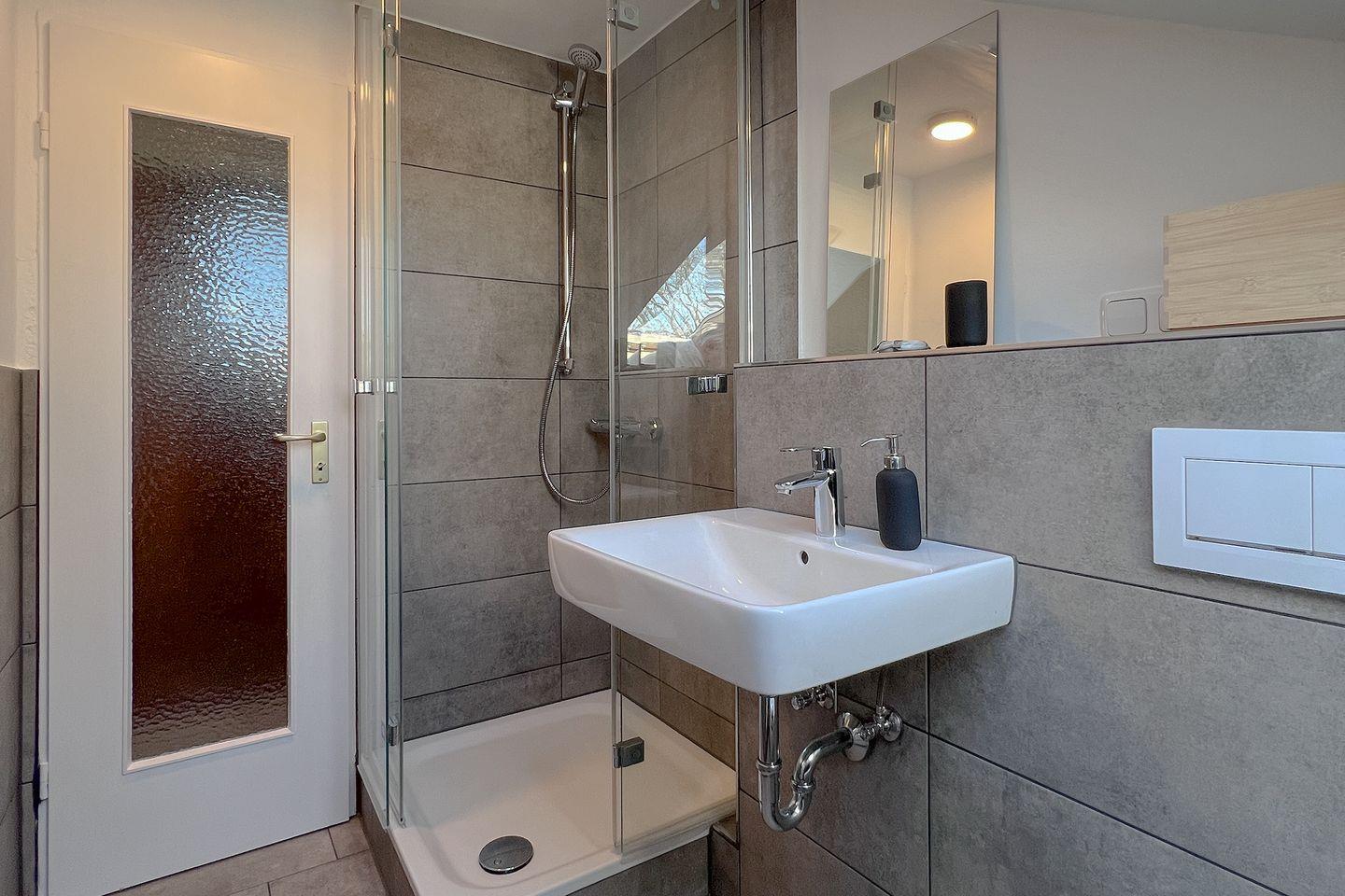 Das modern geflieste Badezimmer überzeugt mit einem großen Fenster, einer Duschkabine und stilvollen grauen Fliesen.