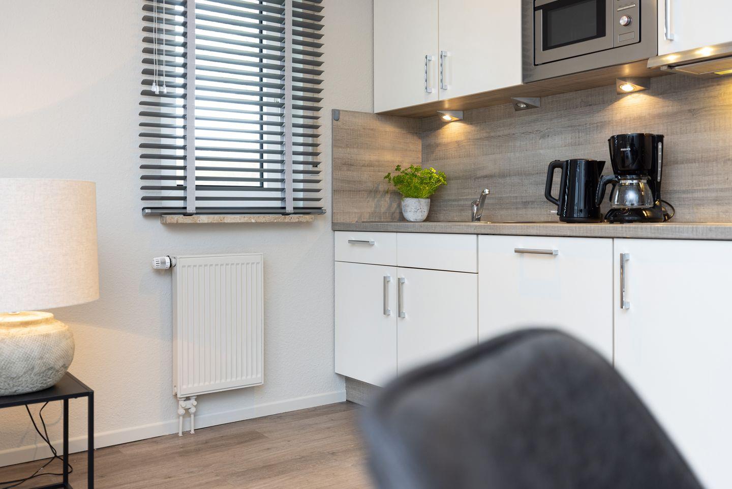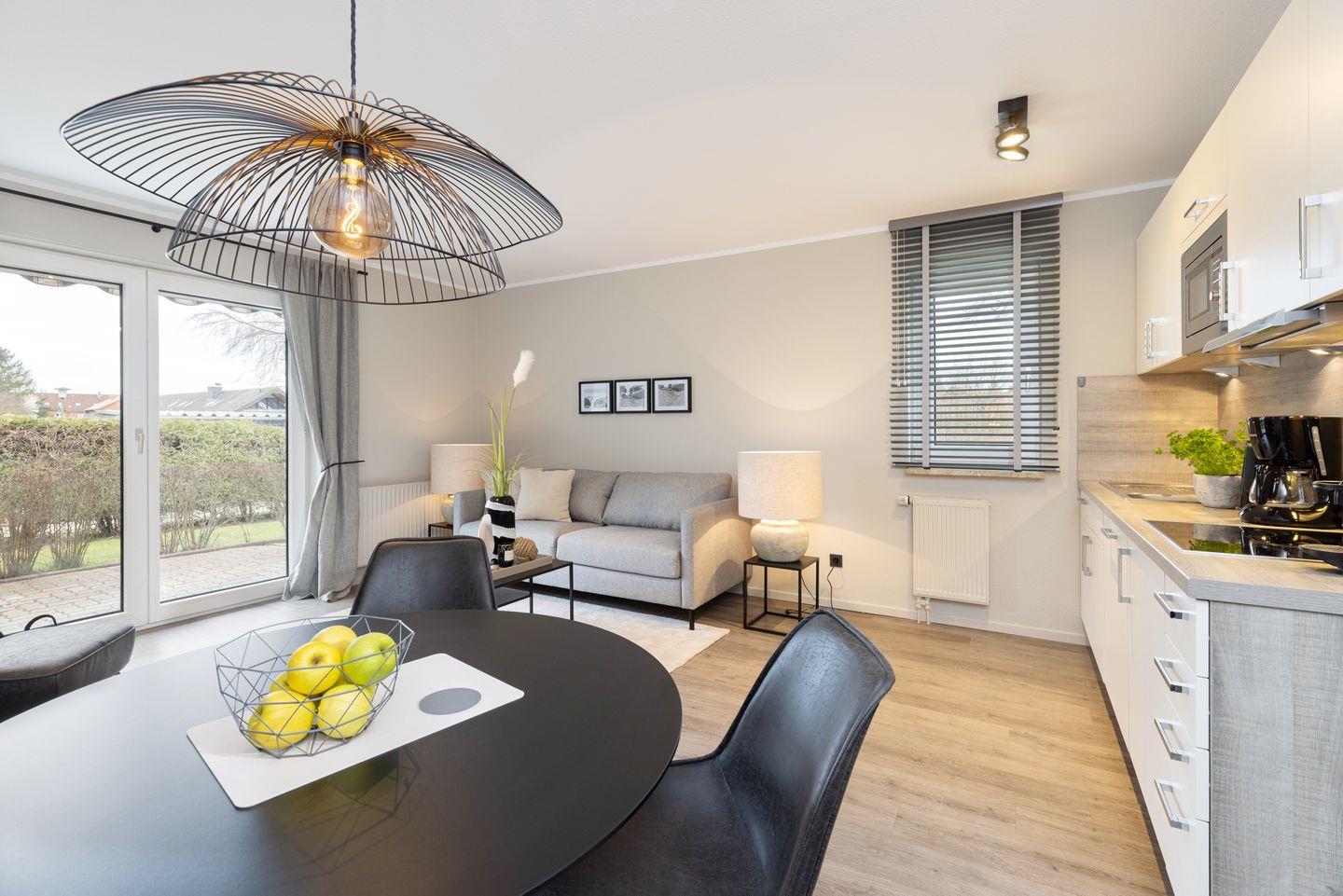 Die Wohnung 1 liegt im Erdgeschoss und ist ca. 45 qm groß. Der Wohnbereich ist offen und hell gestaltet durch eine schöne Fensterfront zum Garten. Integriert im Wohnbereich sind der Essbereich und die Küchenzeile mit Geschirrspülmaschine und Mikrowelle.