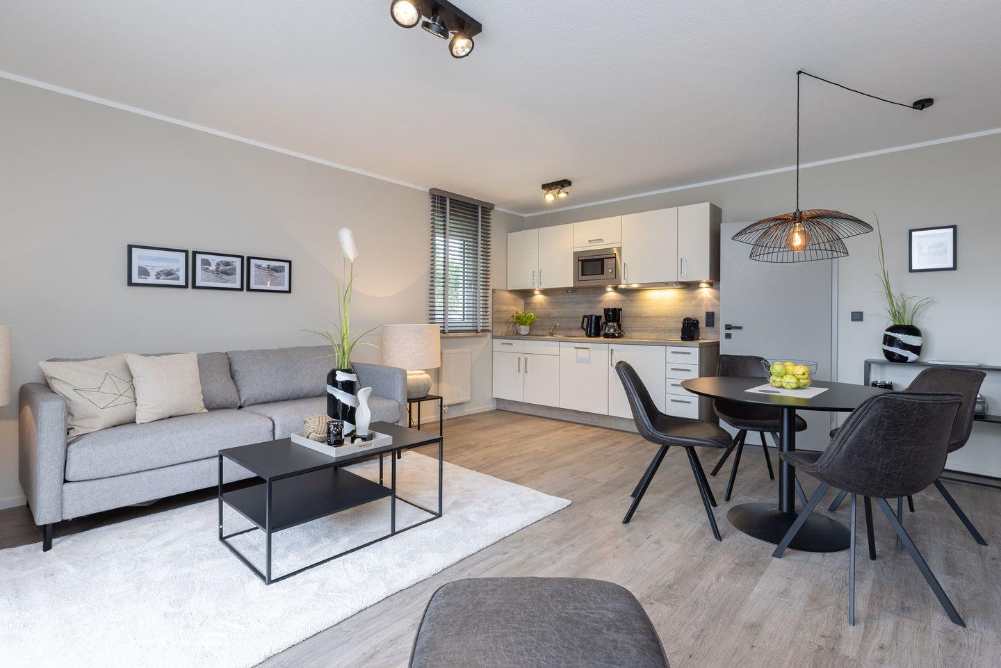 Die ebenerdige Ferienwohnung Meisenweg 12 Whg. 1 EG bietet auf 45 m² Platz für bis zu vier Personen und liegt nur 400 Meter vom Sandstrand entfernt. Sie verfügt über eine offene Küche, ein separates Schlafzimmer, ein modernes Duschbad und eine überdachte Terrasse mit Gartenmöbeln. WLAN, Zentralheizung sowie ein eigener Parkplatz sind vorhanden. Haustiere sind willkommen.