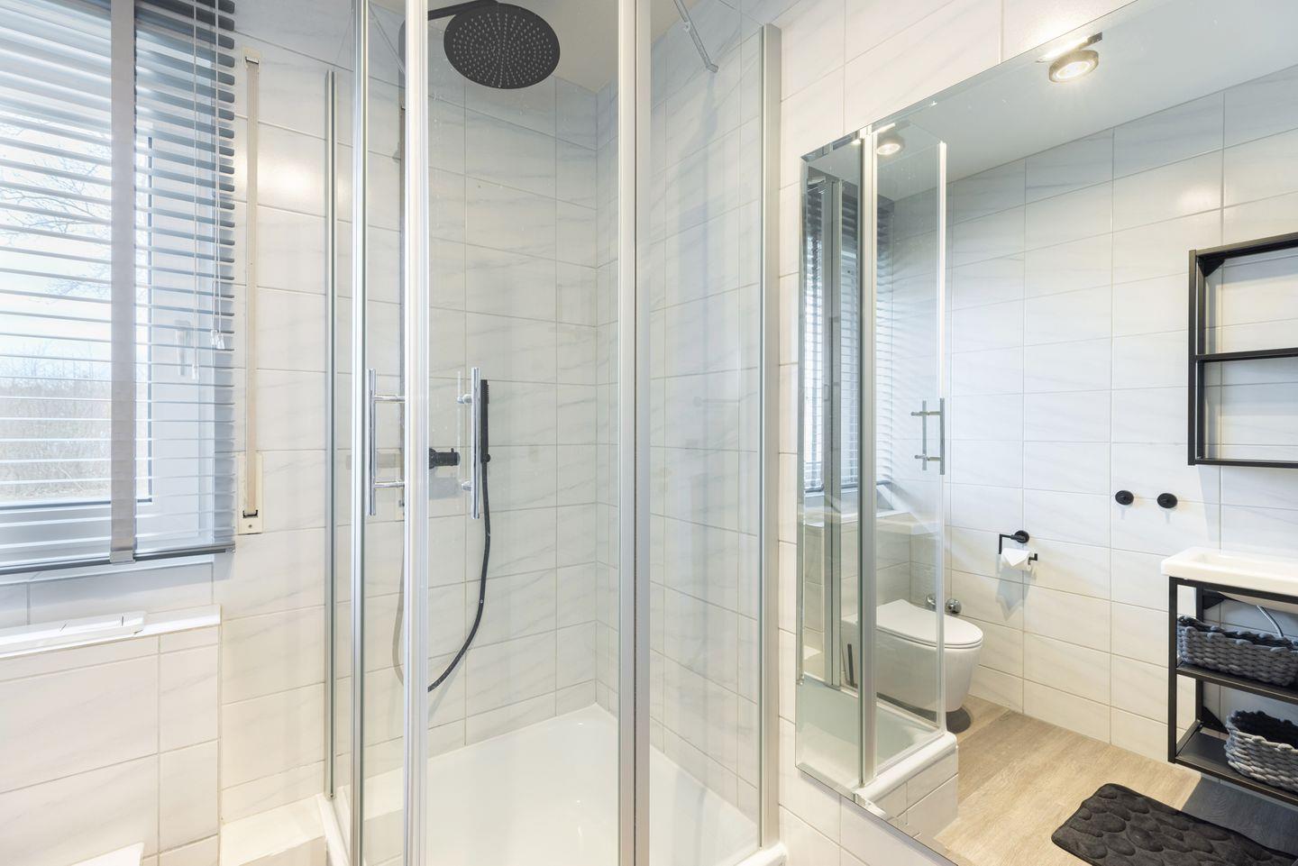 Das Badezimmer ist mit Duschkabine und hellen Fliesen gestaltet. Die sonnige Terrasse der Wohnung ist nach Süd-Westen ausgerichtet und zusätzlich ist der Garten gemeinschaftlich zu nutzen.
