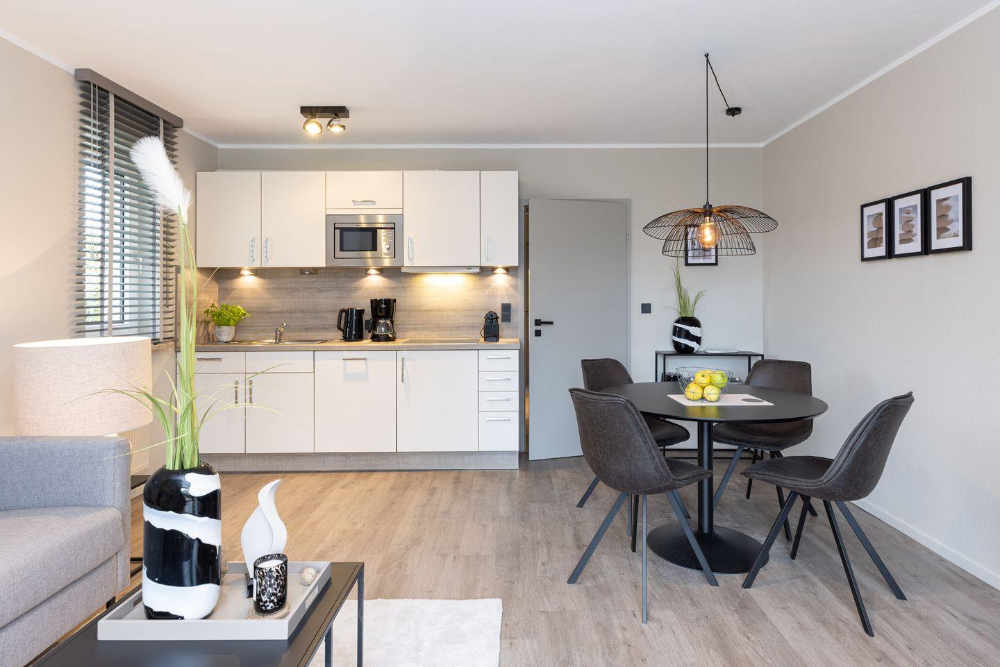 Die Wohnung 3 liegt im Erdgeschoss und ist ca. 45 qm groß. Der Wohnbereich ist offen und hell gestaltet durch eine schöne Fensterfront zum Garten. Integriert im Wohnbereich sind der Essbereich und die Küchenzeile mit Geschirrspülmaschine und Mikrowelle.