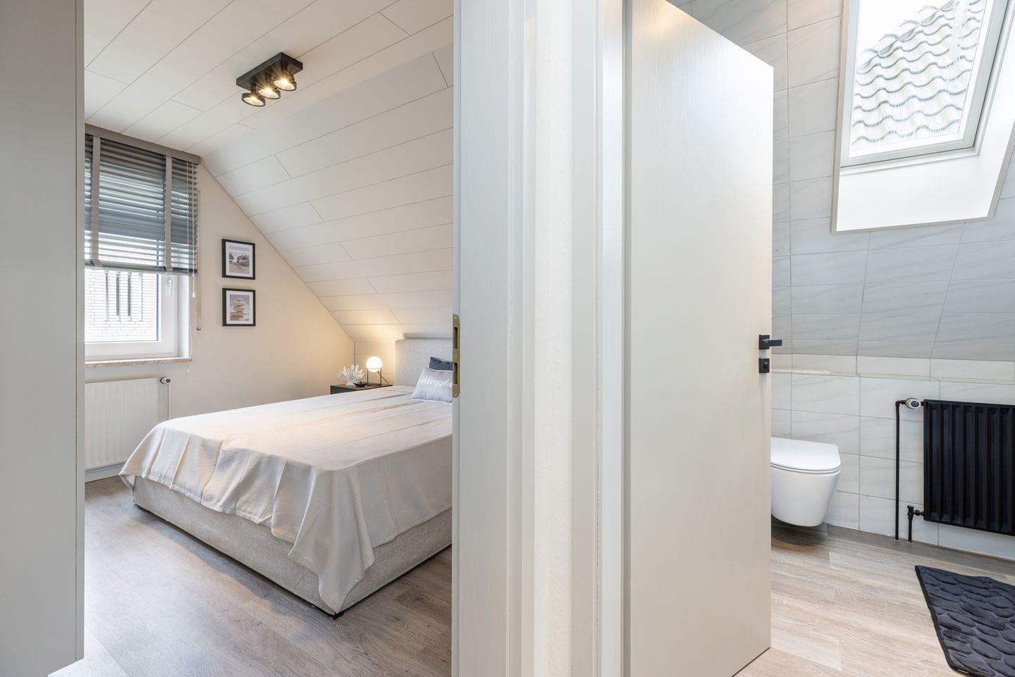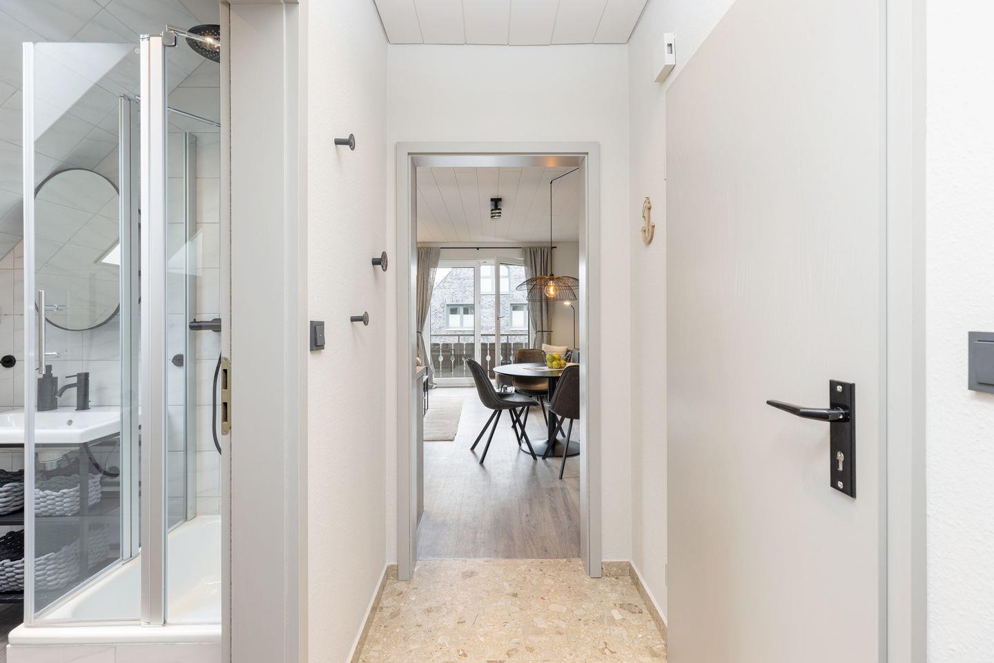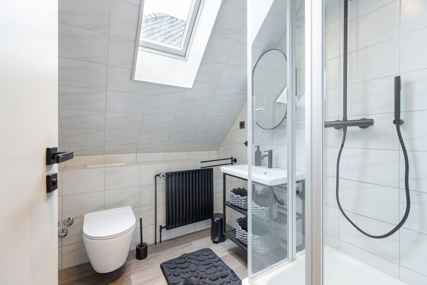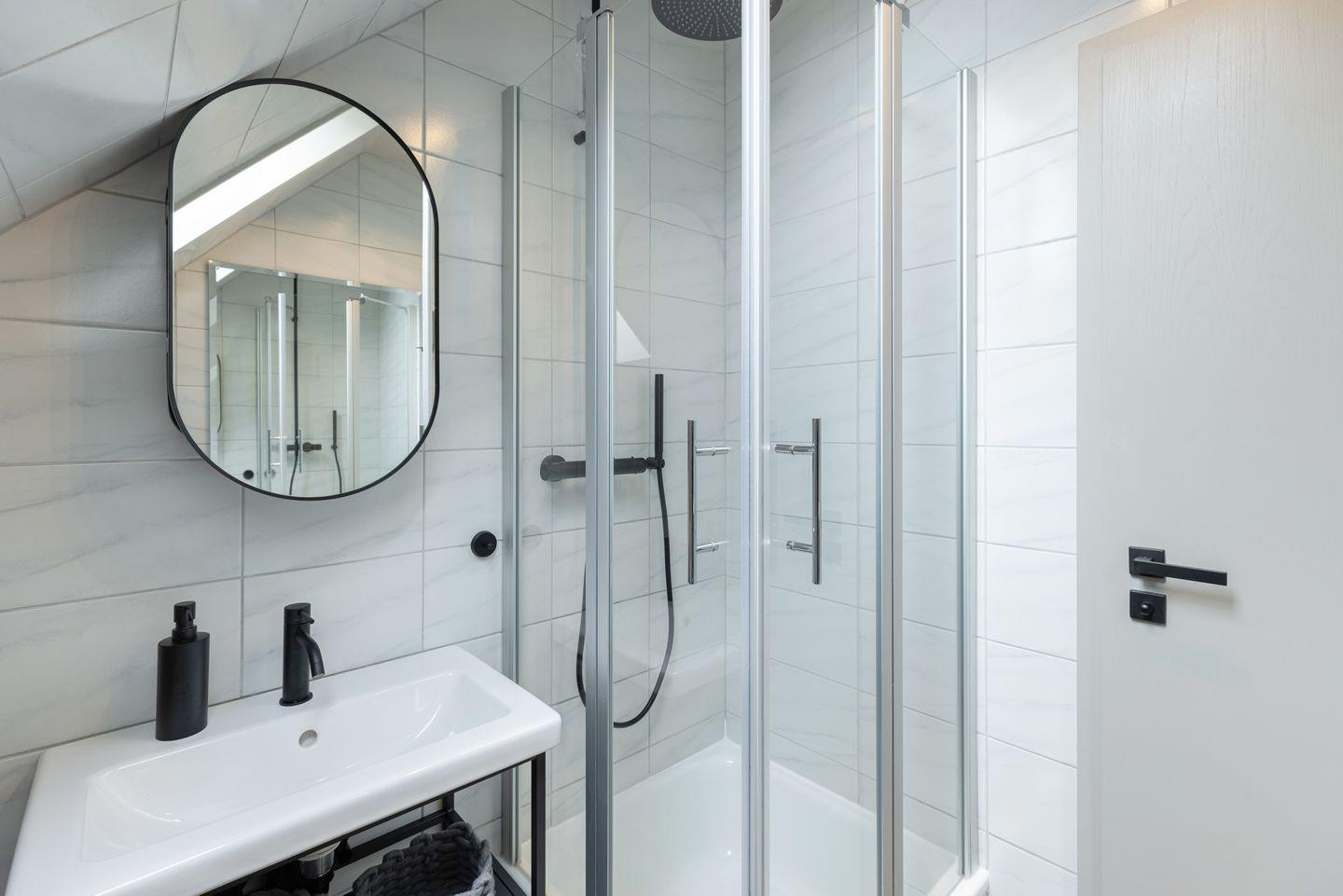 Das Badezimmer ist mit Duschkabine und hellen Fliesen gestaltet.