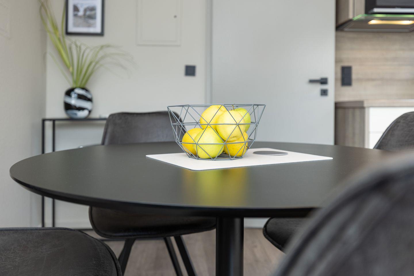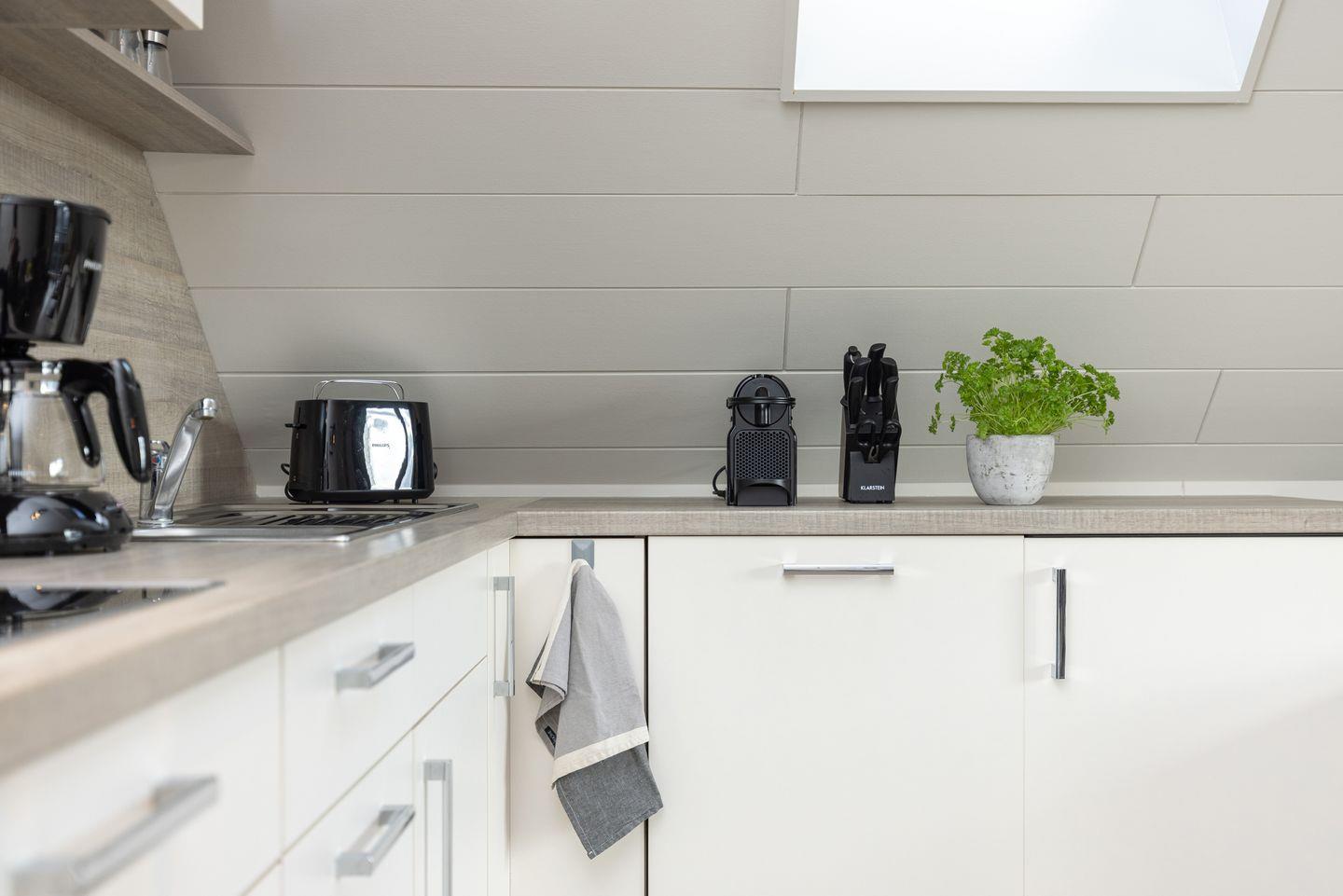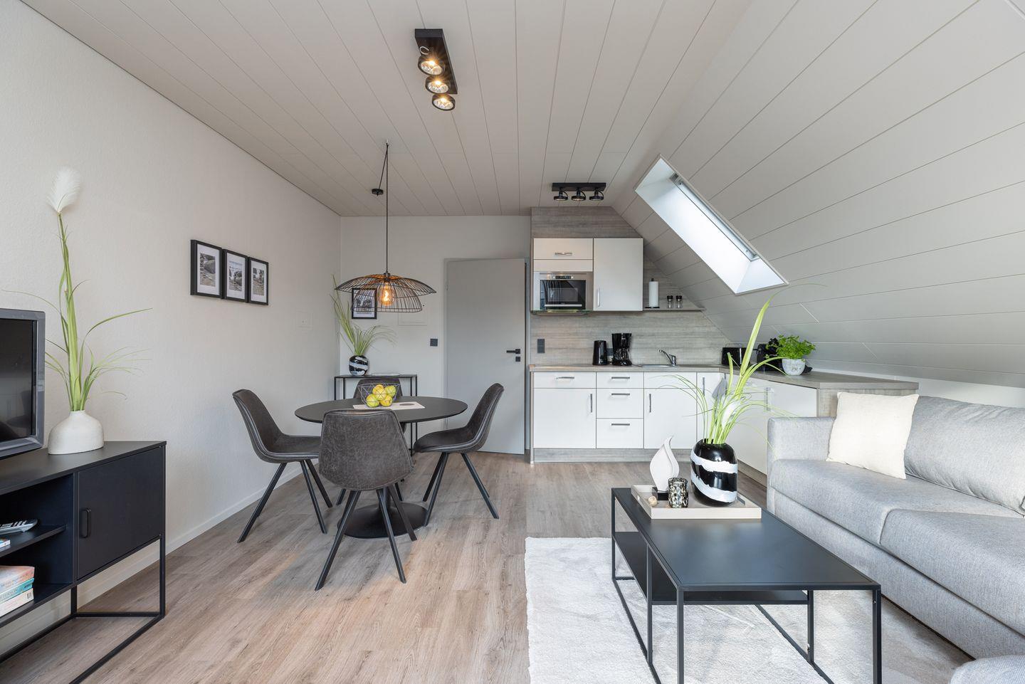 Die Wohnung 4 liegt im Obergeschoss und ist ca. 40 qm groß. Der Wohnbereich ist offen und hell gestaltet durch eine schöne Fensterfront zum Balkon. Integriert im Wohnbereich sind der Essbereich und die Küchenzeile mit Geschirrspülmaschine und Mikrowelle.