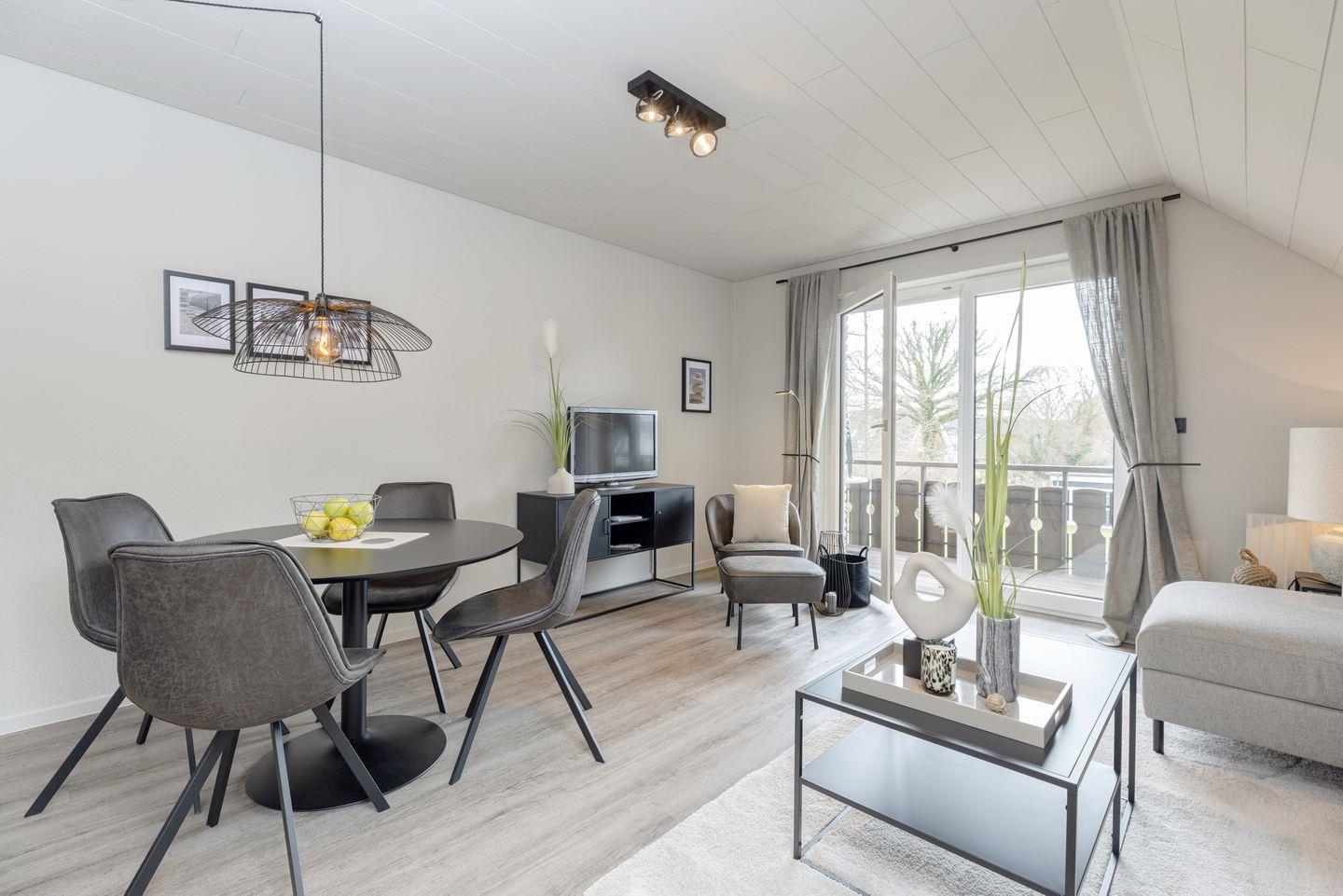 Die Wohnung 6 liegt im Obergeschoss und ist ca. 40 qm groß. Der Wohnbereich ist offen und hell gestaltet durch eine schöne Fensterfront zum Balkon. Integriert im Wohnbereich sind der Essbereich und die Küchenzeile mit Geschirrspülmaschine und Mikrowelle.