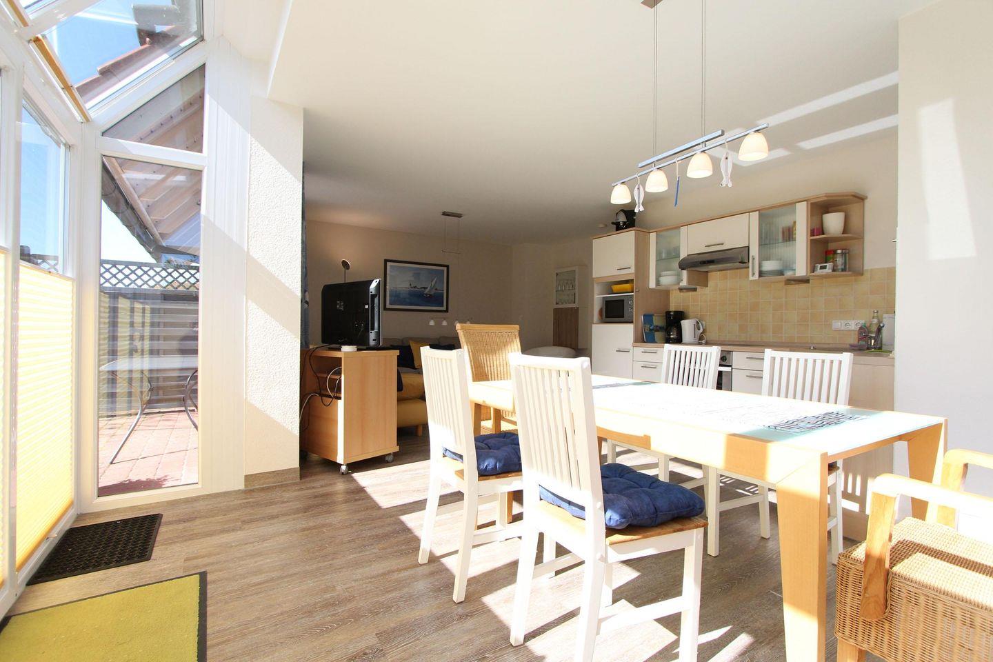 Passend zu Kellenhusen und dem Spruch "zwischen Wald und Wellen" gibt es auch die Doppelhaushälfte "Welle". Ruhig und dennoch zentral gelegen ist das Objekt mit ca. 100 qm für bis zu 6 Personen geeignet. Im Erdgeschoss befindet sich der helle Wohnbereich mit integrierter Küche, Essbereich und angeschlossenem Wintergarten für gemütlich Abende macht die Entspannung noch perfekt. Zum Kochen bietet die Küche einen Backofen, eine Mikrowelle, ein Gefrierfach im Kühlschrank und auch eine Geschirrspülmaschine. Das im Erdgeschoss liegende Badezimmer ist mit Dusche ausgestattet und barrierearm. Außerdem ist auch eines der Schlafzimmer unten gelegen, dieses ist mit einem Doppelbett (2 Matratzen á 0,90x2,00m) ausgestattet. In der oberen Etage befindet sich ein weiteres Badezimmer und zwei Schlafräume. Einmal mit Doppelbett (2 Matratzen á 0,90x2,00m), Fernseher und Schrank, sowie einmal mit zwei Einzelbetten (0,90x2,00m) und Schrank. Für die ganz kleinen Gäste gibt es ein Kinder-Reisebett und einen Hochstuhl. Der Garten und die Terrasse haben Süd-West-Lage und sind somit bestens gelegen. Aber auch der schöne Strand von Kellenhusen ist nur wenige Meter entfernt und kann mit einem 3 minütigen Spaziergang erreicht werden. Dem Urlaub mit dem Haustier steht generell nichts im Wege, denn nach Rücksprache und gegen Aufpreis sind Haustiere gestattet. Sollte das Reisegepäck so gering wie möglich ausfallen, dann ist ein Wäschepaket für den Aufenthalt in Kellenhusen gegen Gebühr einfach buchbar und auch eine Waschmaschine und ein Trockner sind in der Wohnung vorhanden.