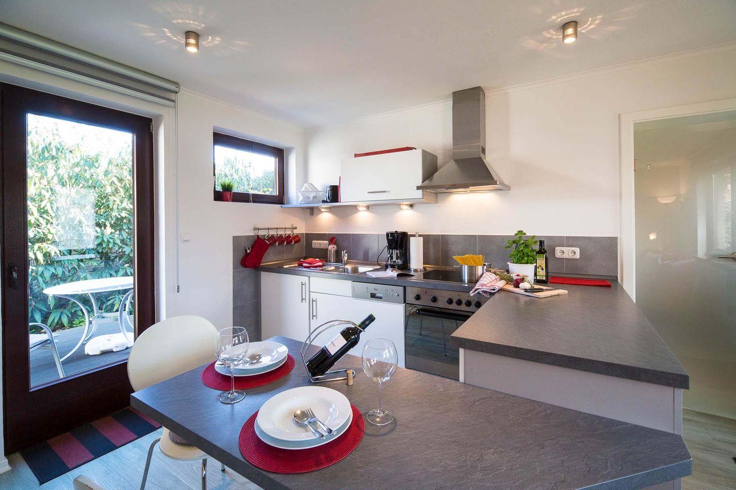 Im Anbau des Hauses Timpe befindet sich diese schöne Erdgeschosswohnung mit ca. 40 qm für max. 2 Personen. Der offene Wohnbereich vereint die Küche, den Essbereich und eine gemütliche Sitzecke. In die Küchenzeile integriert sind Geschirrspüler und Backofen. Das separate Schlafzimmer ist freundlich und modern eingerichtet und verfügt über ein Doppel-Boxspringbett (Topperauflage 180x200). Auch das Badezimmer ist schick gehalten und verfügt über eine begehbare Dusche. Die Wohnung verfügt über 2 Terrassen, davon ist eine überdacht. Der Garten des Hauses kann mitbenutzt werden.