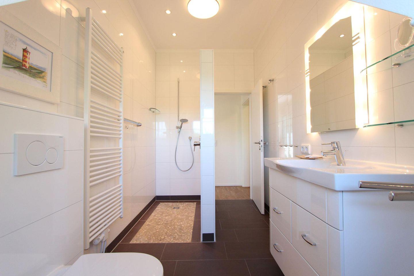 Das moderne Tageslichtbad verfügt über eine bodengleiche Dusche, zusätzlich steht ein separates Gäste-WC zur Verfügung – besonders komfortabel bei mehreren Personen.