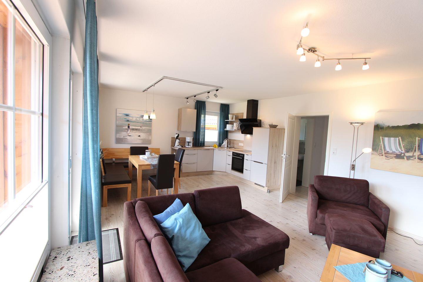 Das Haus Heckenrose bietet mehrere Wohnungen, zum einen diese ca. 50 qm große Erdgeschosswohnung für max. 2 Personen. Der offene Wohnbereich ist sehr geschmackvoll, schick und gemütlich eingerichtet. Auch der schicke Kaminofen ist noch ein Highlight des Raumes. Die sehr schicke und hochwertige Küche ist gemeinsam mit dem Esstisch im Wohnbereich integriert. Das große Ceranfeld, der Geschirrspüler, der Backofen und zusätzlich zu der normalen Kaffeemaschine auch eine Senseo-Maschine runden die schicke Küche ab. Das Schlafzimmer bietet ein hochwertiges Doppelbett (2 Matratzen á 0,90x2,00m). Ebenfalls verfügt die Wohnung über ein schönes Duschbad. Außerdem steht der Garten auch allen Gästen des Hauses zur Verfügung. Mitgebrachte Fahrräder können ebenfalls im Garten abgestellt werden. Bis zum Kellenhusenser Sandstrand sind es nur 6 Gehminuten. Auch dem Urlaub mit dem Haustier steht generell nichts im Wege, denn nach Rücksprache und gegen Aufpreis sind Haustiere gestattet. Sollte das Reisegepäck so gering wie möglich ausfallen, dann ist ein Wäschepaket für den Aufenthalt in Kellenhusen gegen Gebühr einfach buchbar und auch eine Waschmaschine und ein Trockner können gebührenpflichtig in dem Haus genutzt werden.