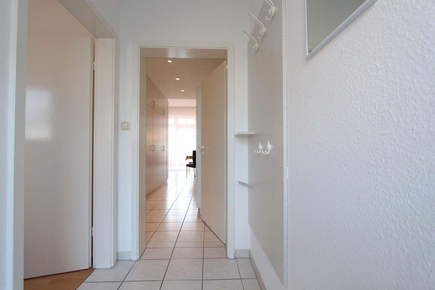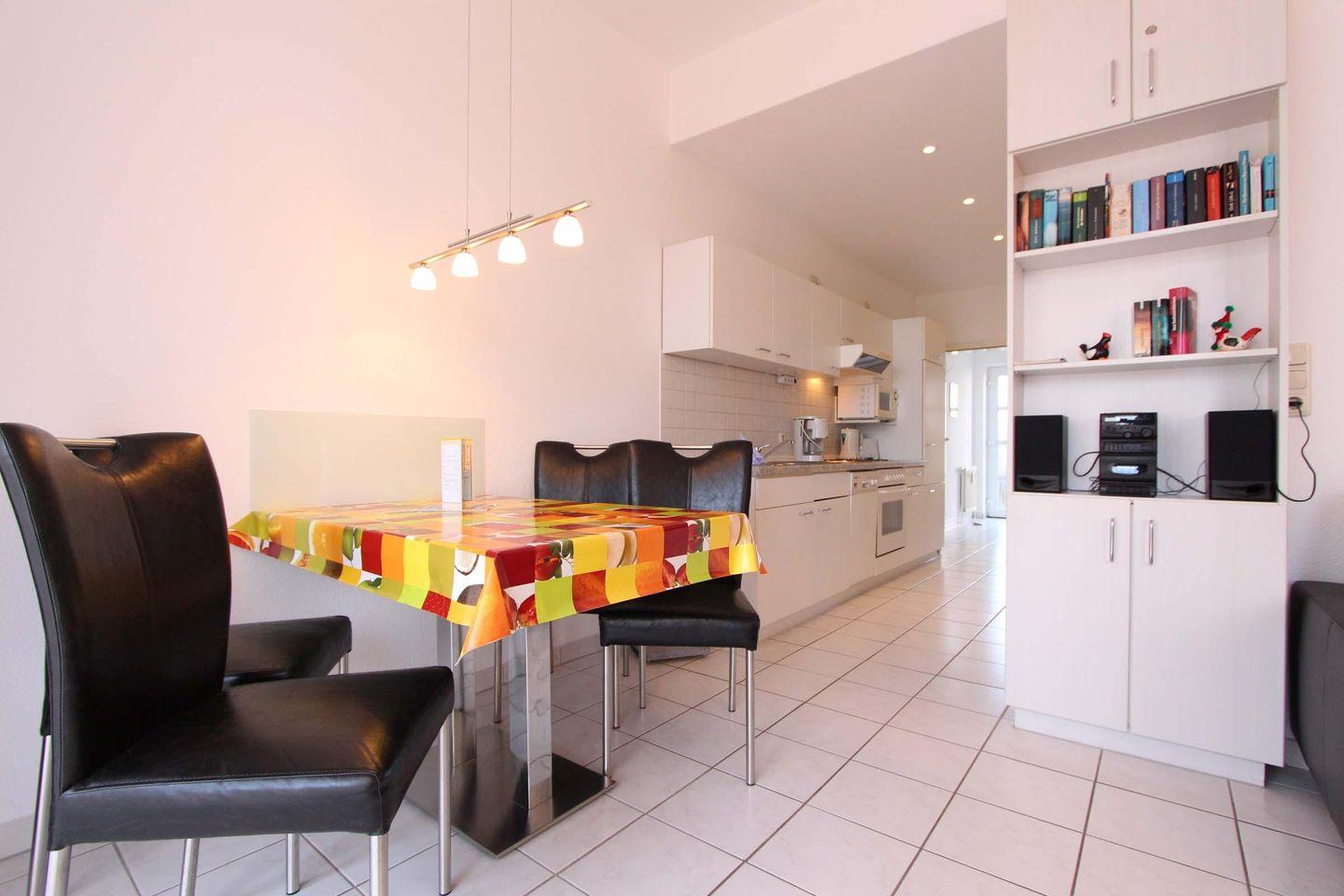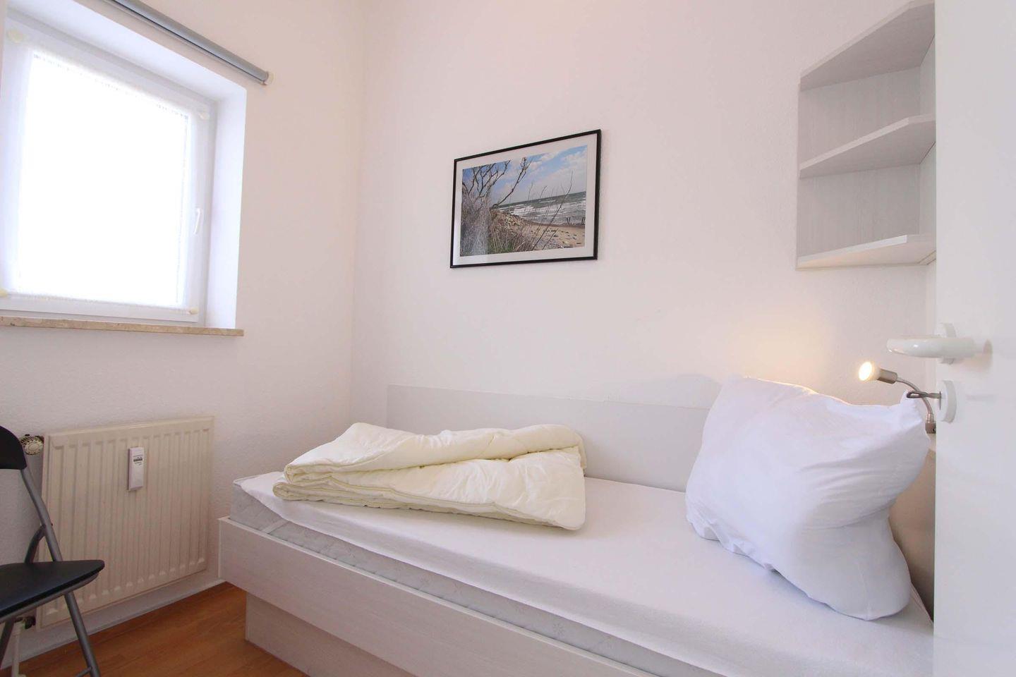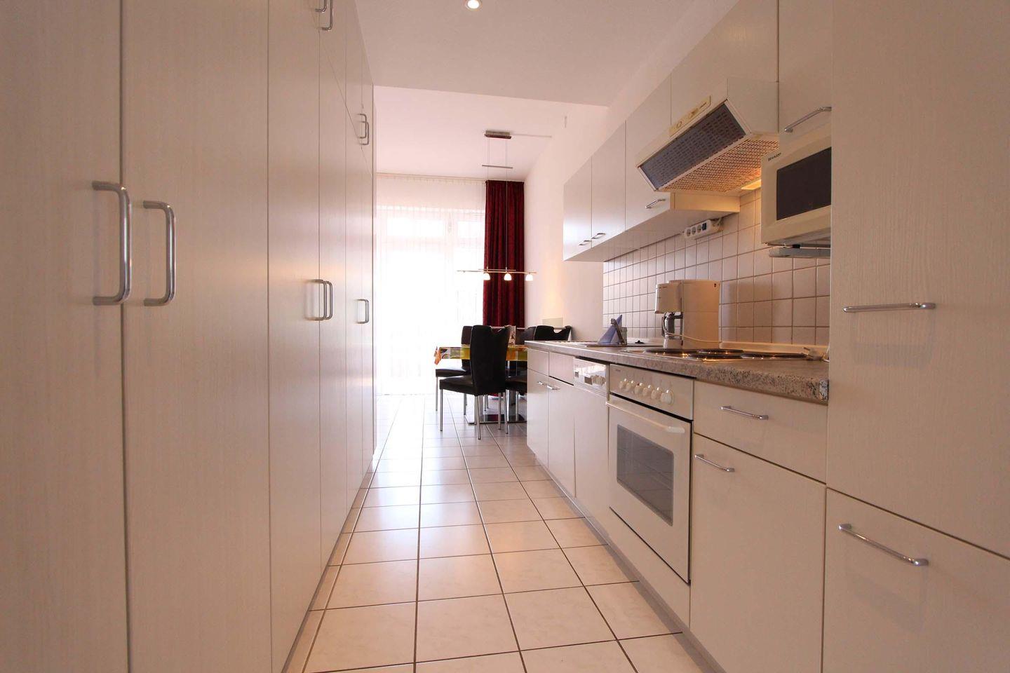 Im Herzen von Kellenhusen liegt die Wohnresidenz. In dieser Wohnanlage befindet sich auch die Wohnung 14, welche mit 55 qm Erdgeschoss liegt. Das Wohnzimmer ist mit einer großzügigen Sofaecke eingerichtet. Außerdem befindet sich hier der Essbereich und die Küche mit einem Geschirrspüler und einer Mikrowelle im hellen Wohnbereich. Die zwei separaten Schlafzimmer sind beide sehr gemütlich und schön gestaltet. Im größeren Zimmer steht ein Doppelbett (2 Matratzen á 0,90x2,00m) und ein Kleiderschrank. Das zweite Zimmer ist bestens für eine Person ausgestattet und verfügt über ein Einzelbett (0,80x2,00m). Das Badezimmer der Wohnung ist barrierefrei gehalten, die Dusche ist ebenerdig und mit Griff ausgestattet. Die schöne, sonnige Terrasse ist Richtung Süd-Osten gelegen und teilweise überdacht. Bei dieser Wohnung liegt das schöne so nah, denn die Ostsee erreicht man schon innerhalb von 2 Gehminuten. Auch dem Urlaub mit dem Haustier steht generell nichts im Wege, denn nach Rücksprache und gegen Aufpreis sind Haustiere gestattet. Für mitgebrachte Fahrräder ist im Keller ein Abstellraum vorhanden. Sollte das Reisegepäck so gering wie möglich ausfallen, dann ist ein Wäschepaket für den Aufenthalt in Kellenhusen gegen Gebühr einfach buchbar ebenso stehen im Haus Waschmaschine und Trockner gebührenpflichtig zur Verfügung.