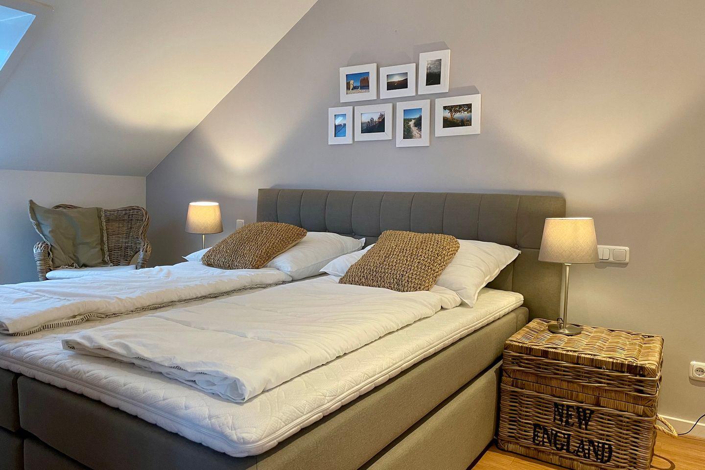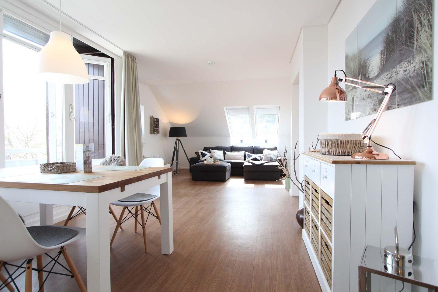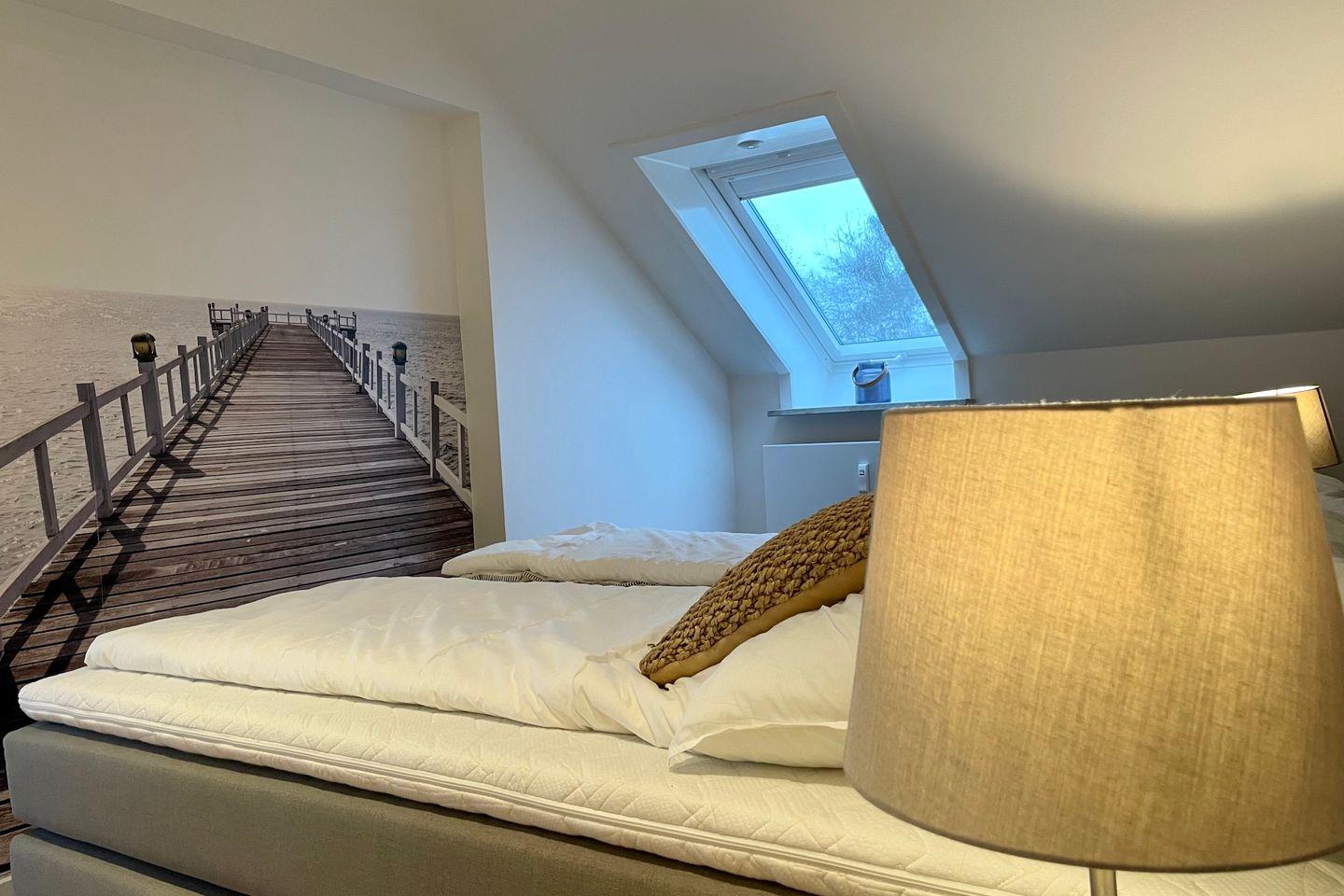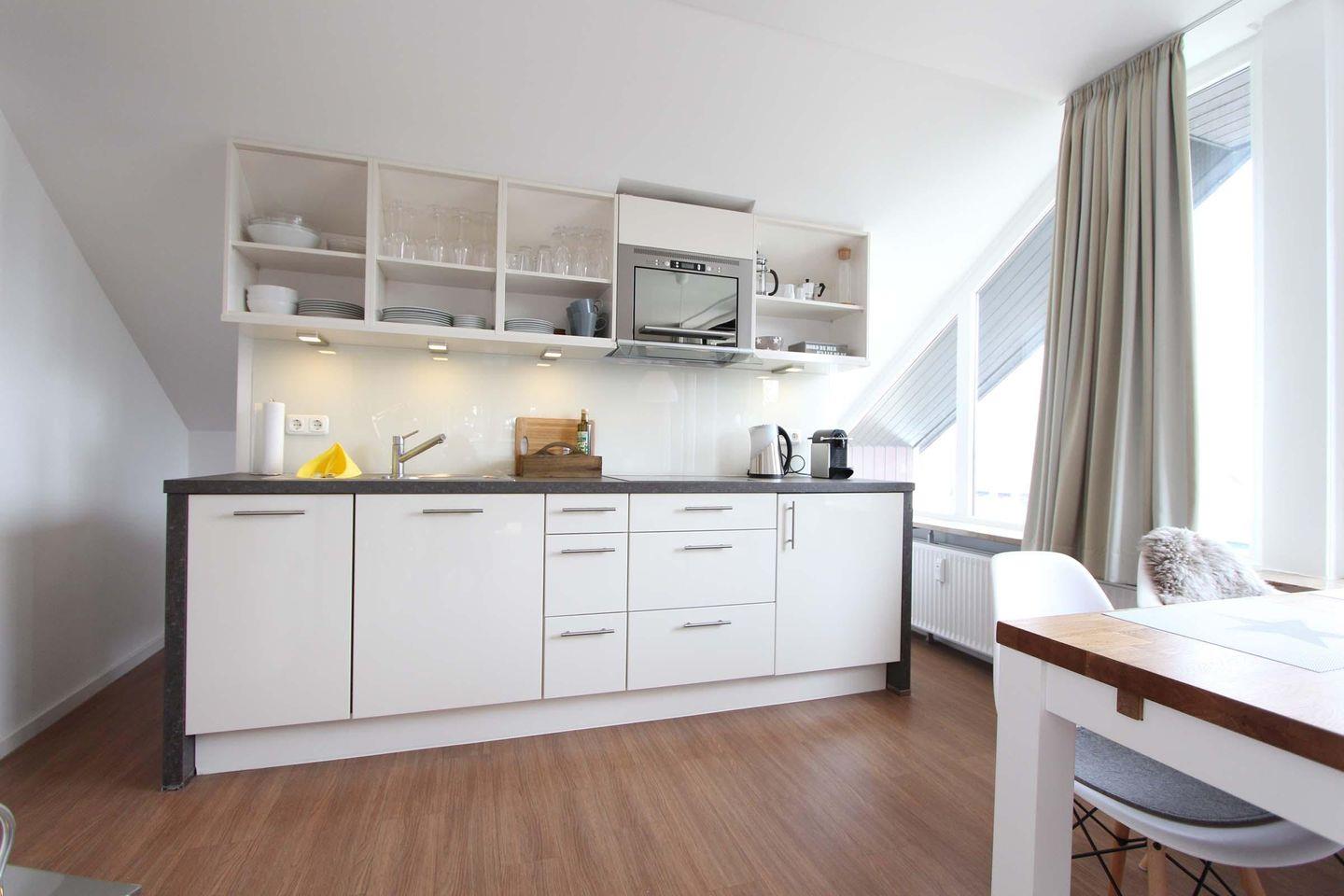 Maritimer Ostseeurlaub in der schönen Dachgeschosswohnung "Kiek ut". Maximal können hier 4 Personen den Urlaub genießen. Der großzügige Wohnbereich ist sehr hell, schick, maritim und stilvoll eingerichtet. Die gemütliche Sofaecke bietet Platz zum Erholen und Entspannen. Die Küche hat eine Mikrowelle, eine Geschirrspülmaschine und ein Gefrierfach im Kühlschrank, im Wohnbereich integriert ist die Küche schick, modern und stylisch gehalten. Der Essbereich ist am Fenster und bietet einen schönen Ausblick. Ebenso wie der dazugehörige Balkon. Das Elternschlafzimmer ist stilvoll, maritim eingerichtet mit einem hochwertigem Boxspringbett (durchgängiger Topper á 1,80x2,00m) außerdem gibt es noch zwei kleine charmant und verspielt eingerichtete Kinderzimmer mit Einzelbetten (0,90x2,00m). Das helle, schicke Duschbadezimmer ist ebenfalls neuwertig. In der Wohnanlage sind mehrere Extras enthalten, zum Beispiel ein Billiard- oder auch ein Tischtennistisch. Der Kellenhusener Sandstrand ist ca. 6 Gehminuten entfernt. Auch dem Urlaub mit dem Haustier steht generell nichts im Wege, denn nach Rücksprache und gegen Aufpreis ist ein Hund gestattet. Sollte das Reisegepäck so gering wie möglich ausfallen, dann ist ein Wäschepaket für den Aufenthalt in Kellenhusen gegen Gebühr einfach buchbar.